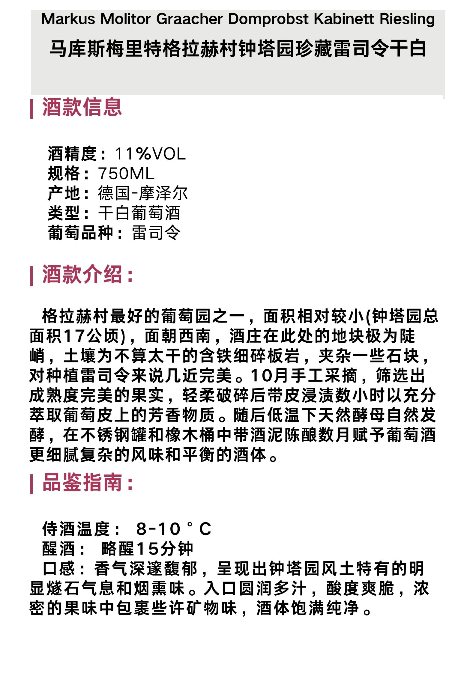 马库斯梅里特格拉赫村钟塔园珍藏雷司令⼲⽩葡萄酒 Markus Molitor Graacher Domprobst Kabinett Riesling
