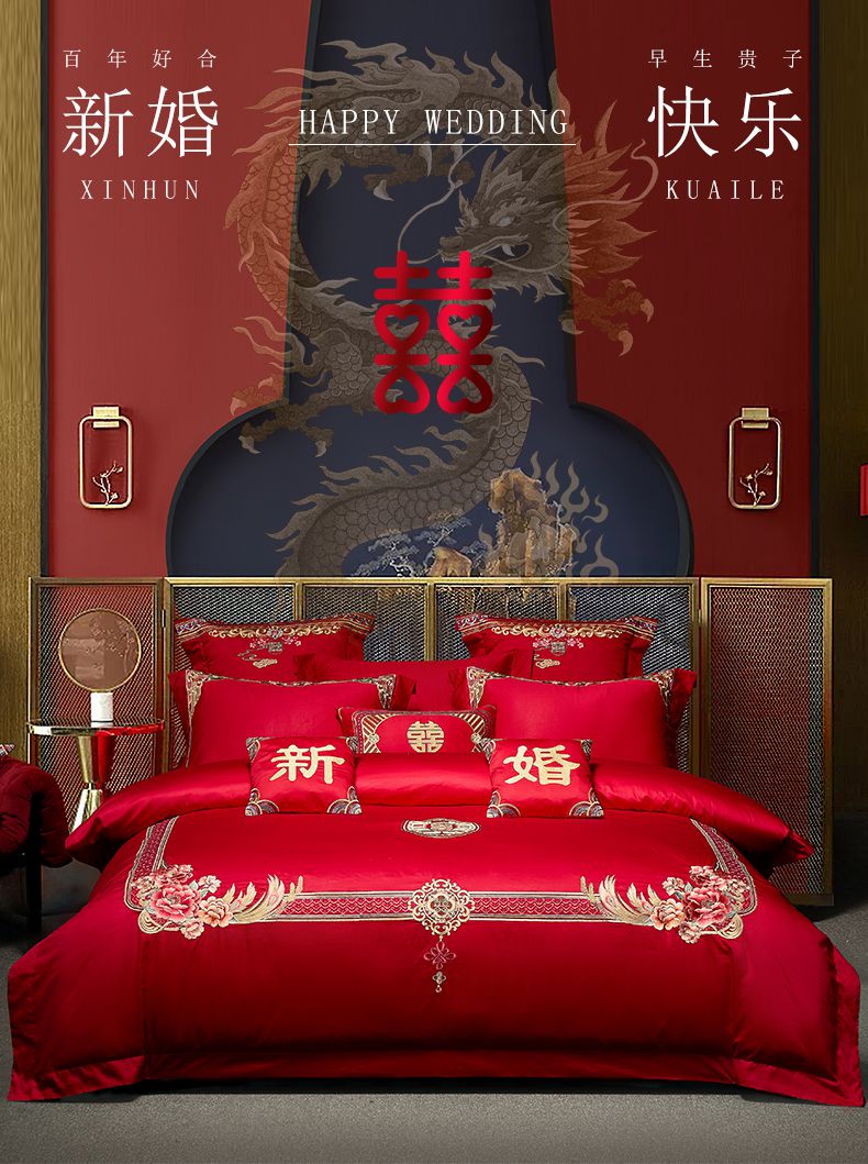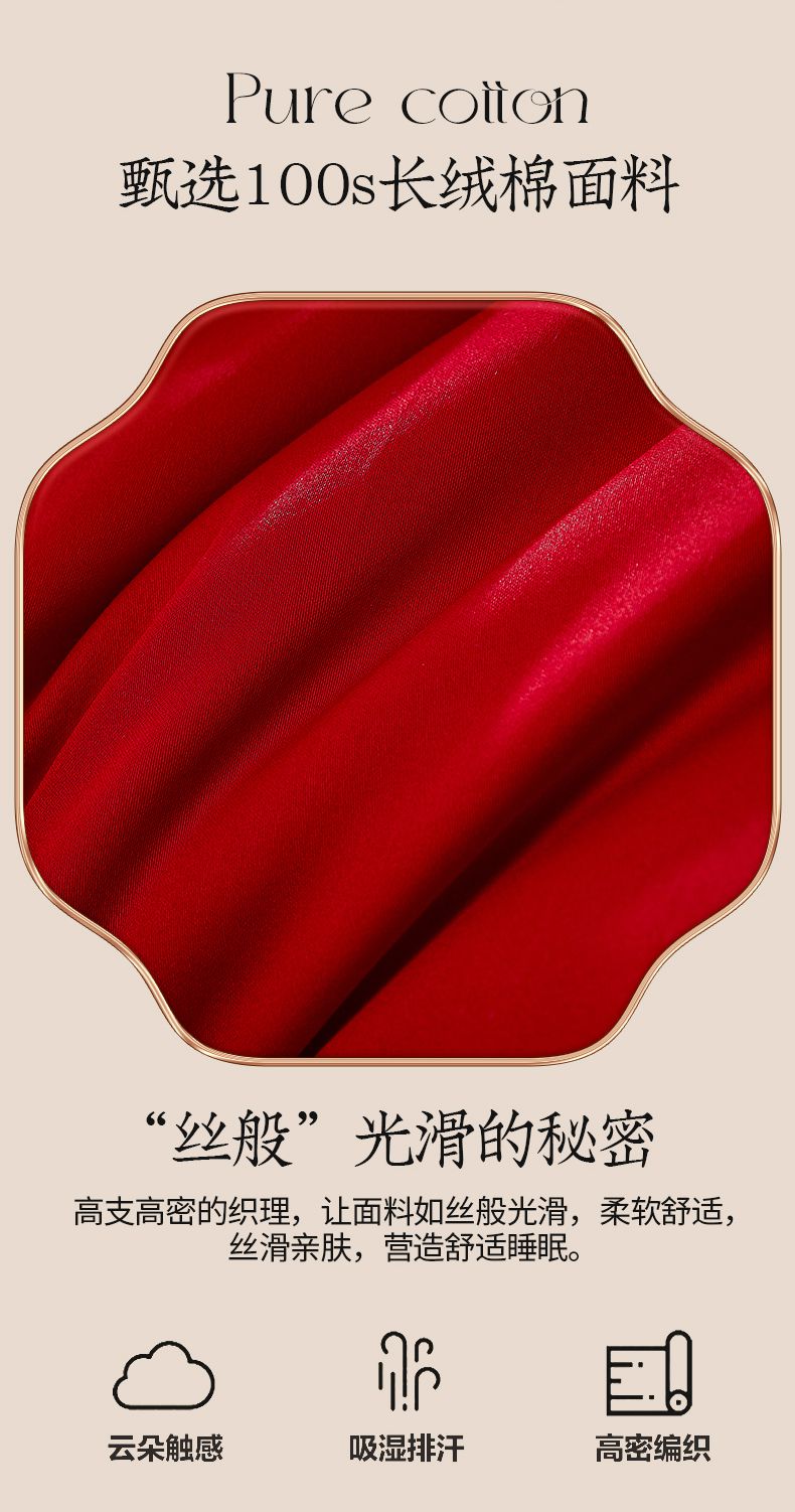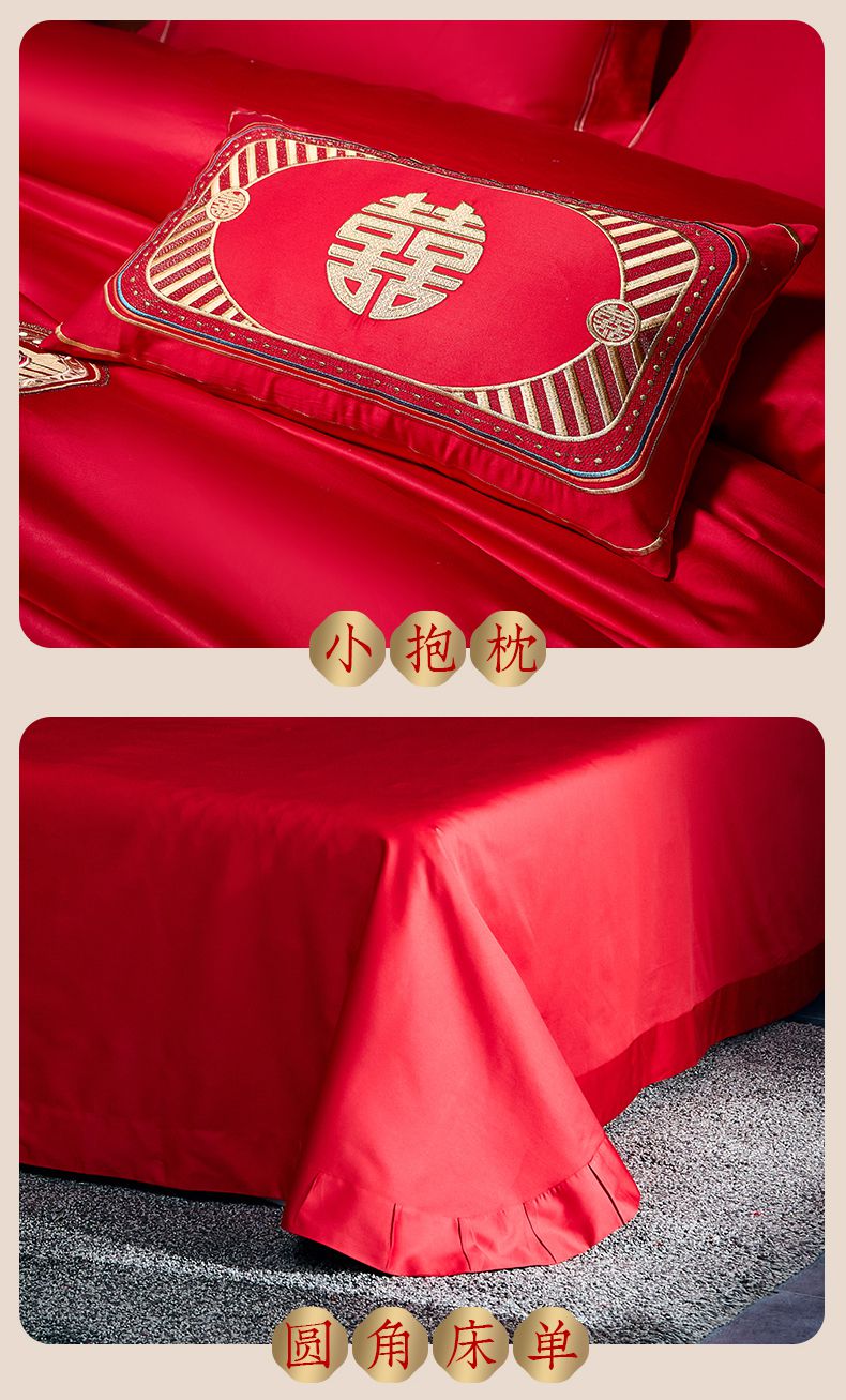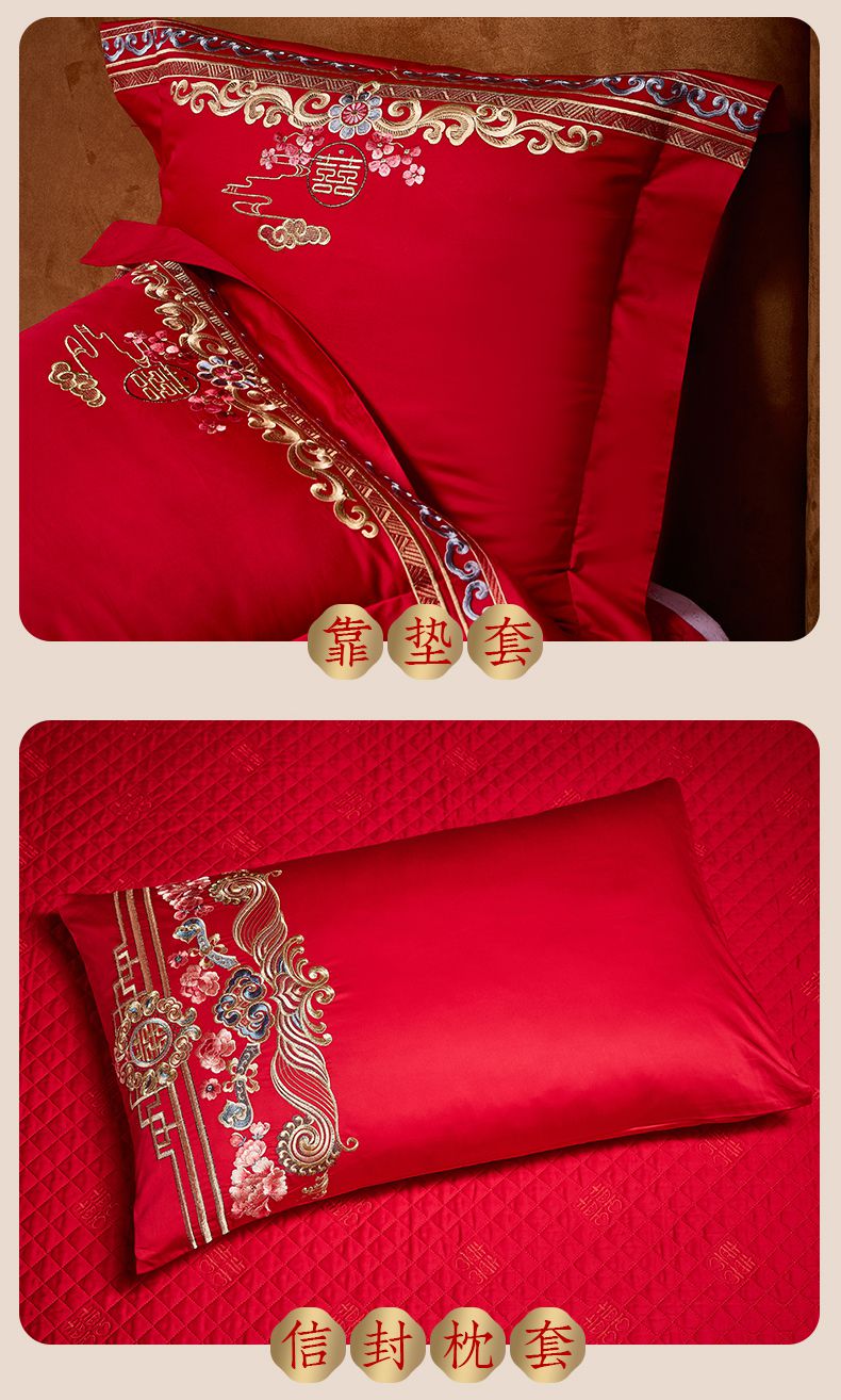 自然醒100支长绒棉四件套囍嫁系列高端刺绣婚庆四件套全棉结婚纯棉床单被套大红陪嫁婚房床品GDS