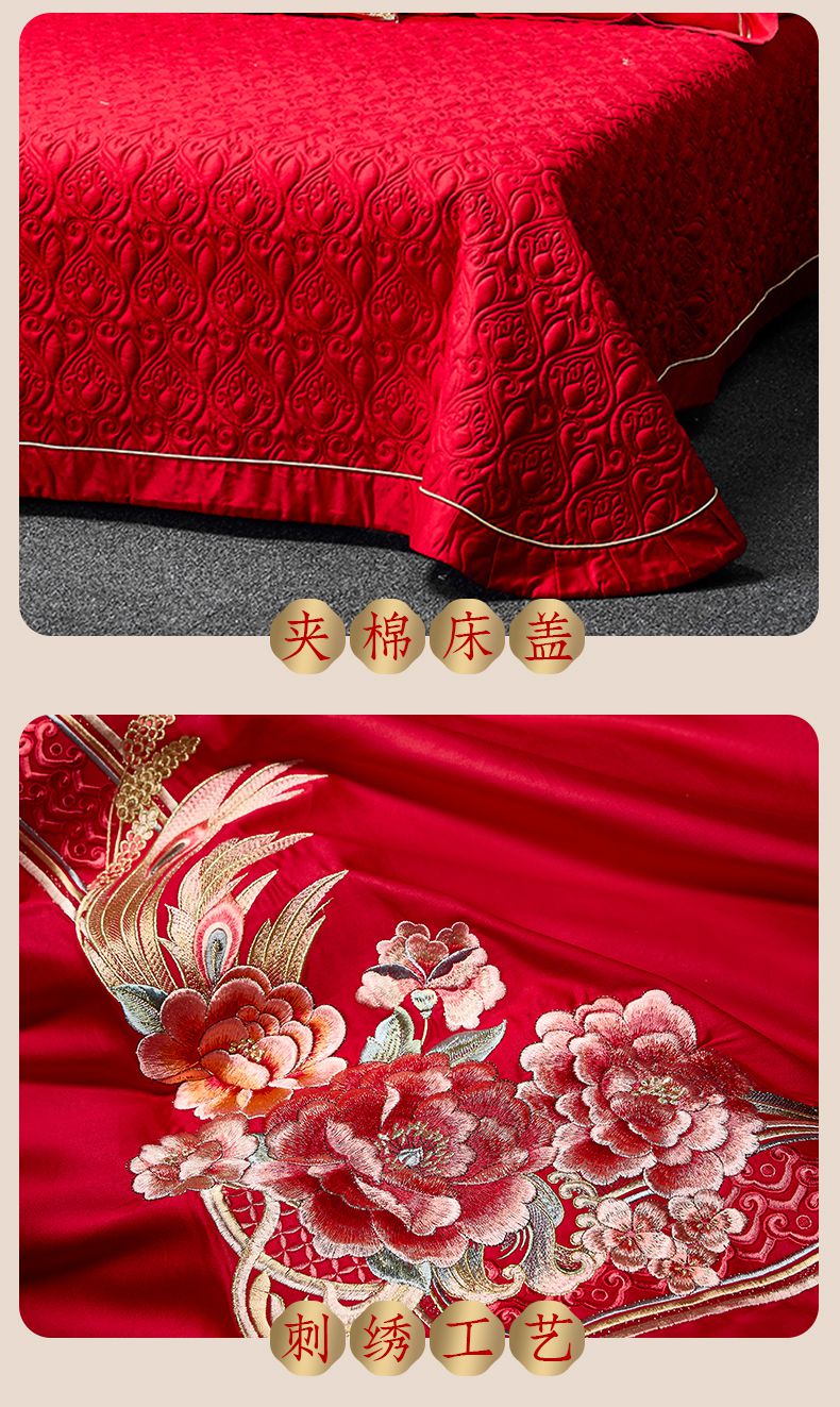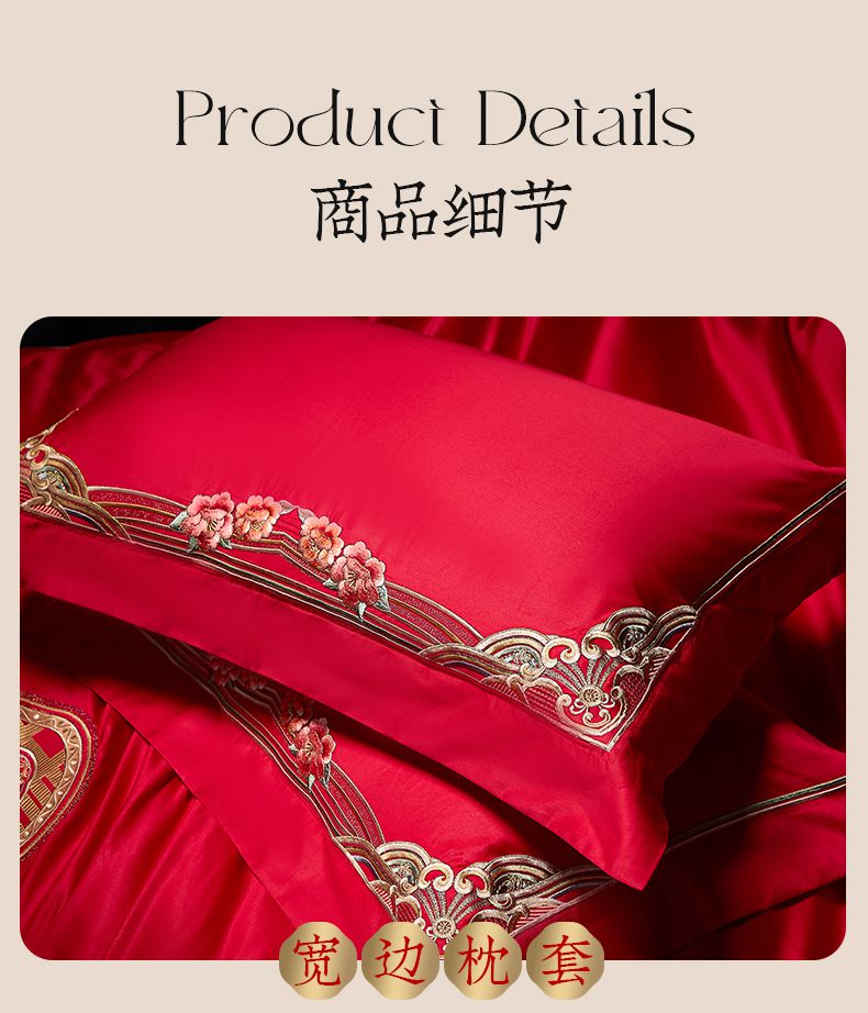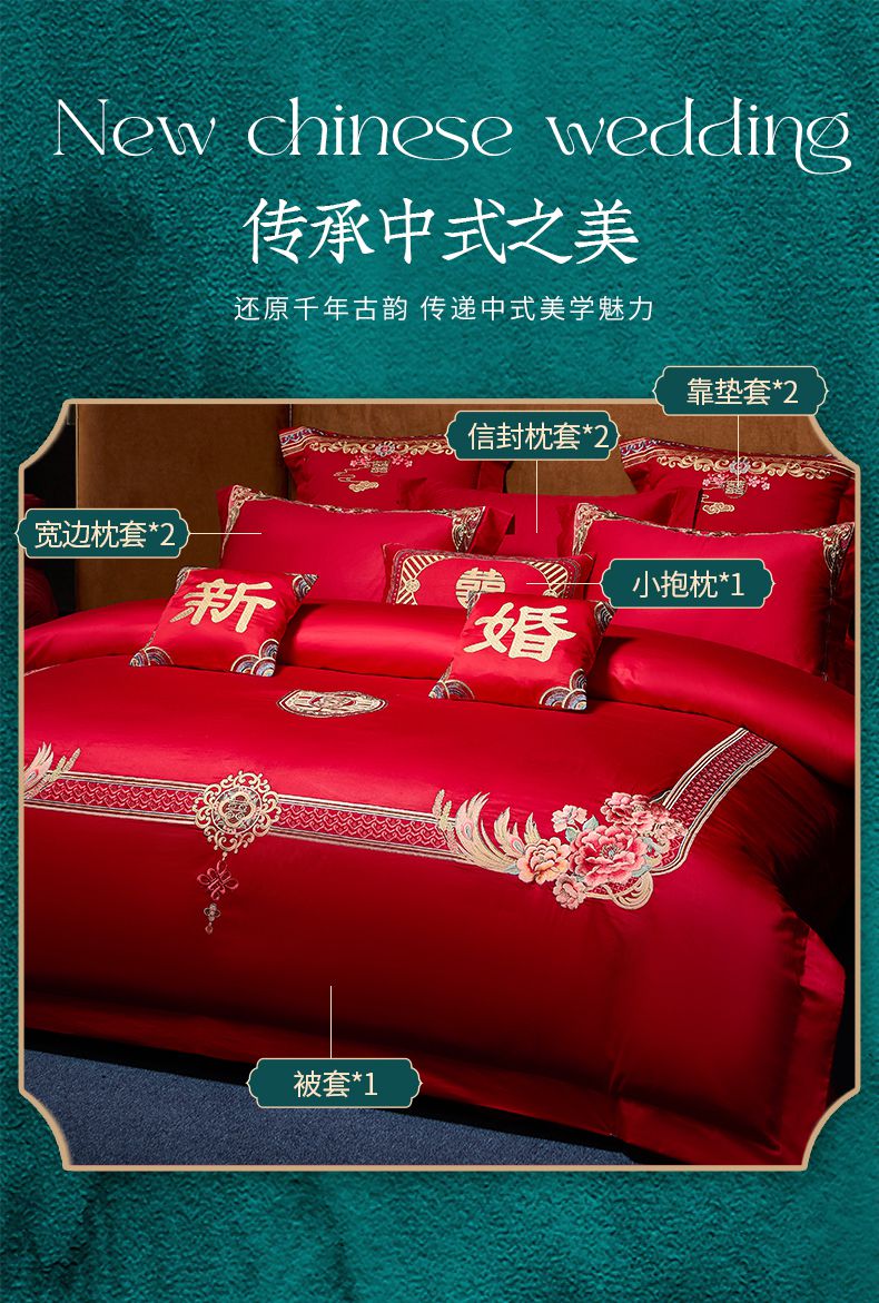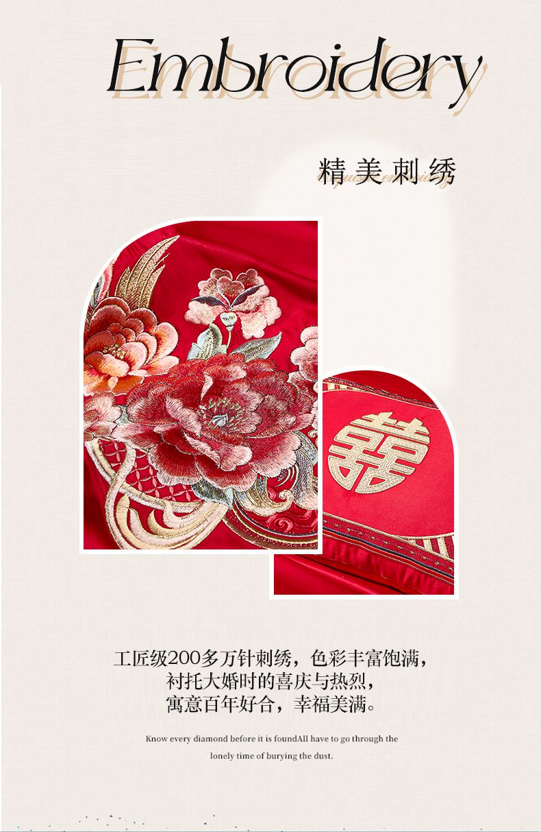 自然醒100支长绒棉四件套囍嫁系列高端刺绣婚庆四件套全棉结婚纯棉床单被套大红陪嫁婚房床品GDS