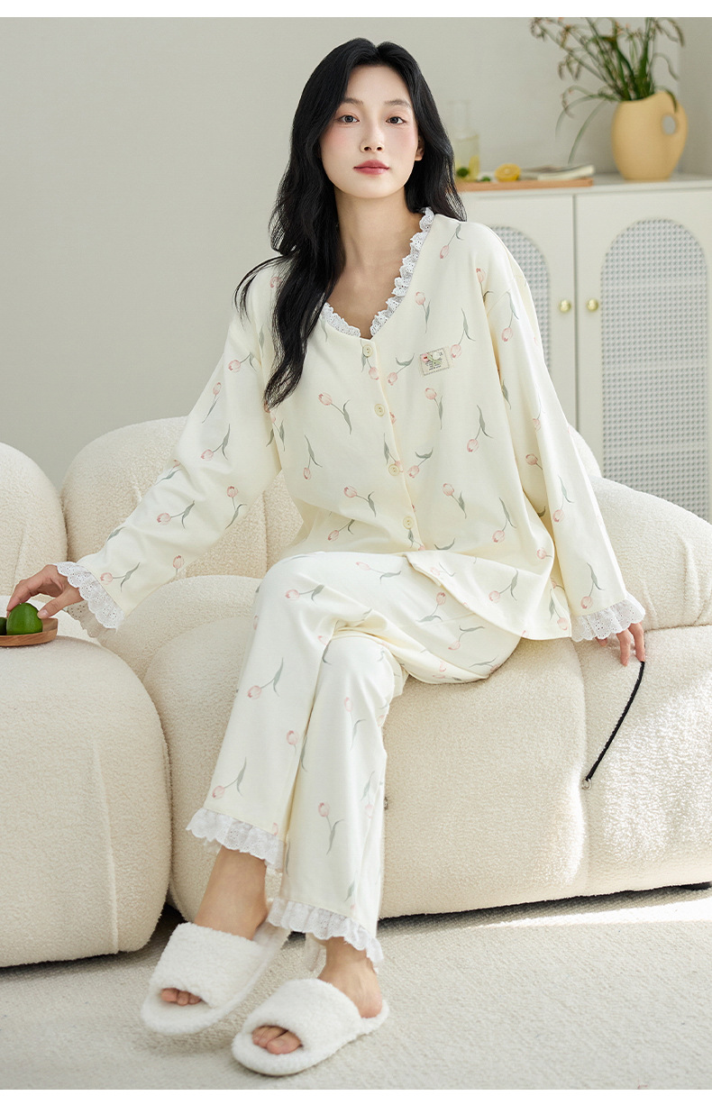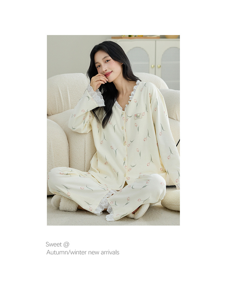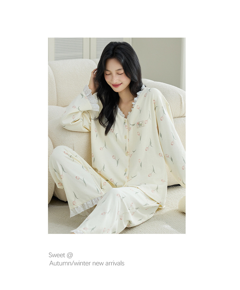 睡衣女春秋季开衫纯棉长袖长裤蕾丝甜美可爱可外穿女士家居服套装 商品图1