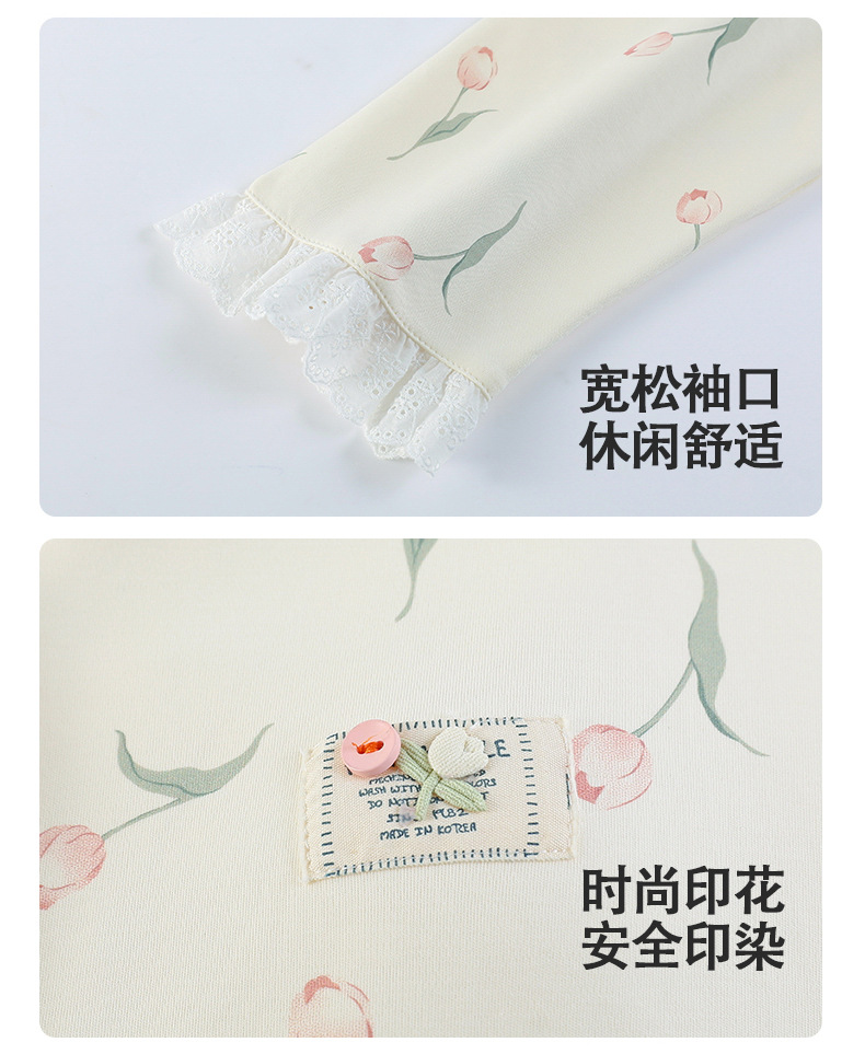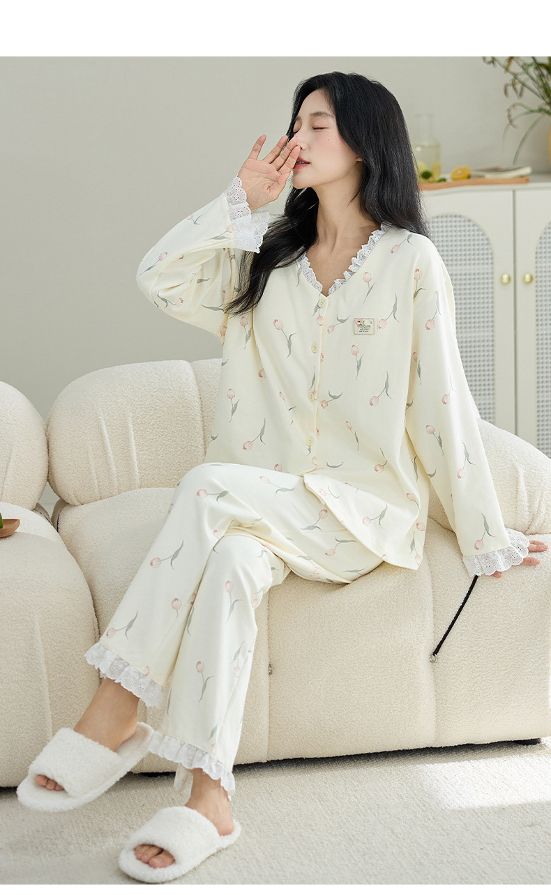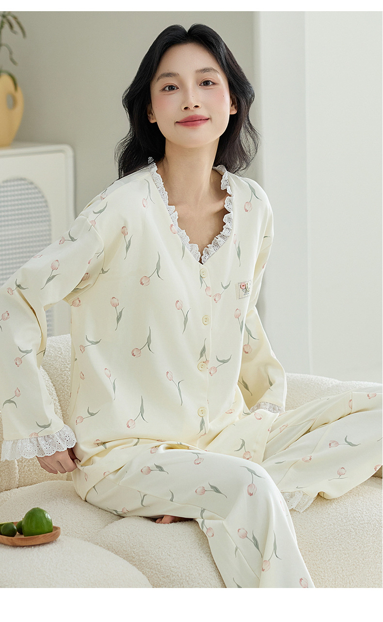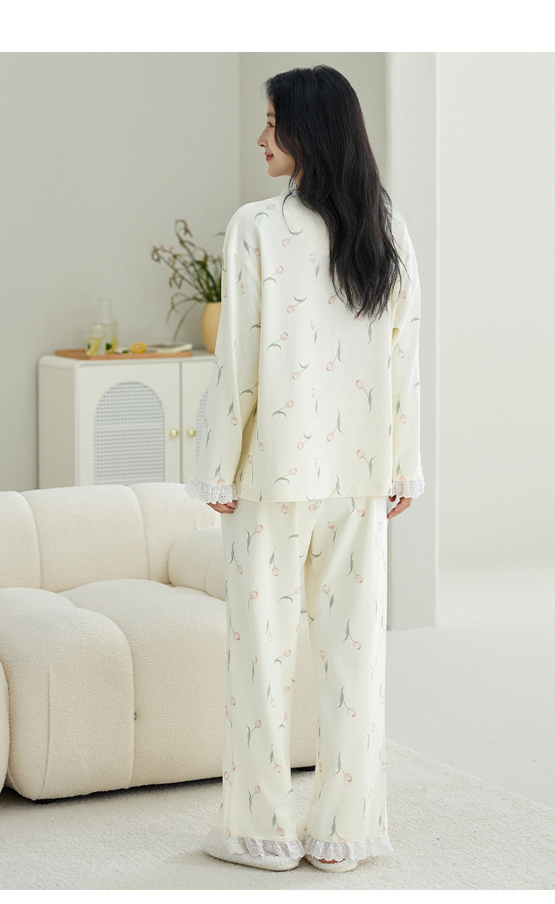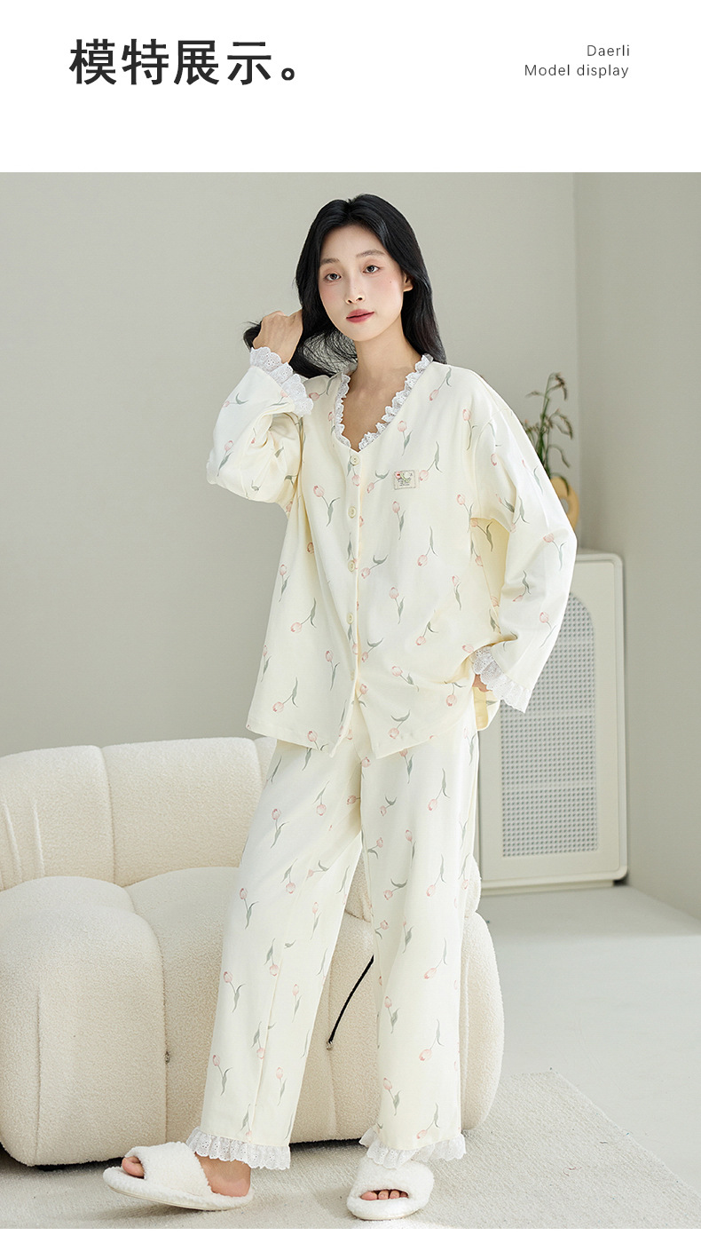 睡衣女春秋季开衫纯棉长袖长裤蕾丝甜美可爱可外穿女士家居服套装 商品图5
