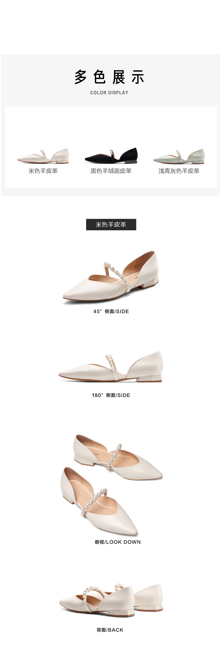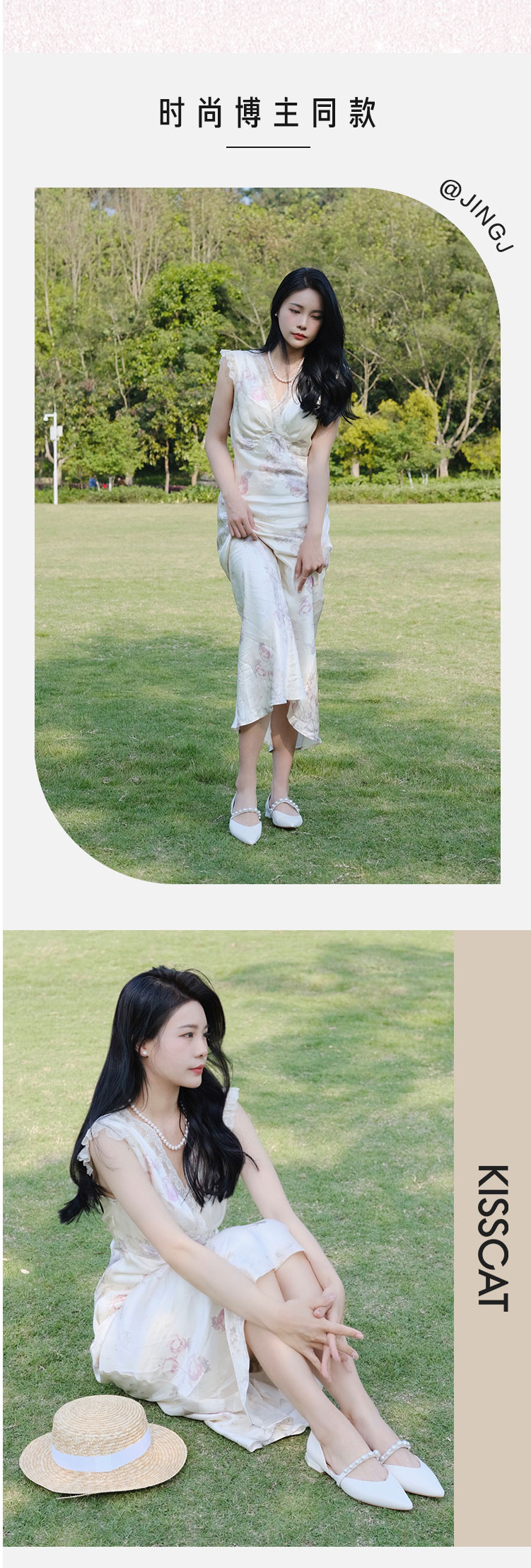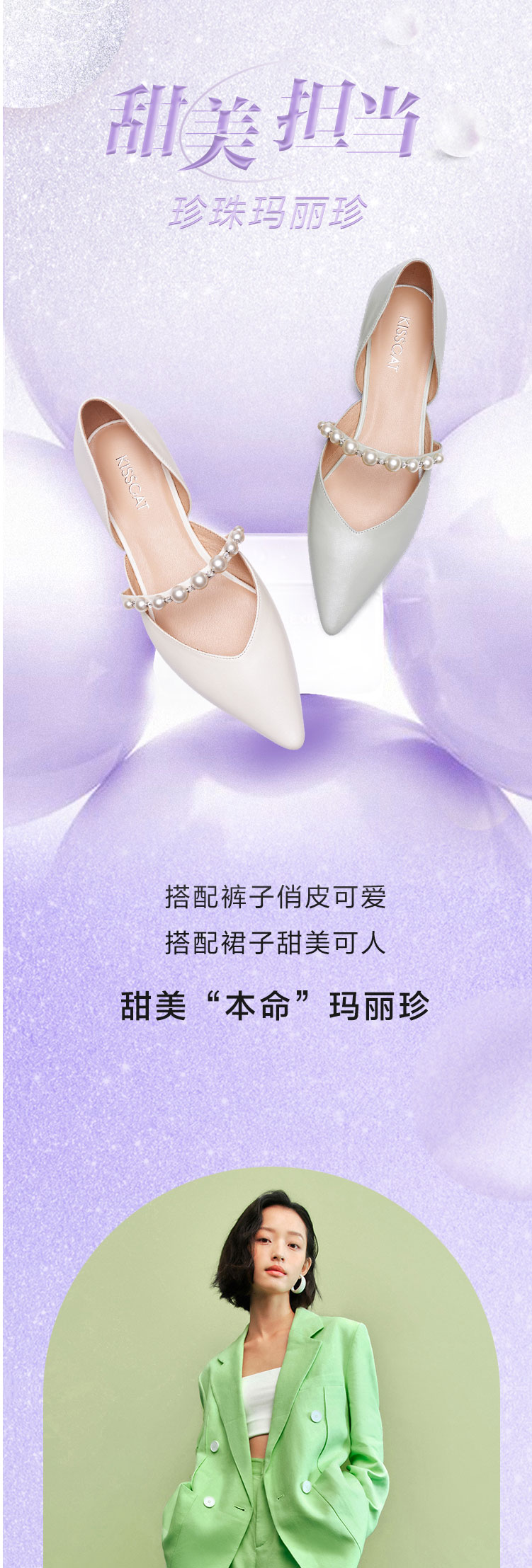 接吻猫女鞋2022春夏季新款甜美玛丽珍凉鞋气质珍珠尖头粗跟单鞋女32220-10