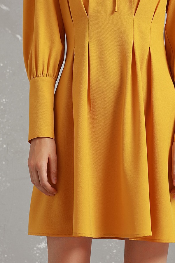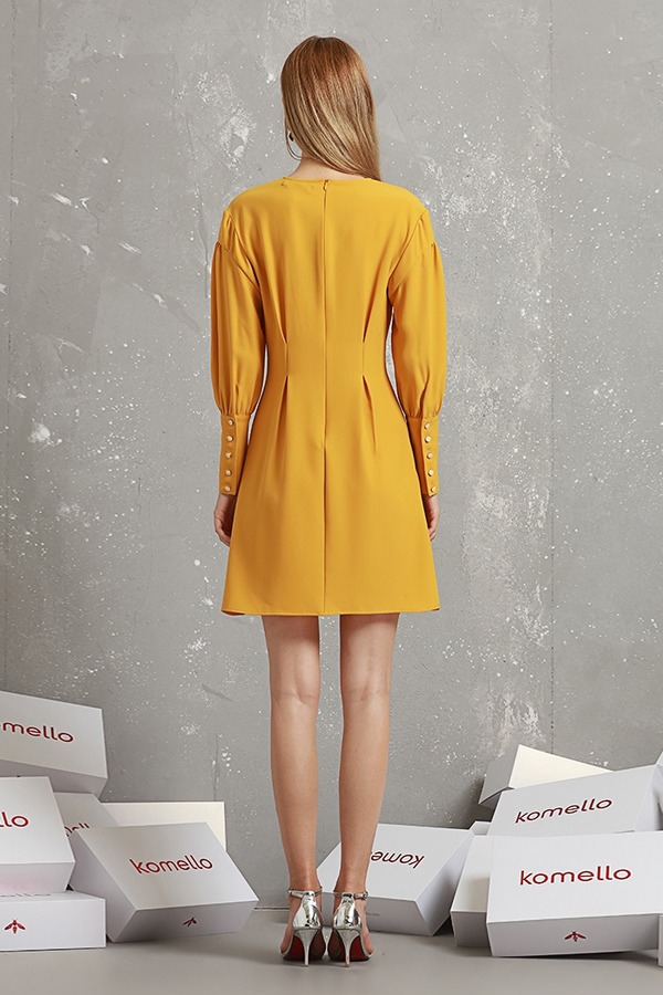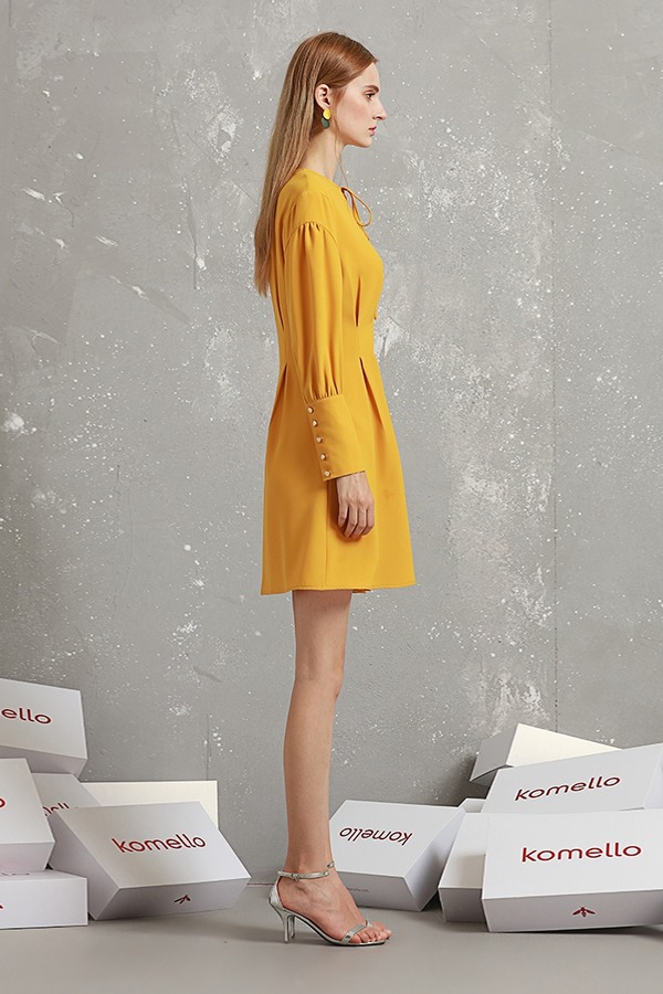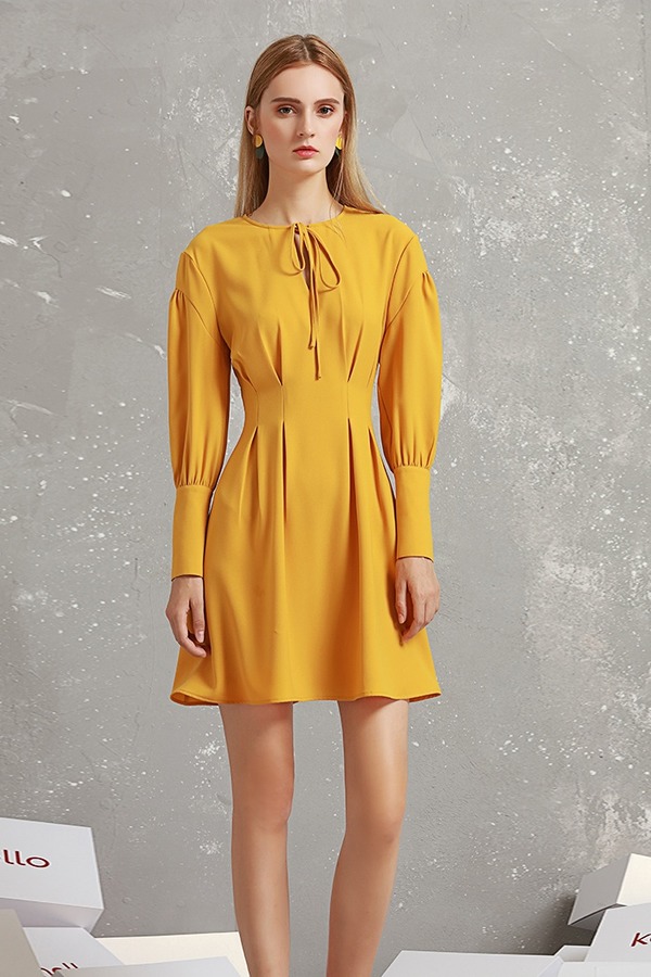 komello 黄色收褶灯笼袖连衣裙 14912