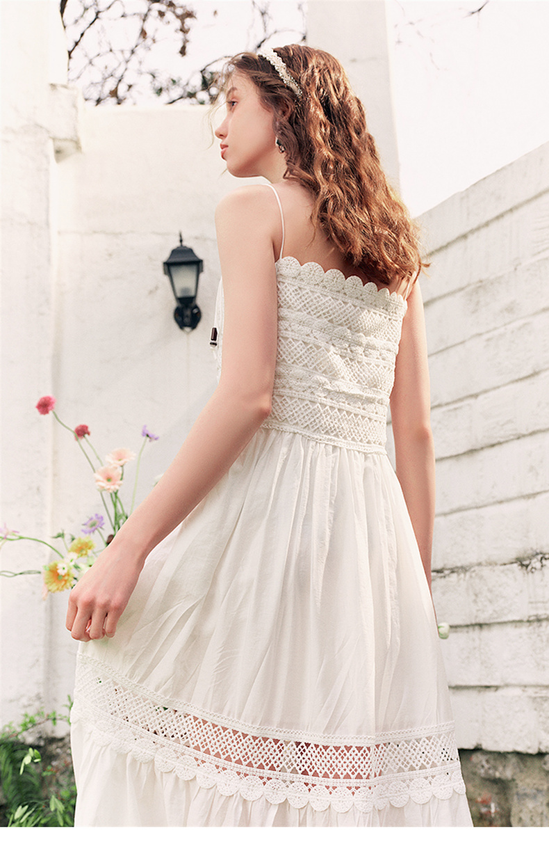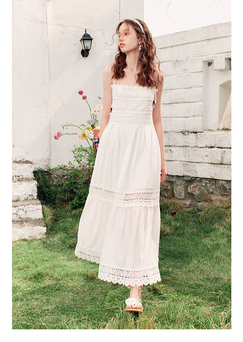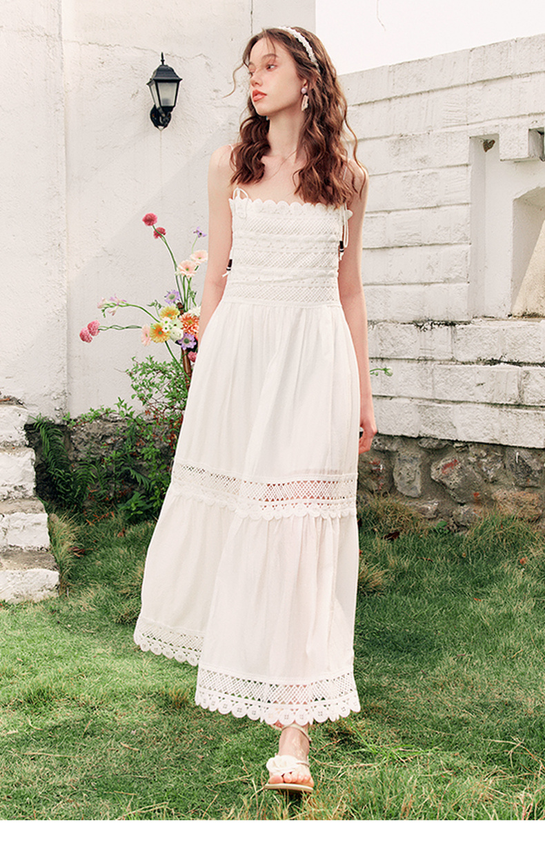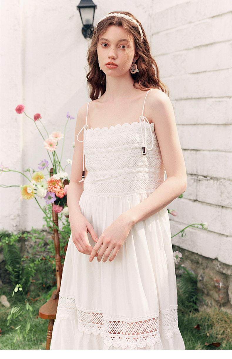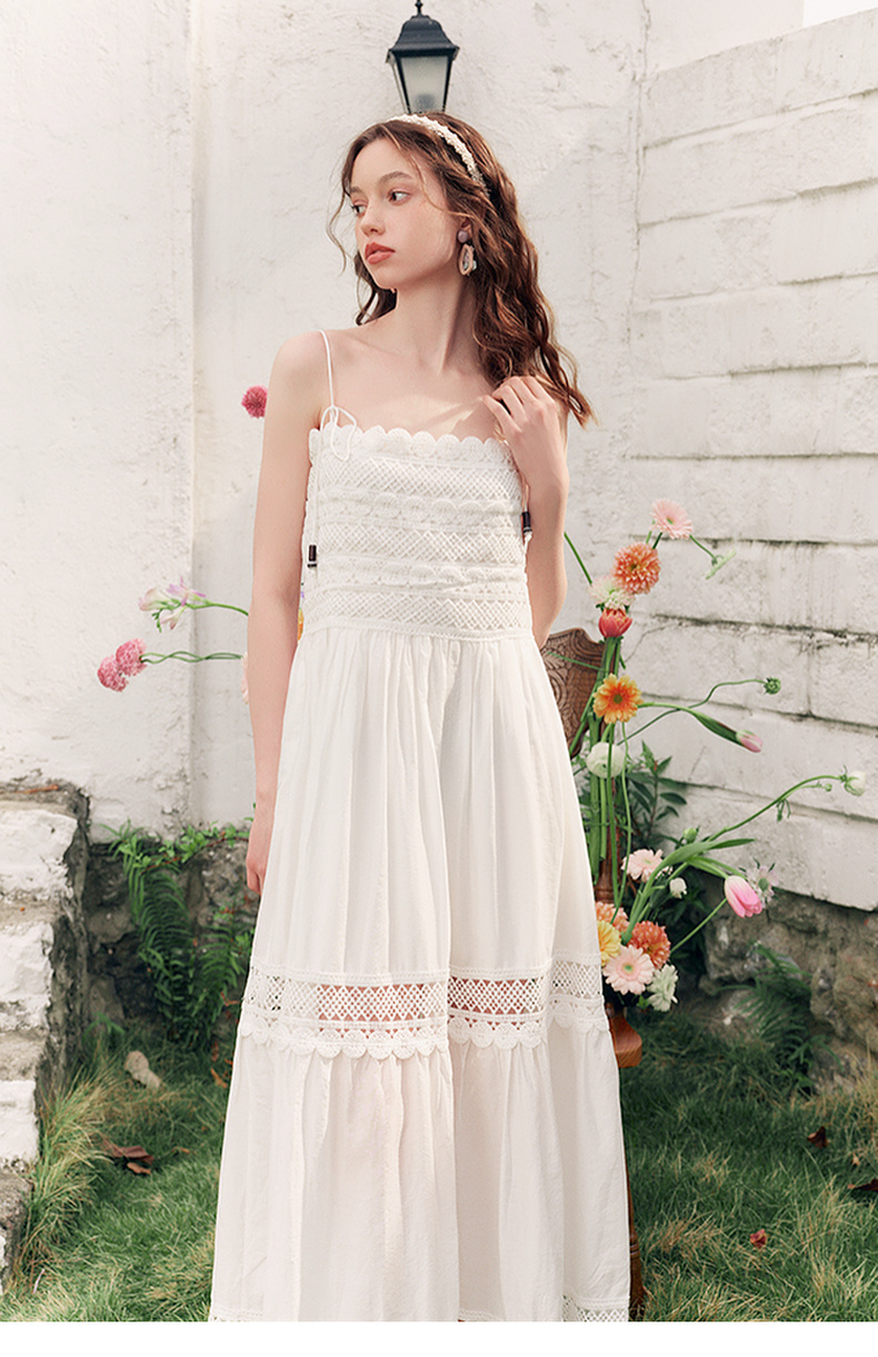 两三事缱绻白梨2025夏季新款度假风镂空勾花拼接白色吊带裙连衣裙