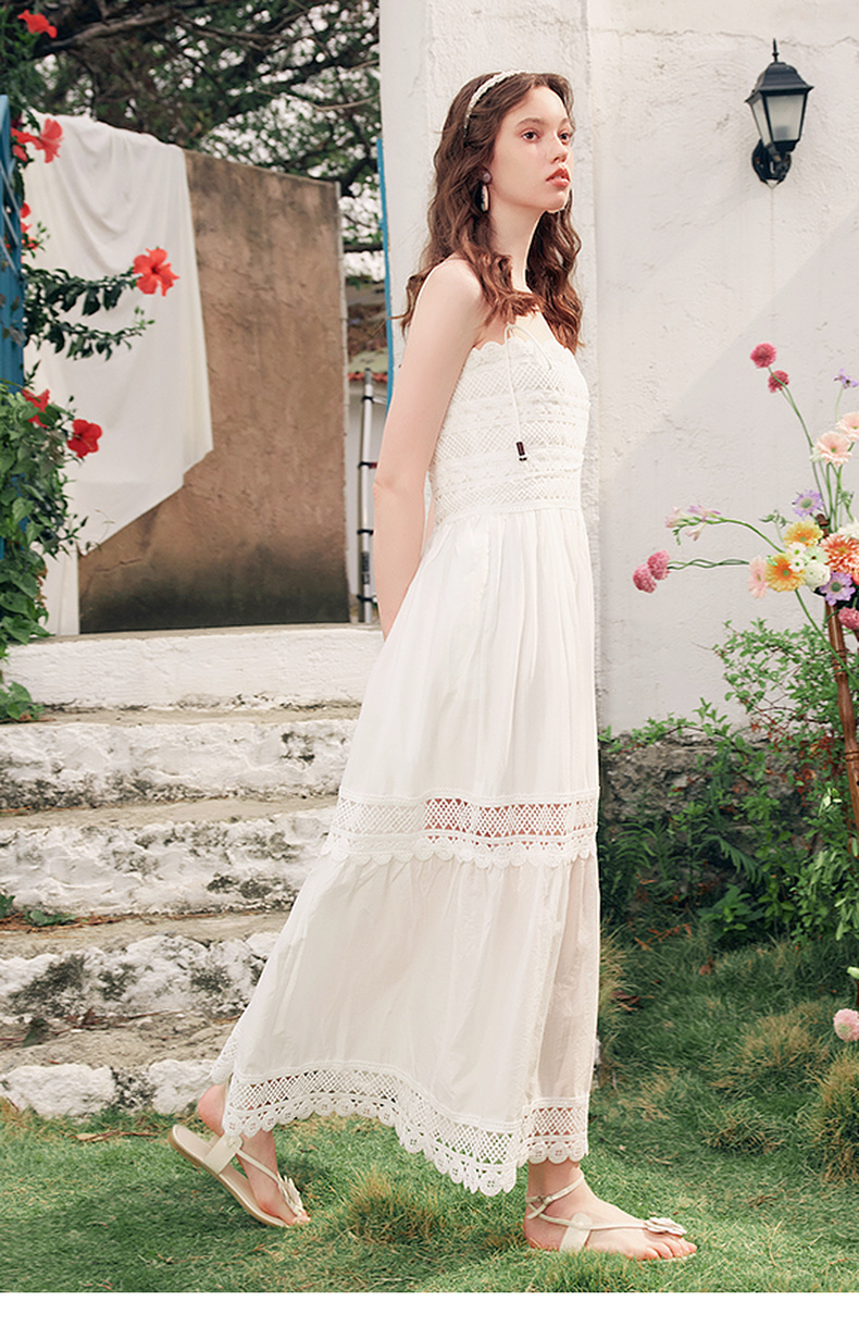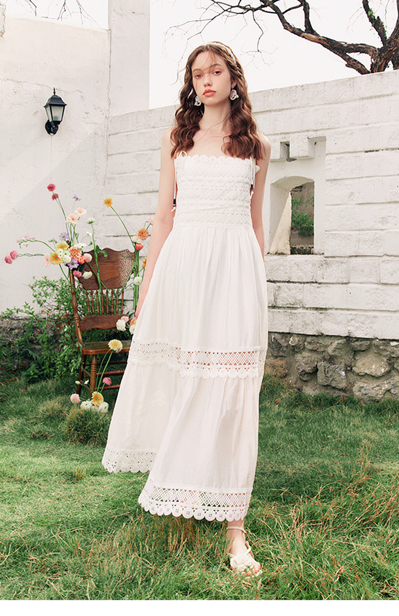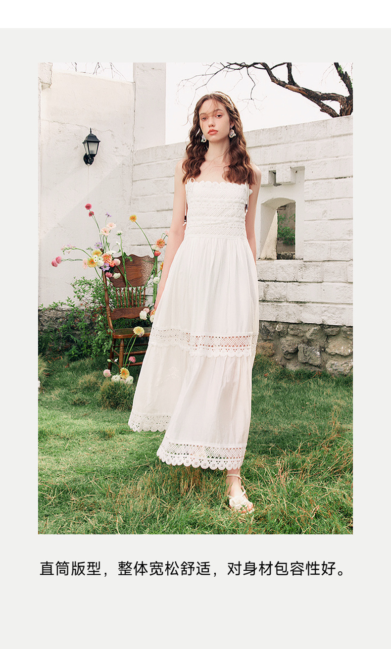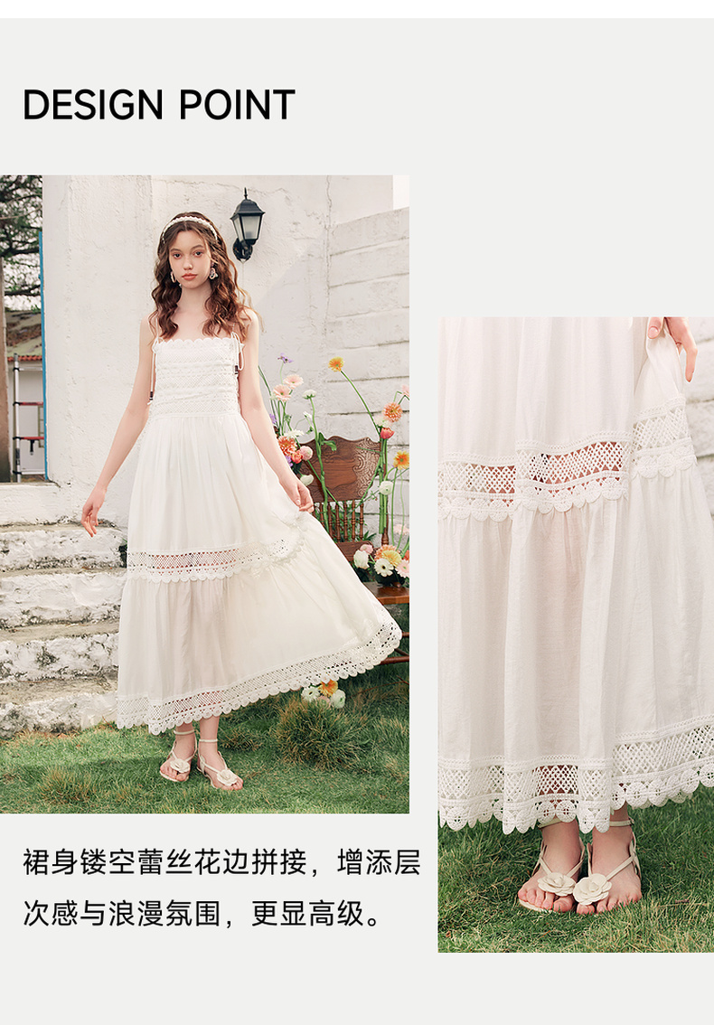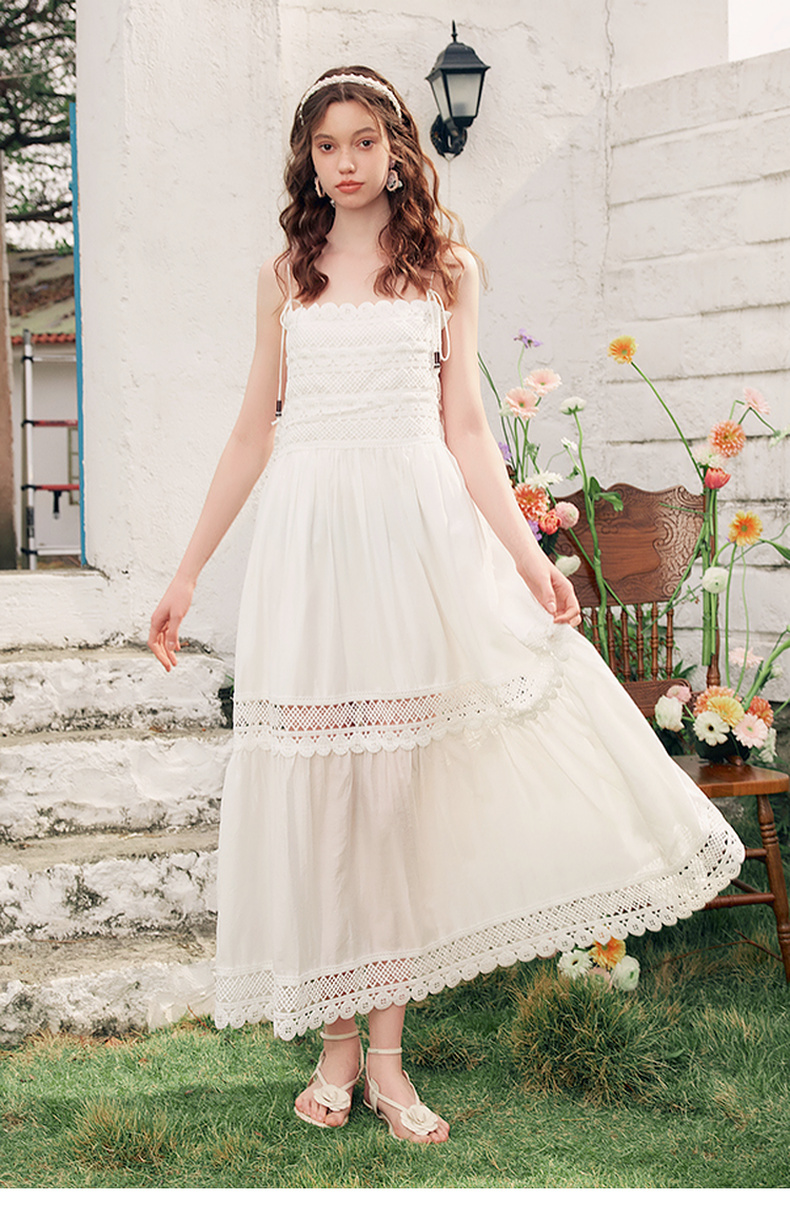 两三事缱绻白梨2025夏季新款度假风镂空勾花拼接白色吊带裙连衣裙