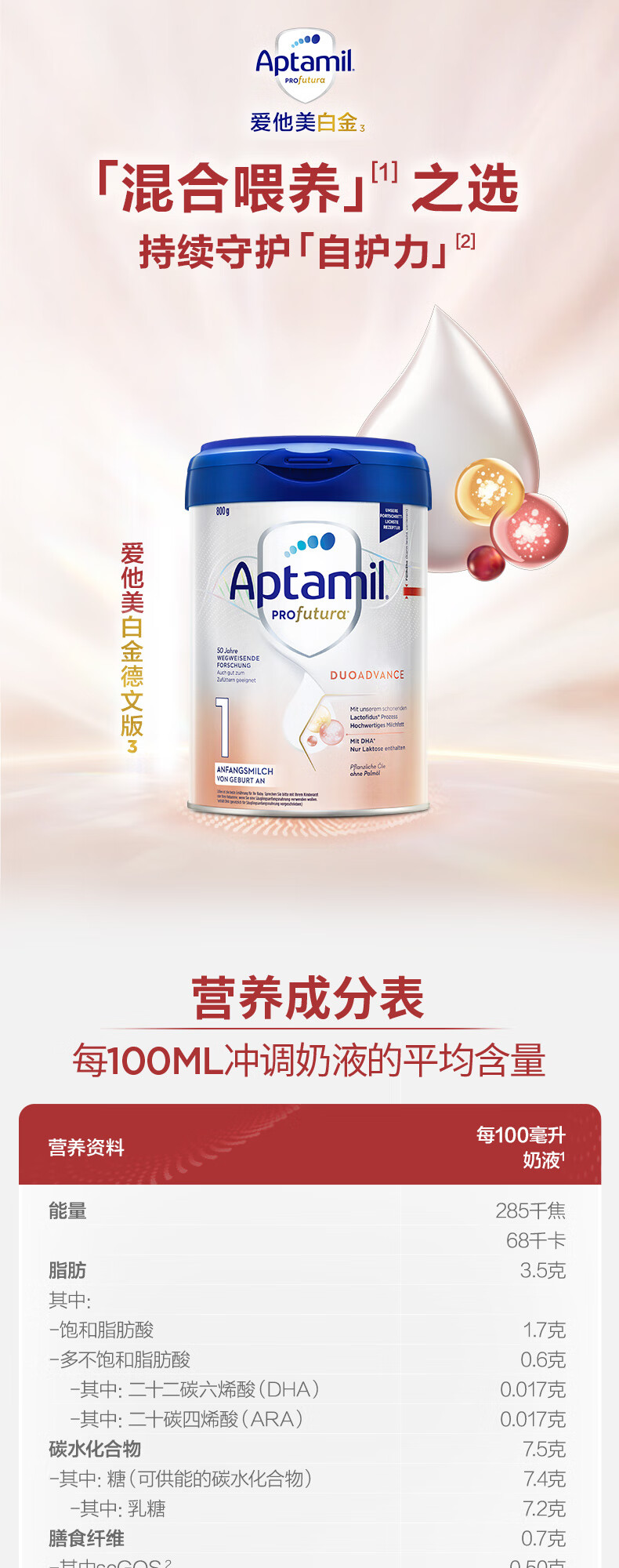 品名:德国爱他美(Aptamil)白金版婴儿配方奶粉1段800g(新包装)