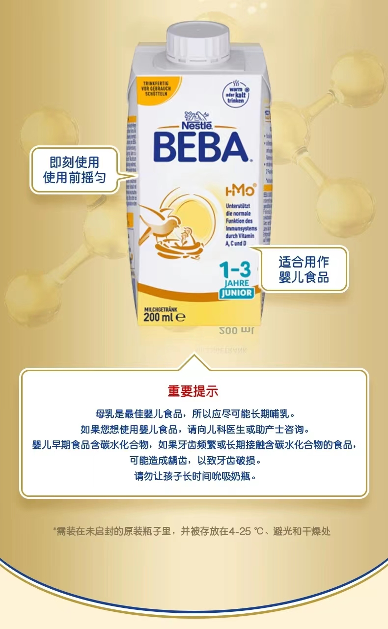 【系统升级中,微信下单优惠】 顺丰常温发货,跨境商品| 德国雀巢BEBA铂金版1+段水奶 (1-3岁)200ml