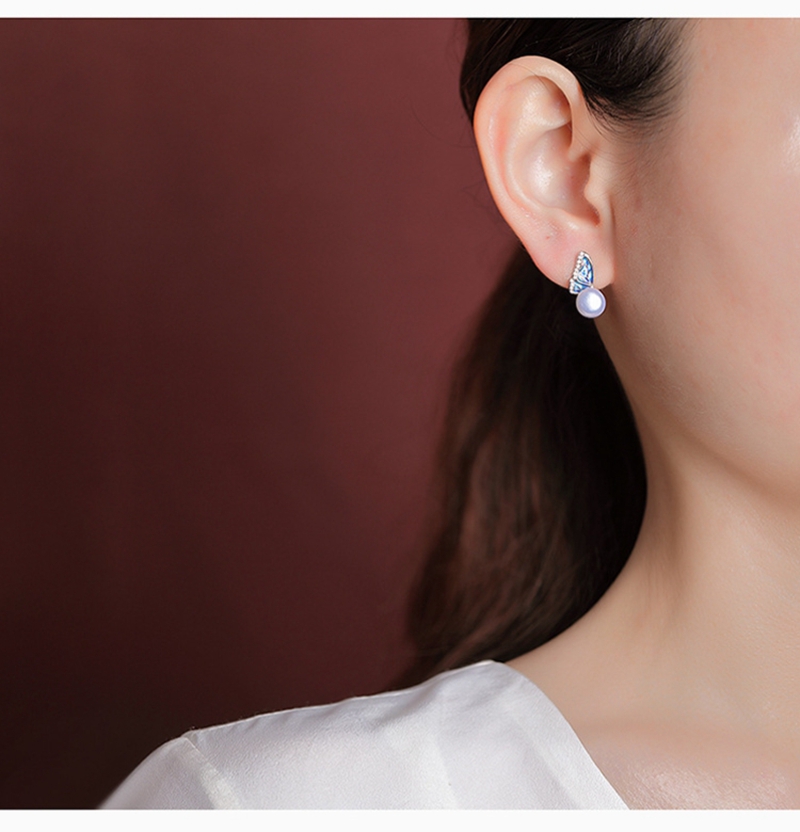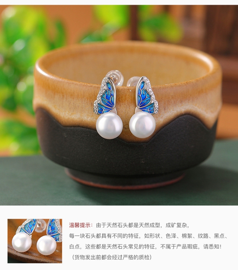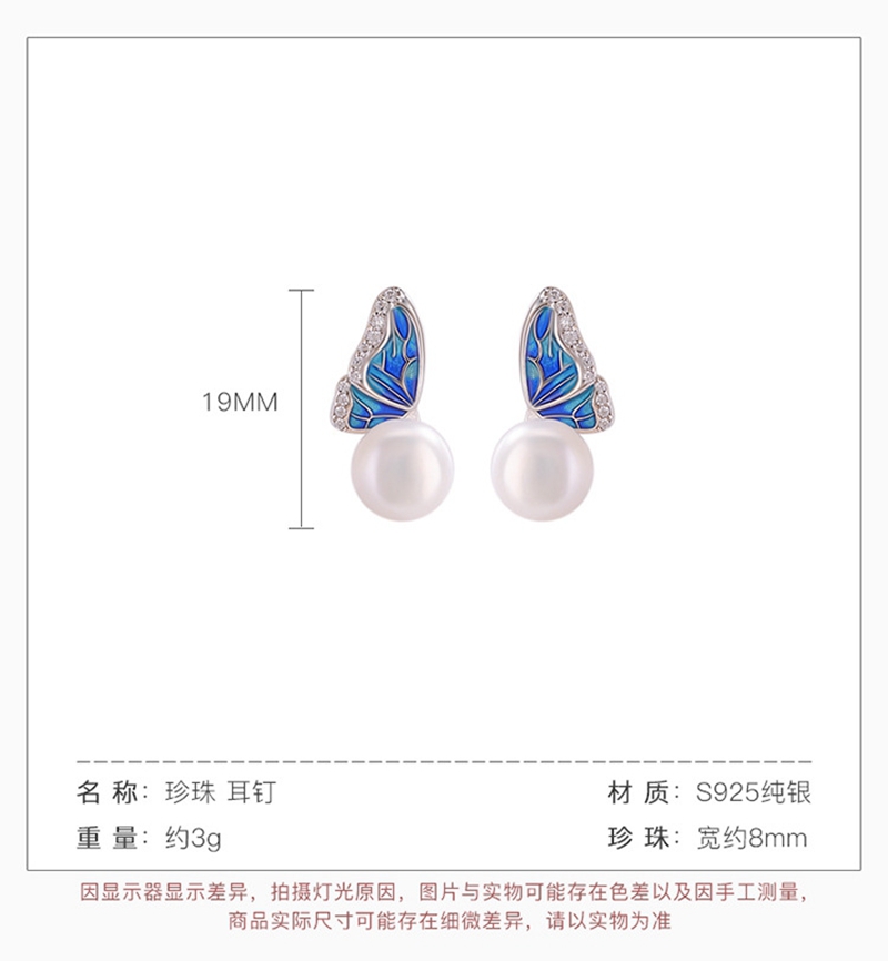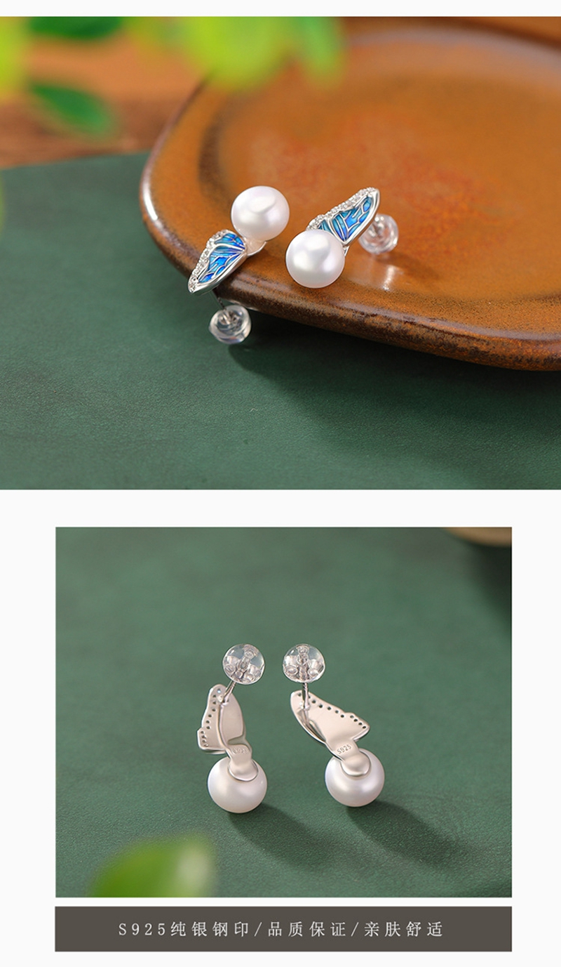 S925纯银淡水珍珠渐变珐琅蝴蝶圆珠耳钉