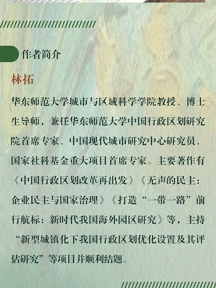 林拓,华东师范大学资源与环境科学院城市与区域经济系、中国现代城市研究中心教授、博士生导师。兼任中共中央编译局中国现实问题研究中心副主任,国家行政学院领导考评研究中心特聘专家。上海曙光学者、教育部新世纪优秀人才。主要著作有《中国行政区划改革再出发》《无声的民主:企业民主与国家治理》《打造“一带一路”前行航标:新时代我国海外园区研究》等,主持“新型城镇化下我国行政区划优化设置及其评估研究”等项目并顺利结题。