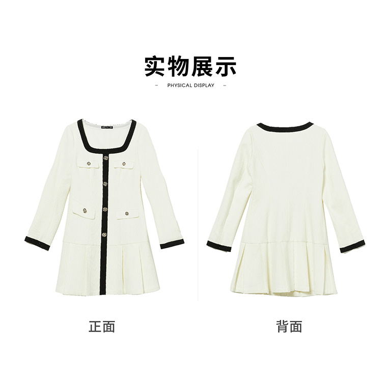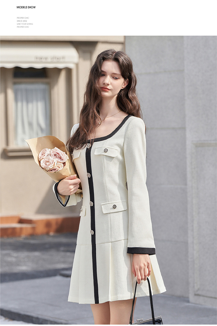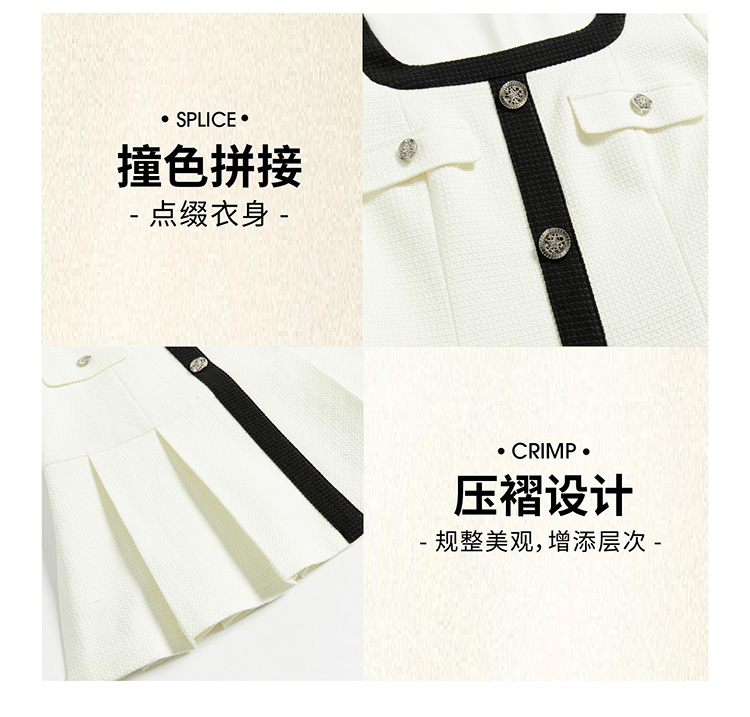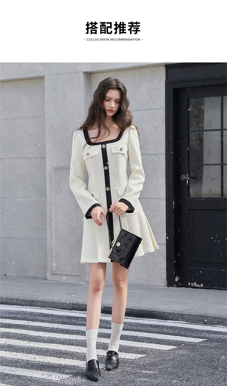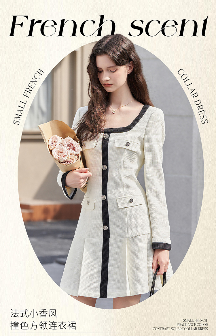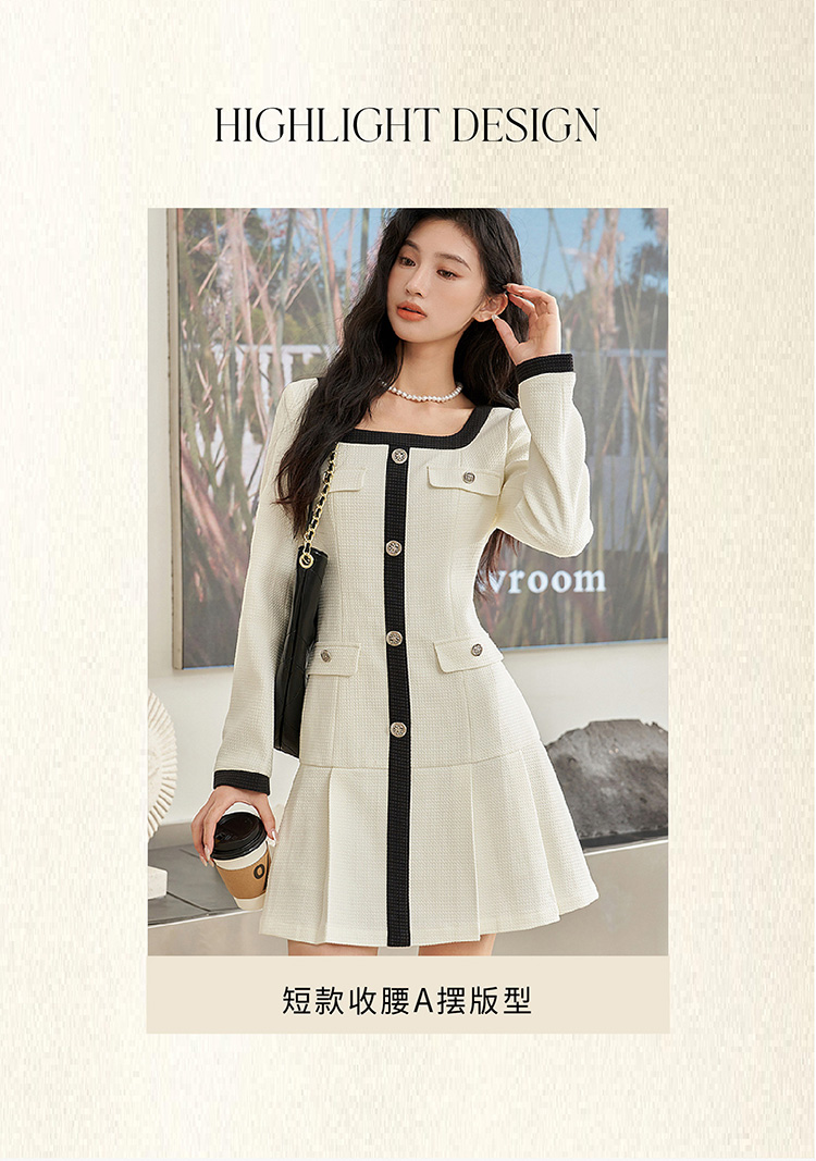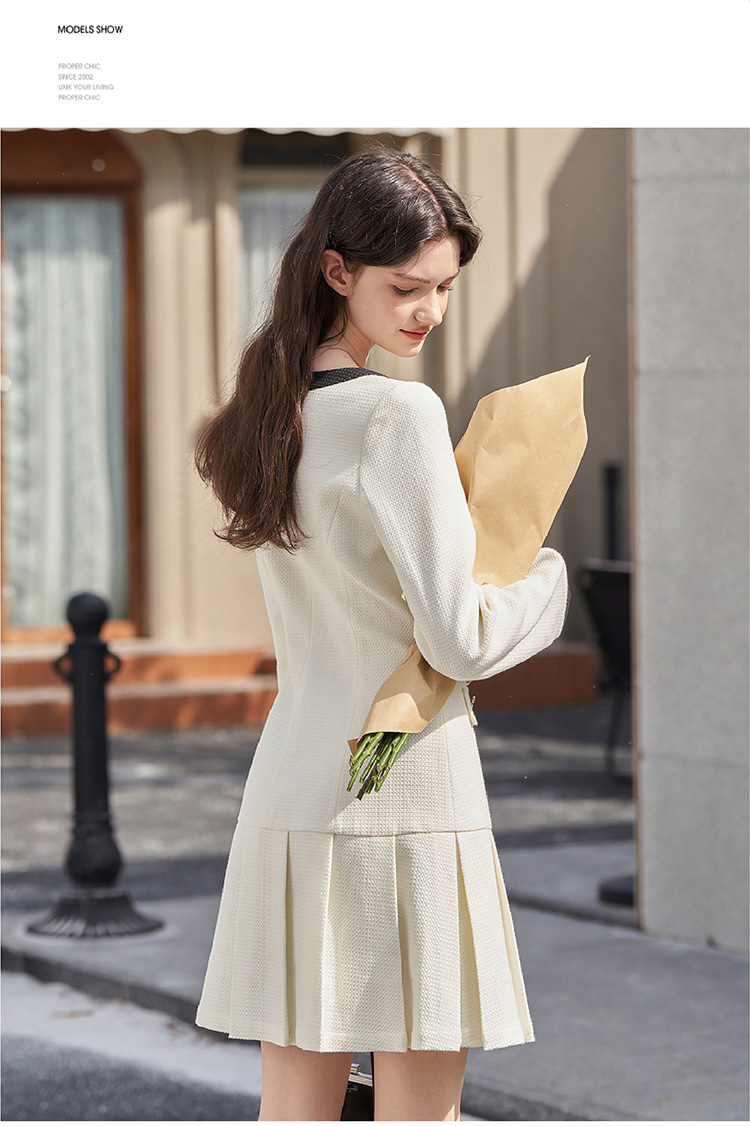 法式小香风米白色连衣裙秋冬新款气质小个子百褶短裙V2138567