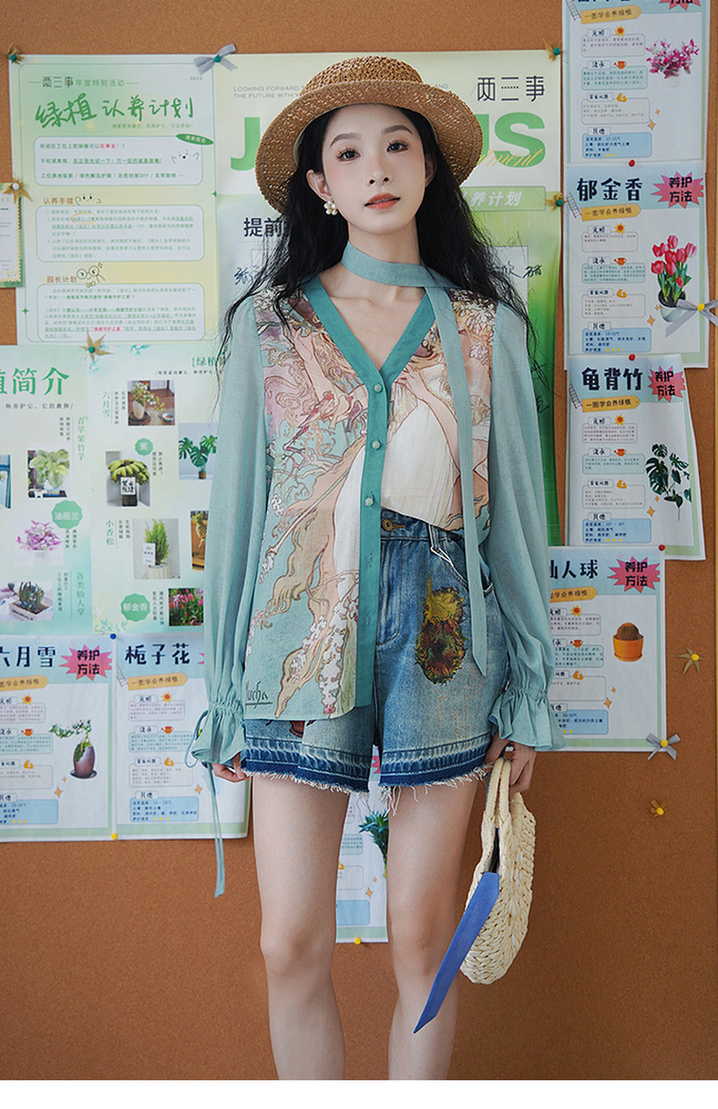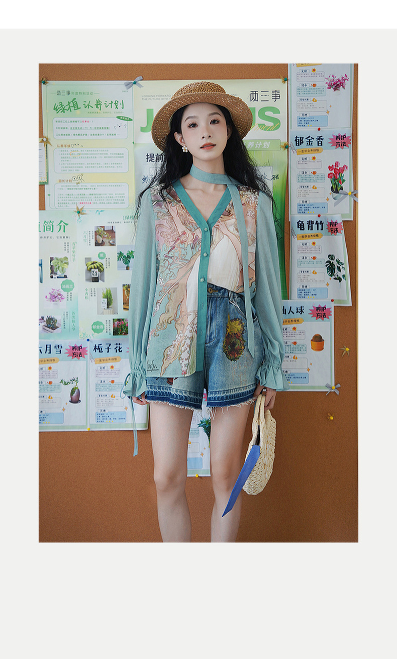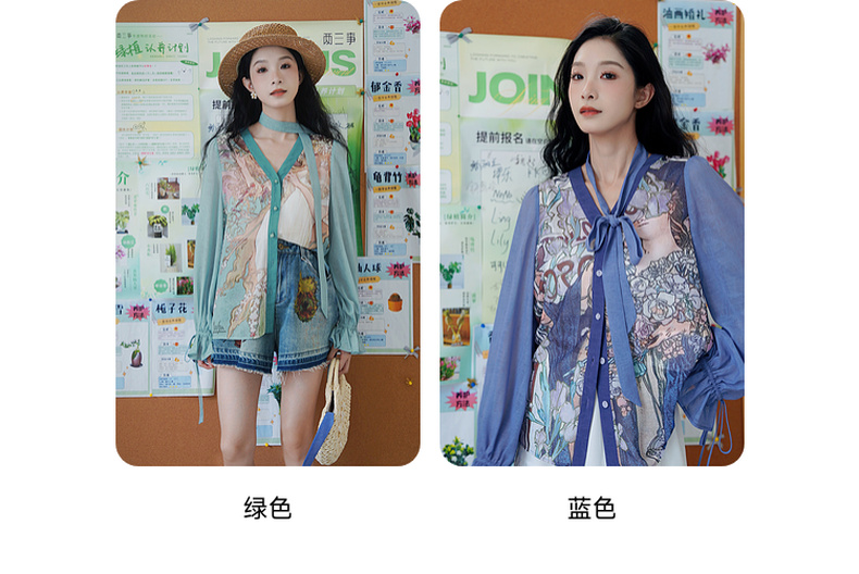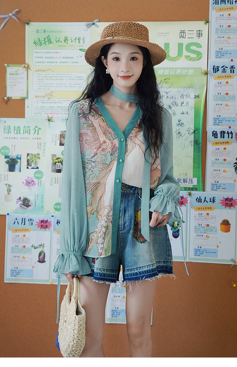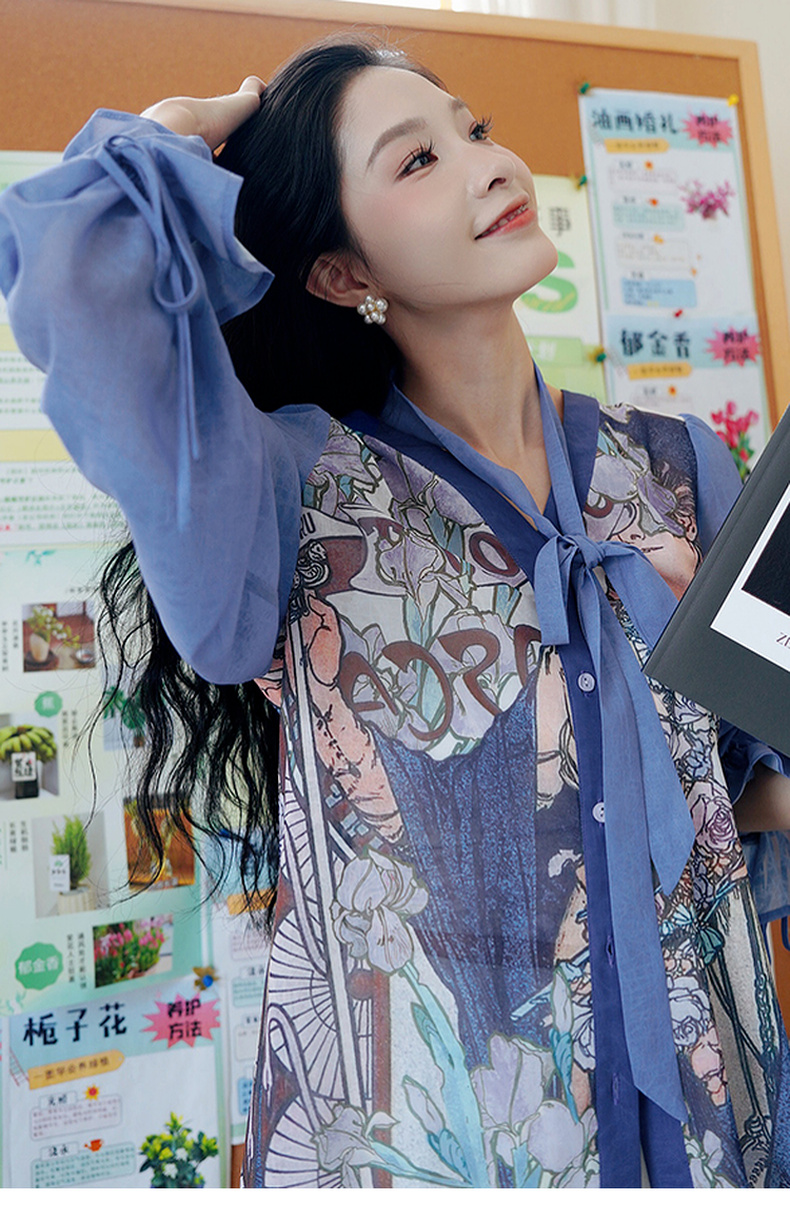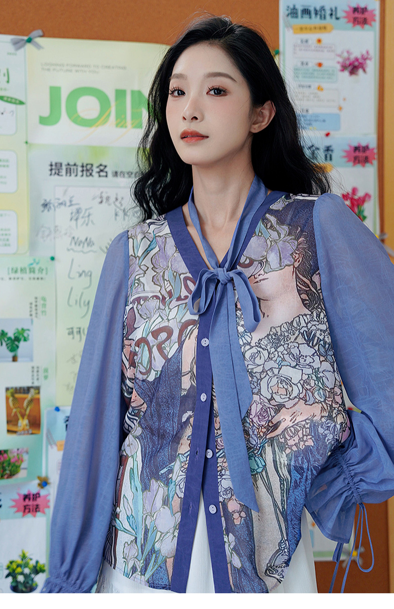 两三事蓝调梦境2025夏季新款森女风印花布拼接绑带薄款衬衫女宽松