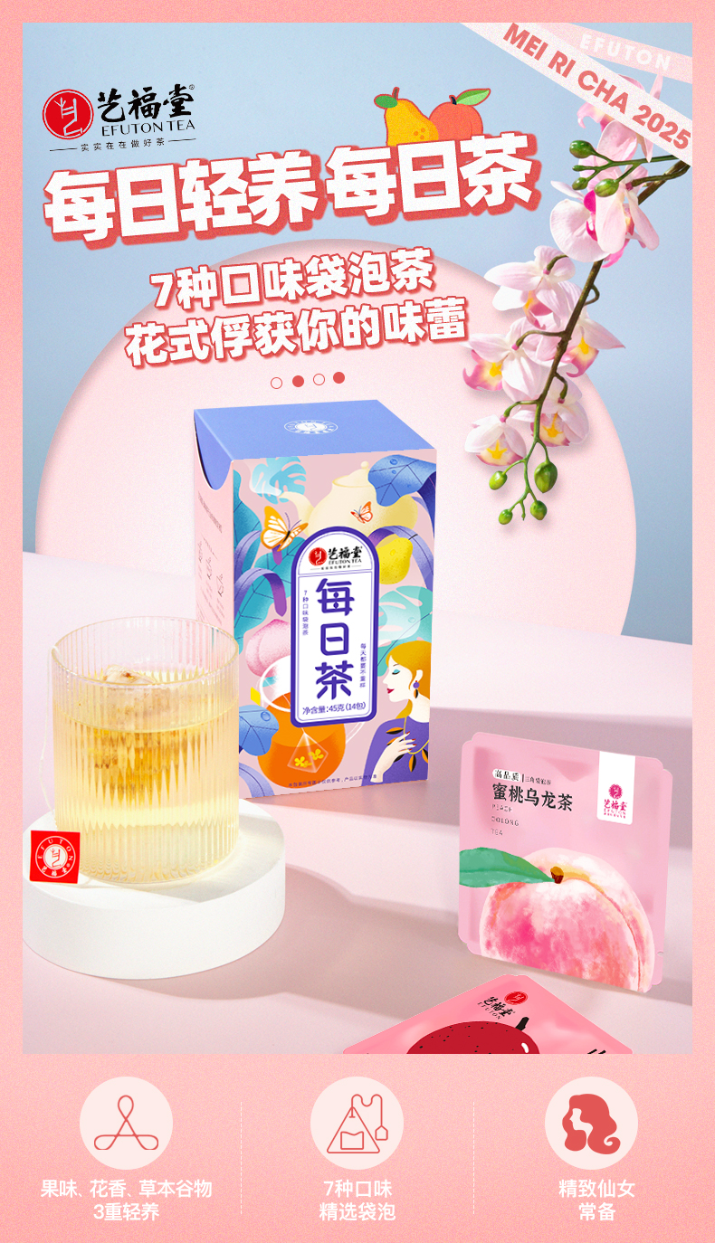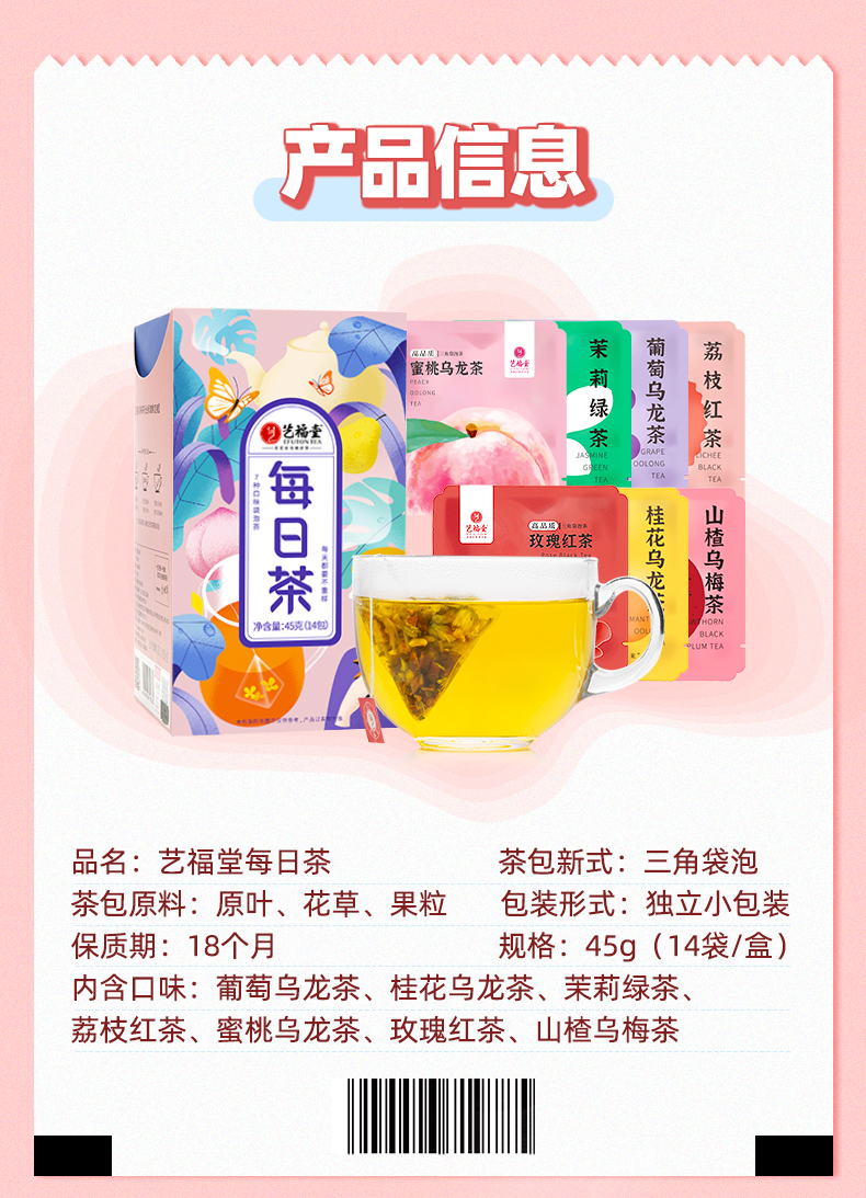 【优选】艺福堂 每日茶 蜜桃乌龙茉莉绿茶葡萄乌龙水果茶包 45g/盒(14袋一盒)