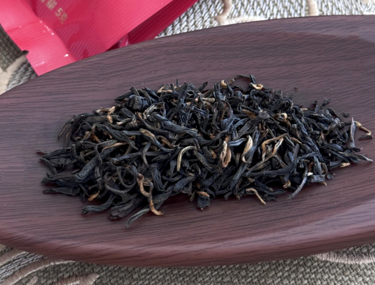 你看这干茶条索细秀,色泽金黄黑相间,金毫隐现,因茶型修长如眉而得名。
