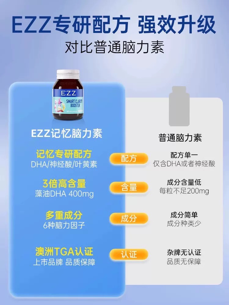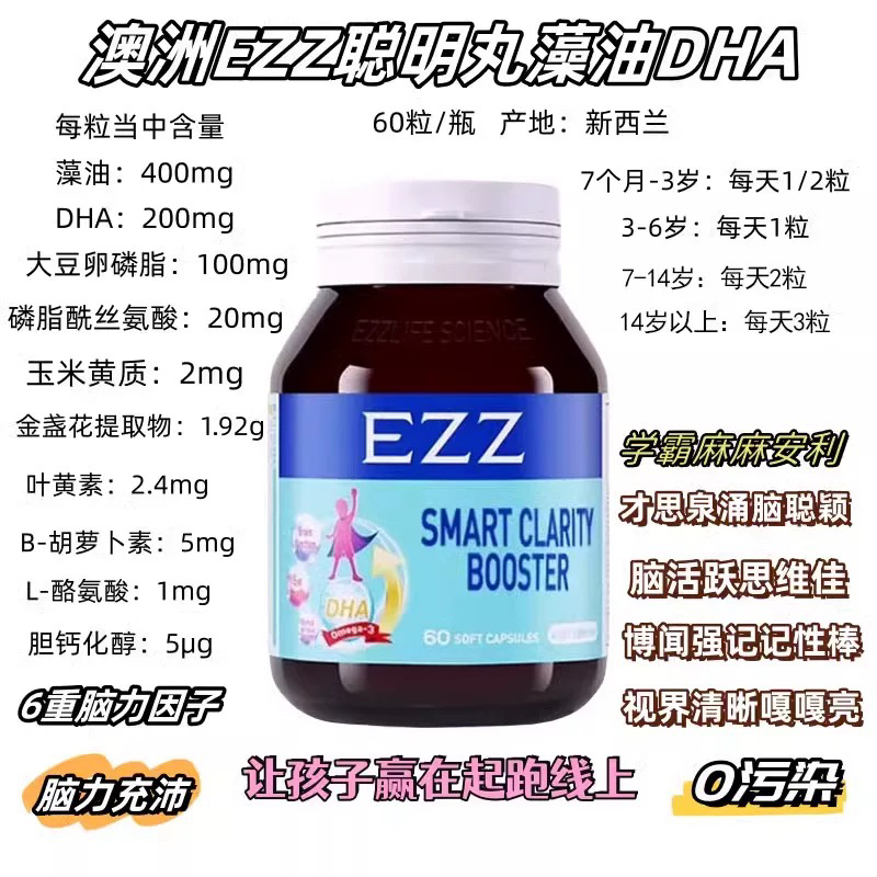 澳洲EZZ藻油DHA 记忆力儿童青少年学生聪明丸神经酸海藻油60粒