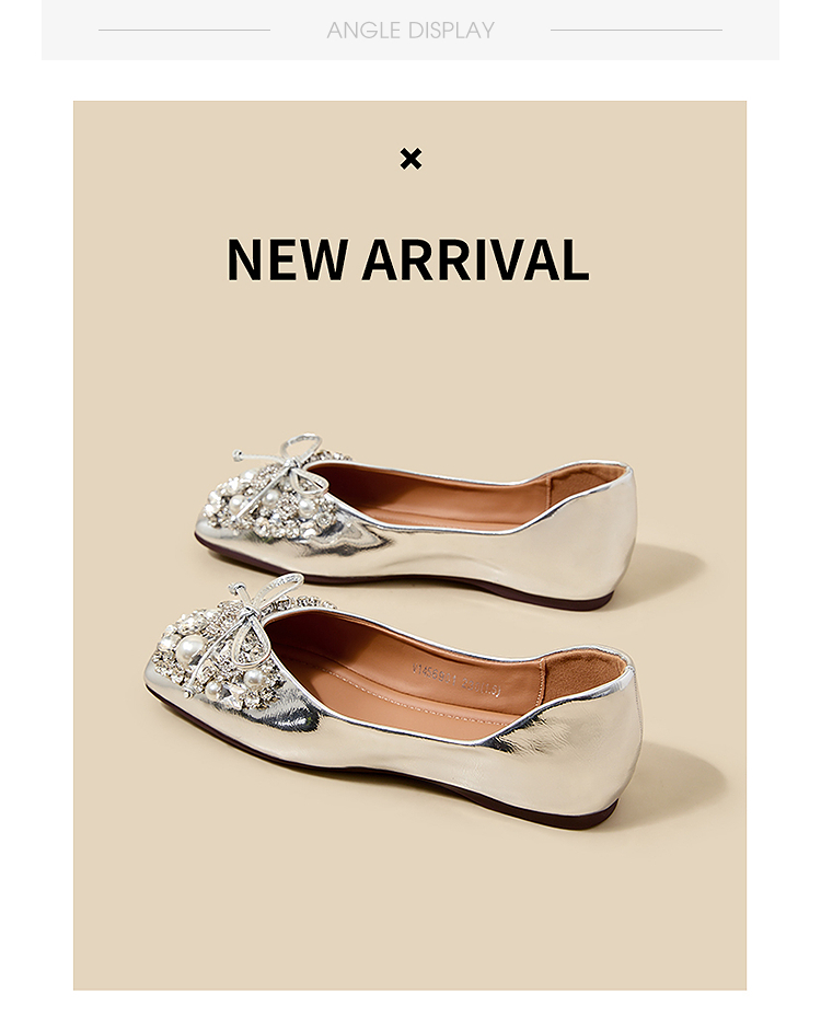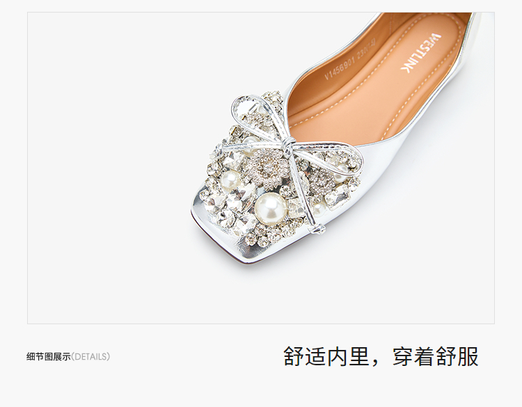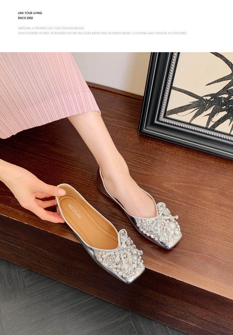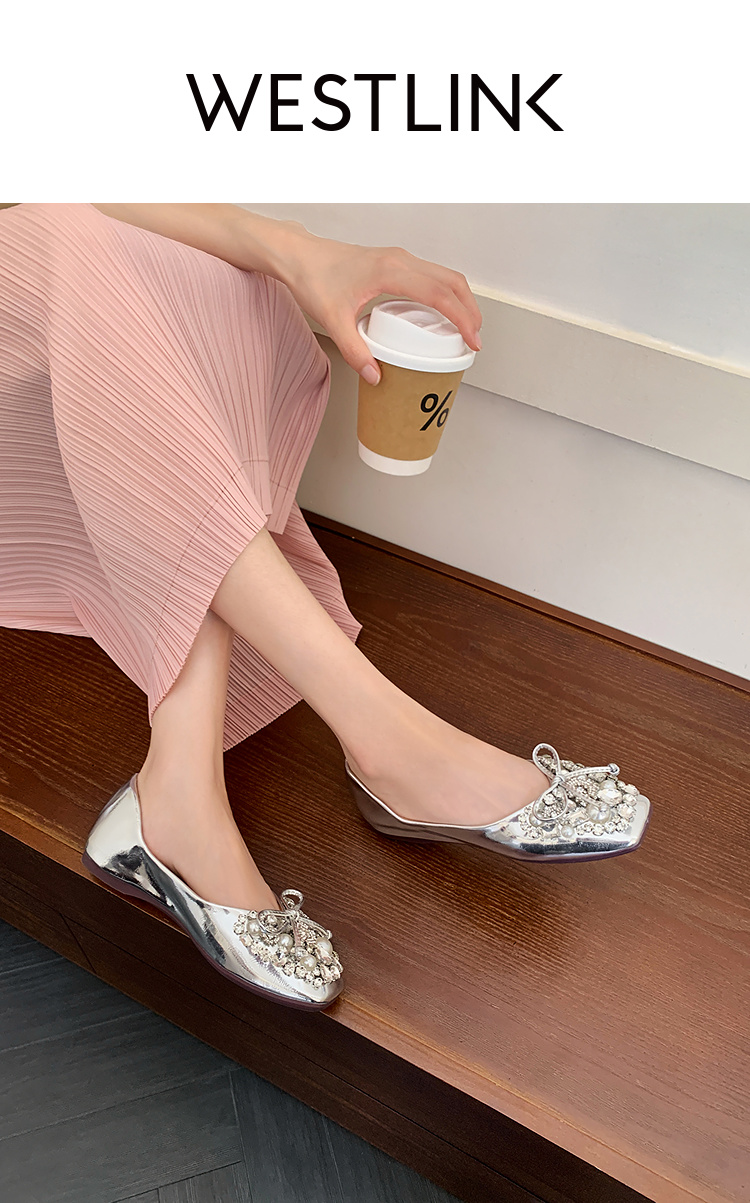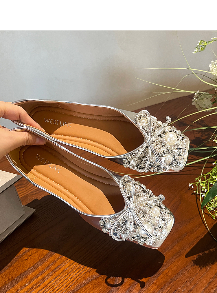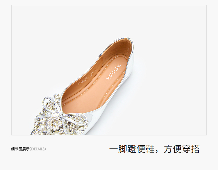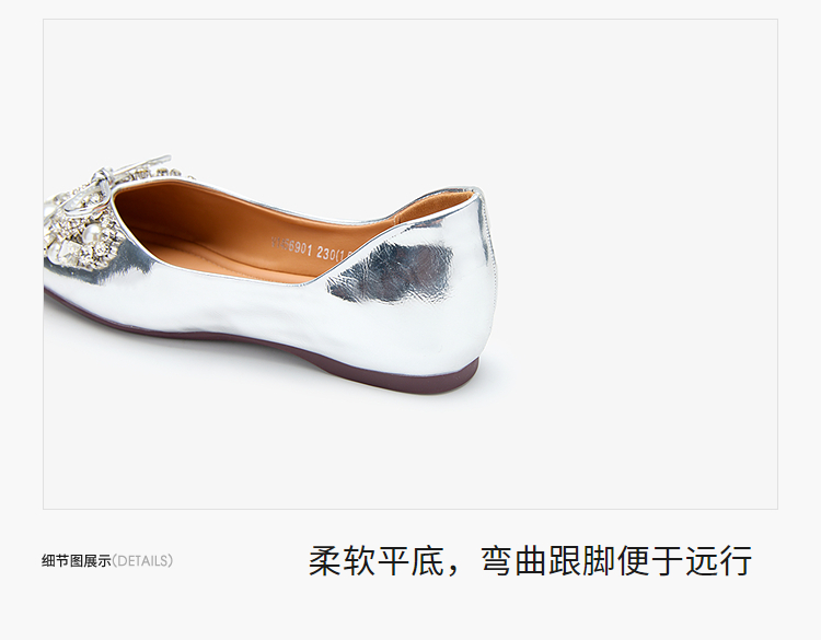 西遇水钻浅口单鞋女新款秋季绝美蝴蝶结瓢鞋软底银色平底鞋V1456901