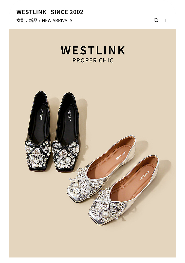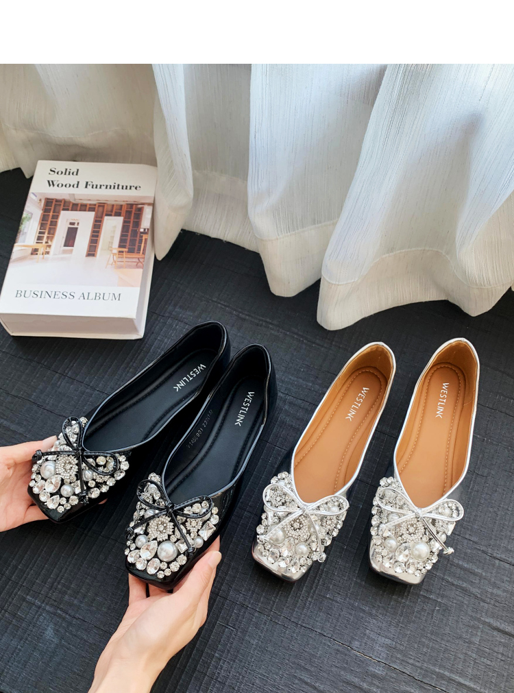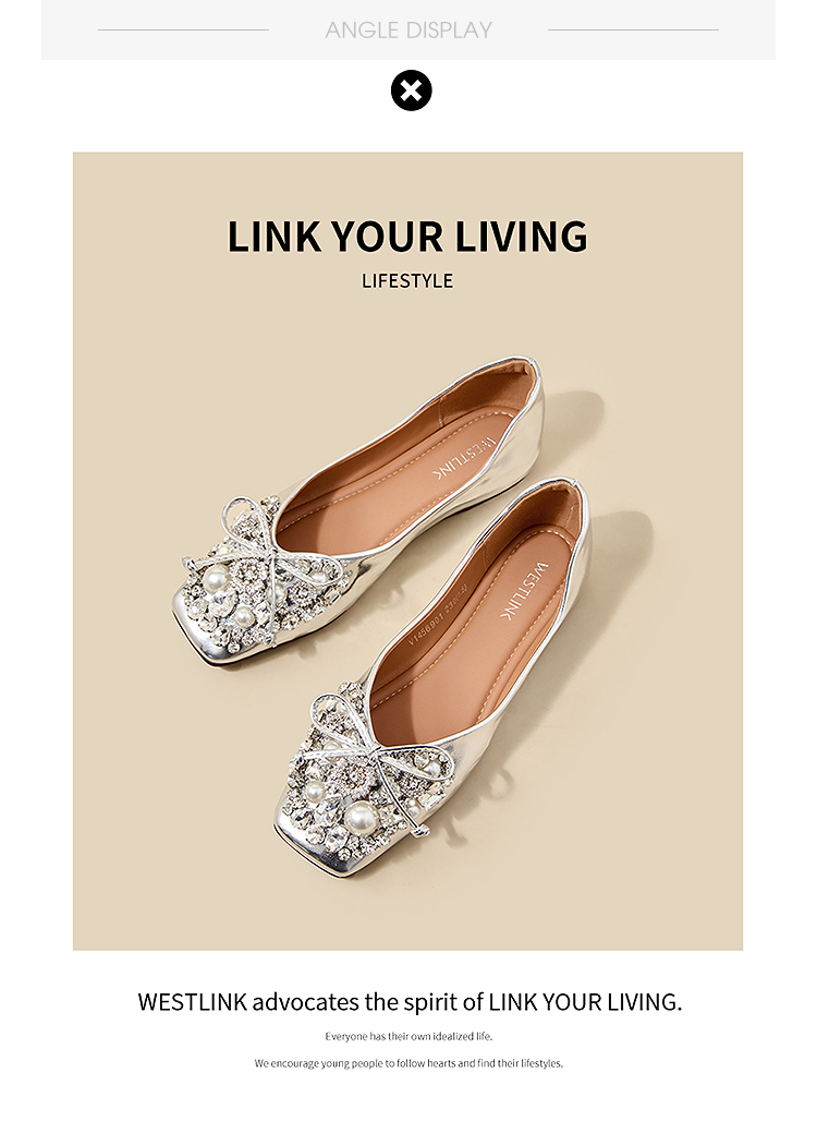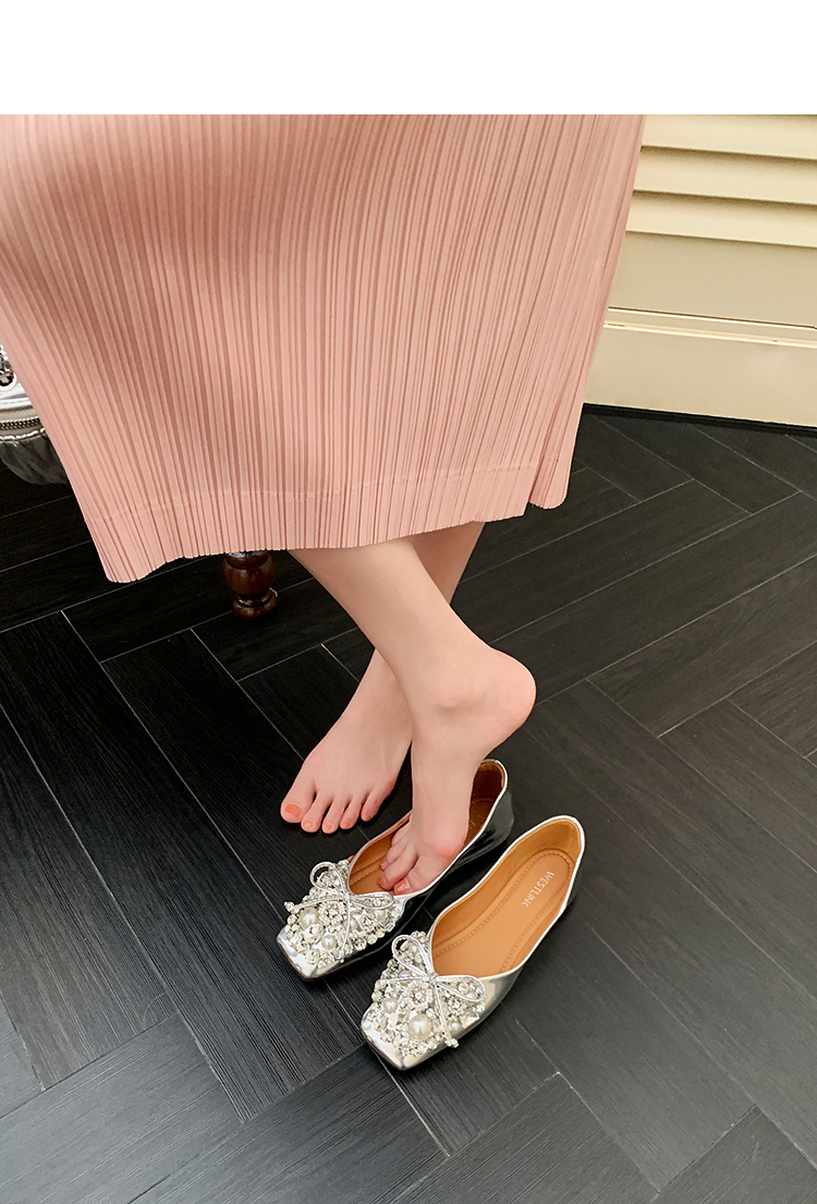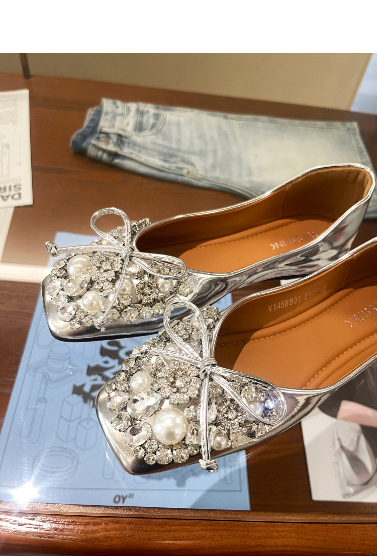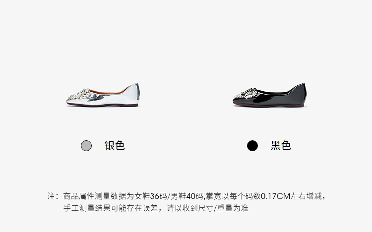西遇水钻浅口单鞋女新款秋季绝美蝴蝶结瓢鞋软底银色平底鞋V1456901