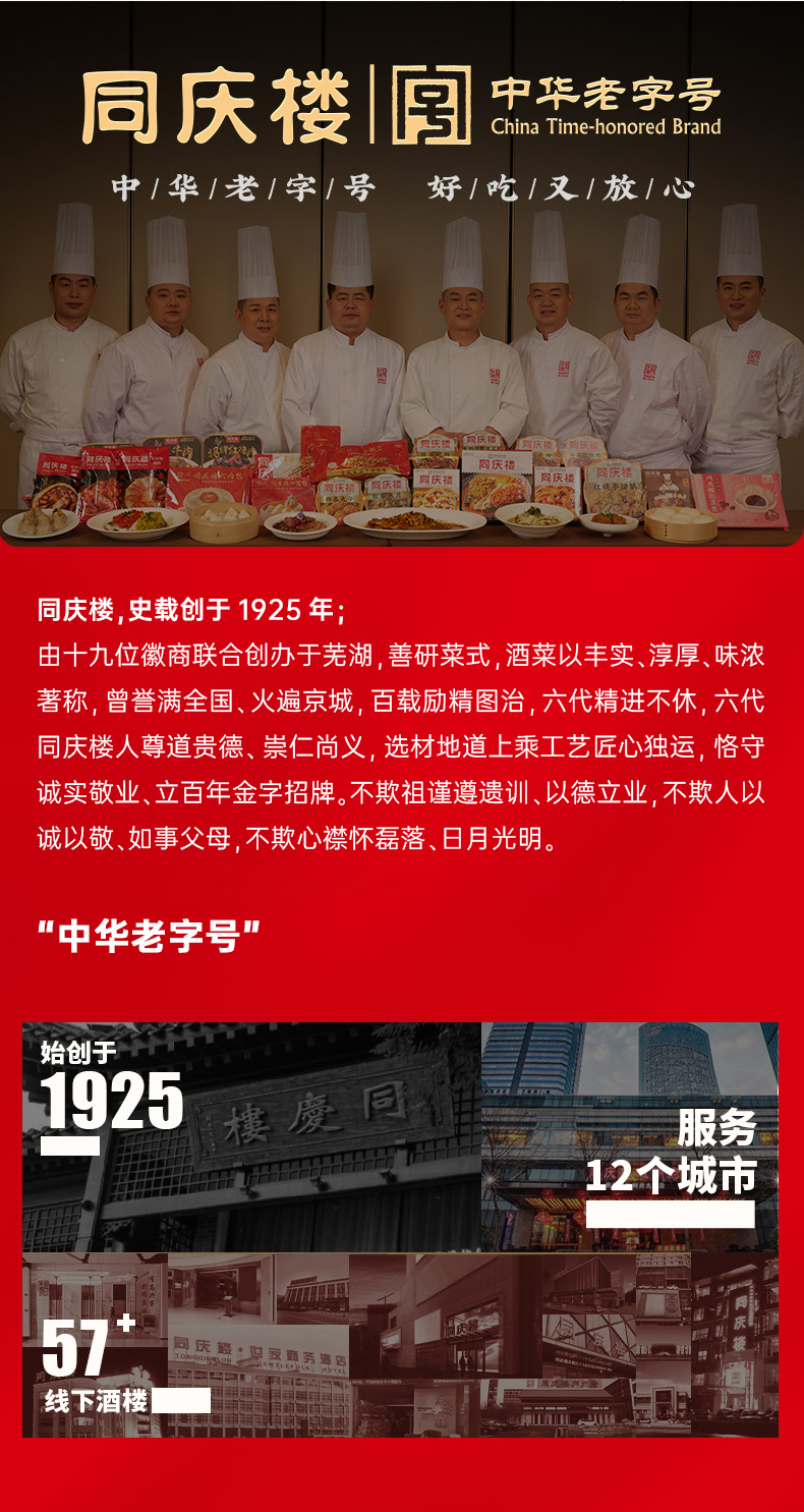 - 同庆楼品牌始创于1925年,是中华老字号,安徽和江苏两省餐饮龙头企业;是中国餐饮上市企业,百强企业,荣获多项荣誉,深受各方关注和好评,赢得海内外宾客广泛赞誉。