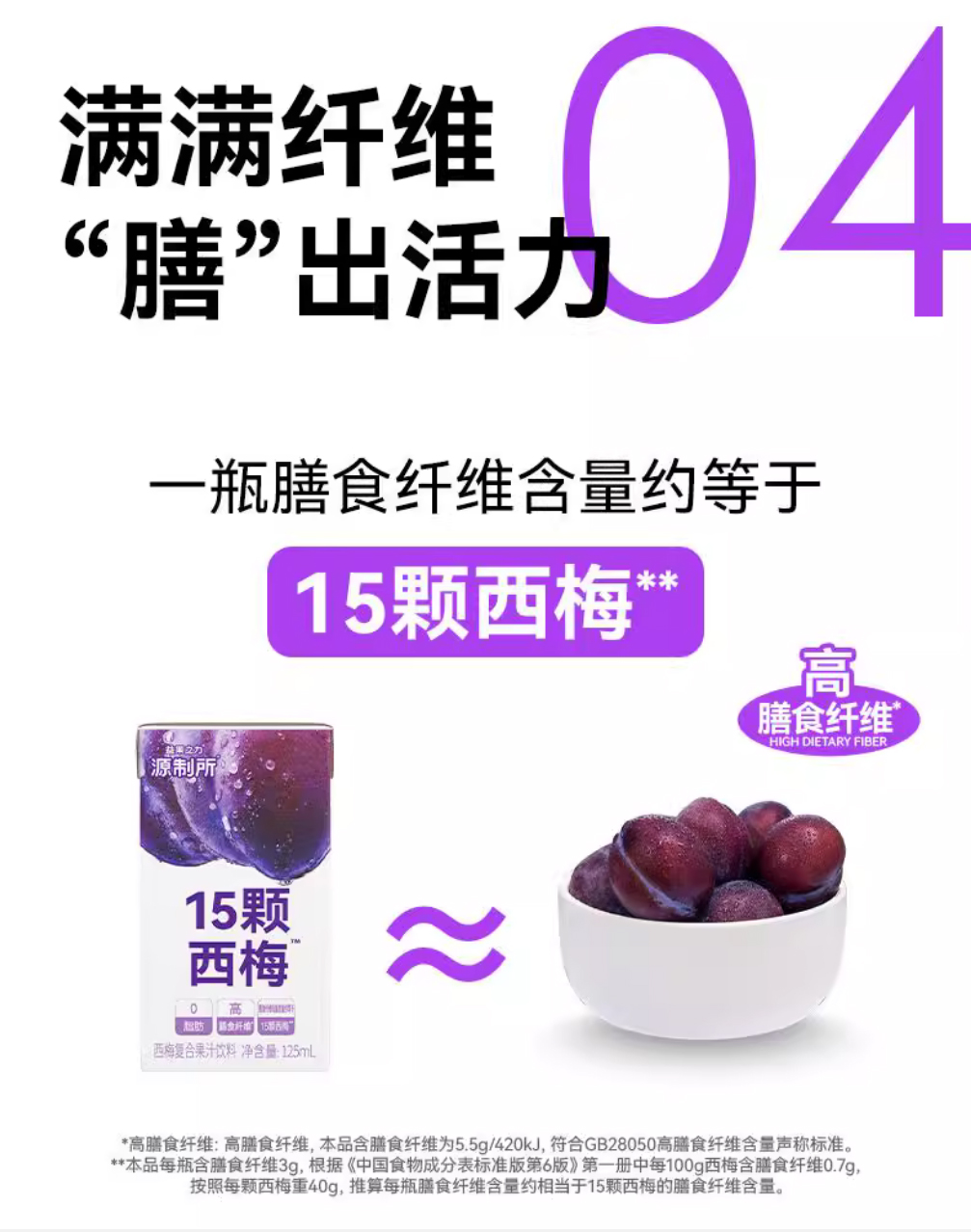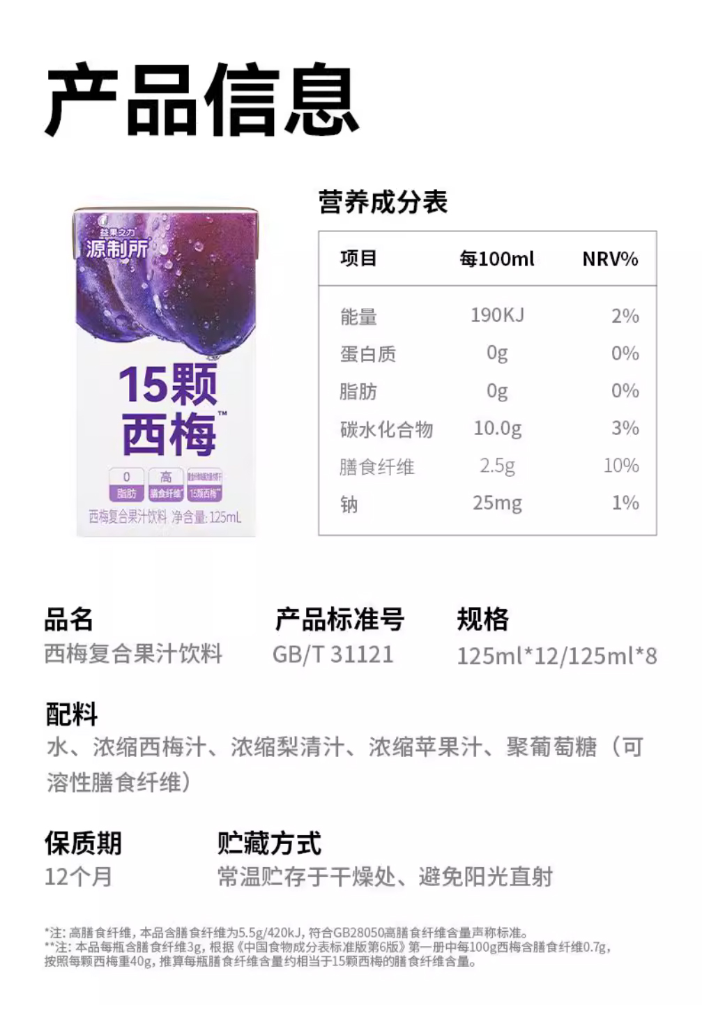 【品名】源制所西梅汁果味饮125ml 膳食纤维0蔗糖0脂果汁