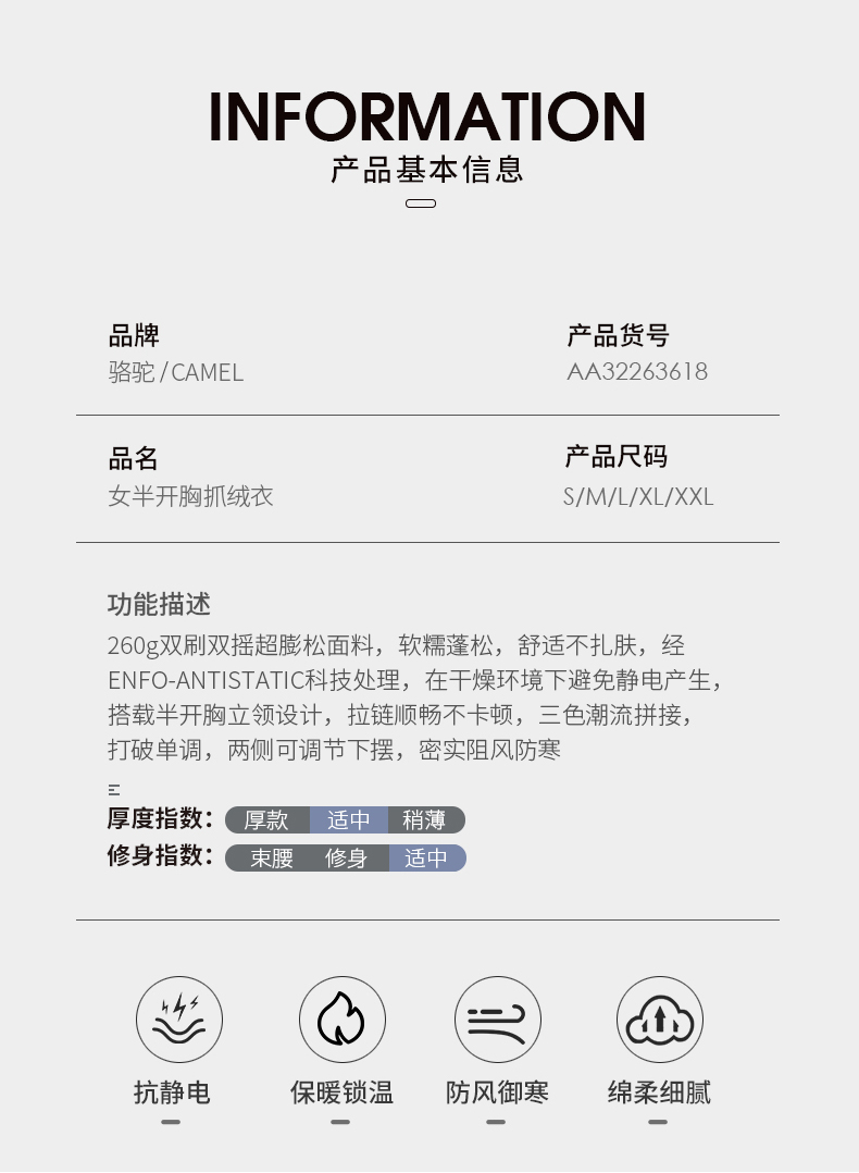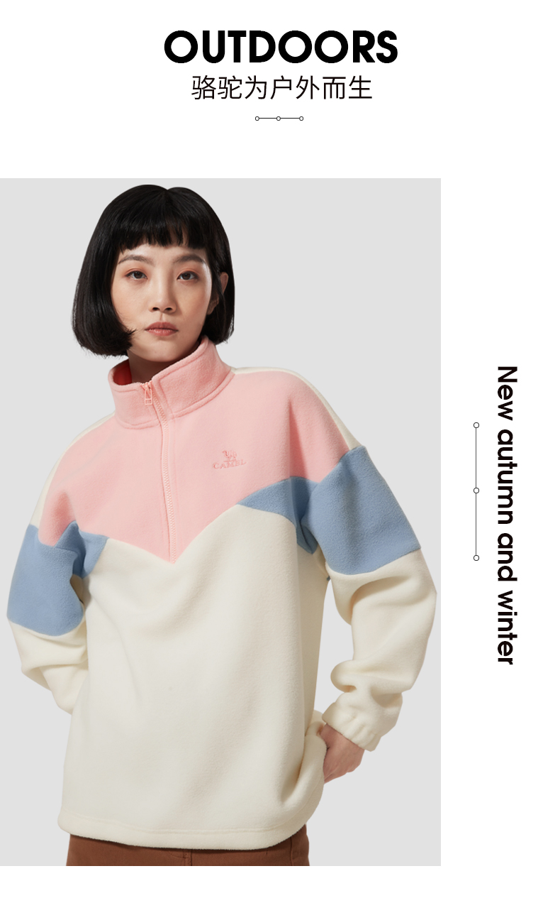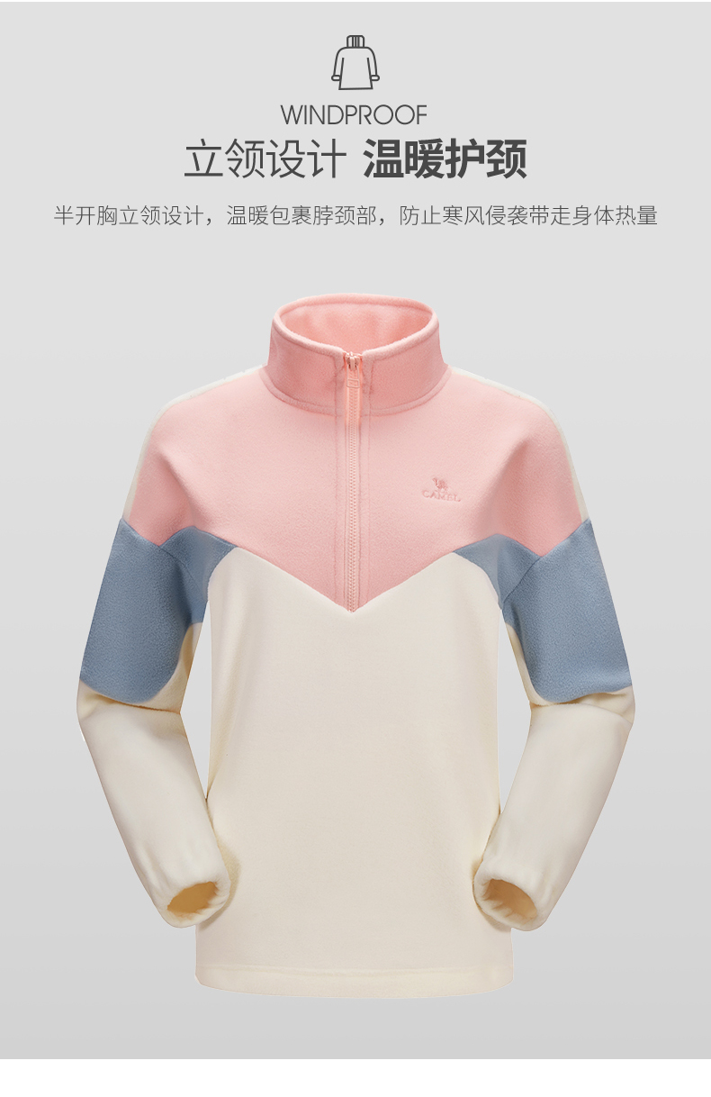 CAMEL骆驼户外女半开胸抓绒衣2022春秋摇粒绒内胆卫衣颗粒绒外套 AA32263618