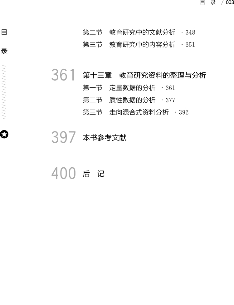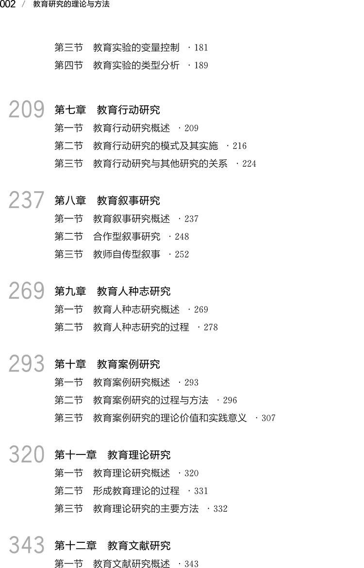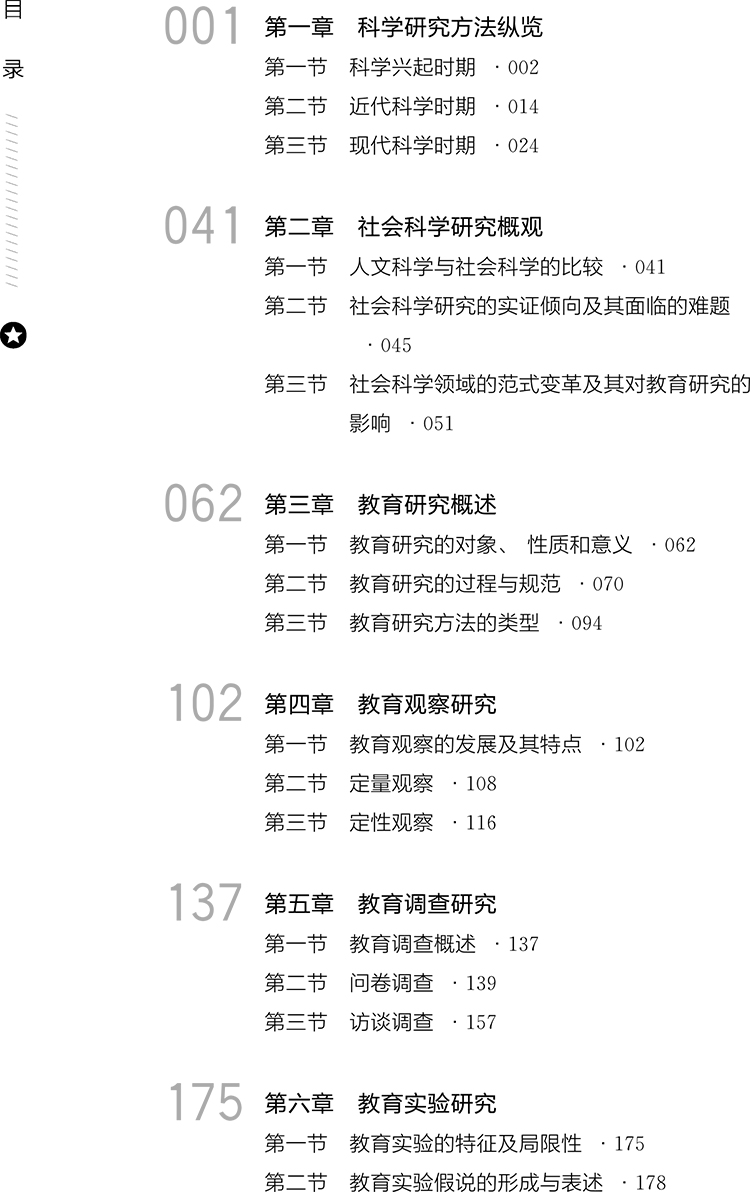 教育研究对推动我国教育改革和现代化发展,具有基础性支撑和关键性引领的作用。本书梳理了自然科学研究经历的从经验到科学、从粗放到精致的发展脉络,讨论了社会科学研究与自然科学、人文学科研究的差异和共性,分析了社会科学领域的范式变革及其对教育研究的影响。本书分述的当今教育研究领域中主要的研究方法,既有较为经典的观察、调查、实验和文献方法,又有教育行动研究、教育叙事研究、教育人种志研究、教育案例研究等综合性的研究方法,还有以形成理论为目的的教育理论研究方法。本次修订还联系“科教兴国”“教育强国”“铸牢中华民族共同体”和“构建人类命运共同体”等方面的重大主题,引导读者结合教育研究的实际深入思考,同时也对应用案例进行了与时俱进的更新。