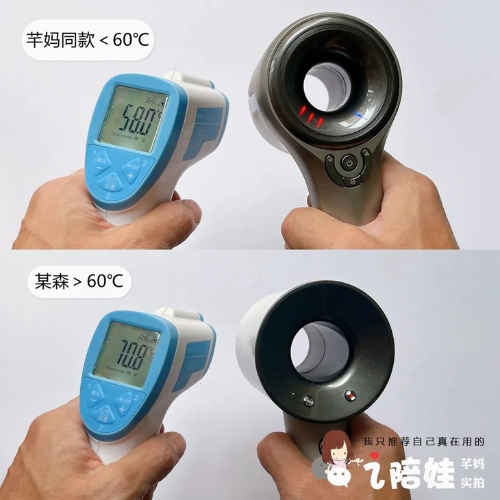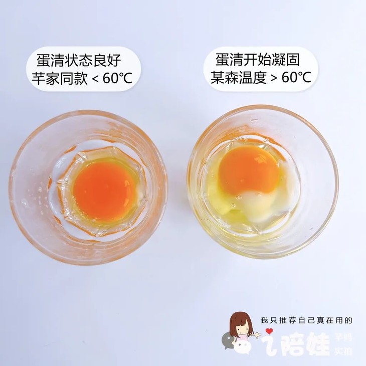 吹风机吹鸡蛋8分钟,这款的温控不超过60度,蛋清状态良好。恒温超过60度的某森,蛋清开始凝固,属于不可逆变化。