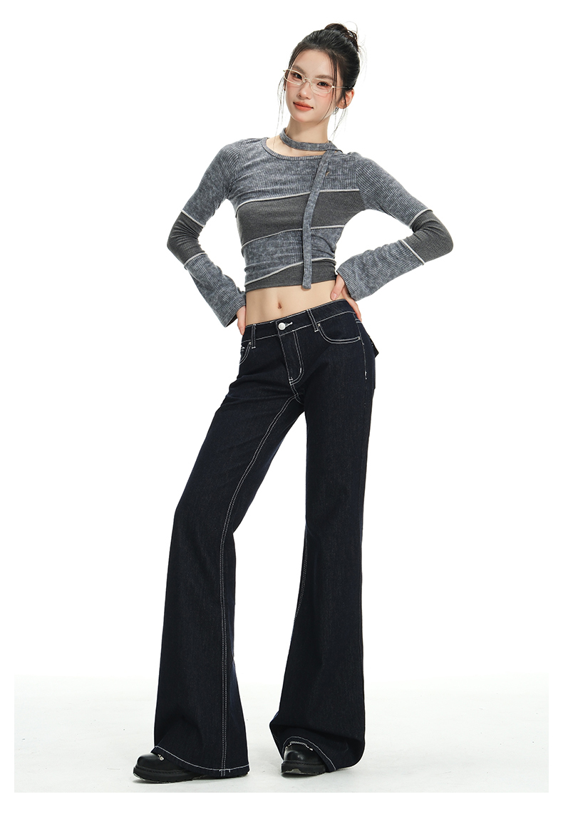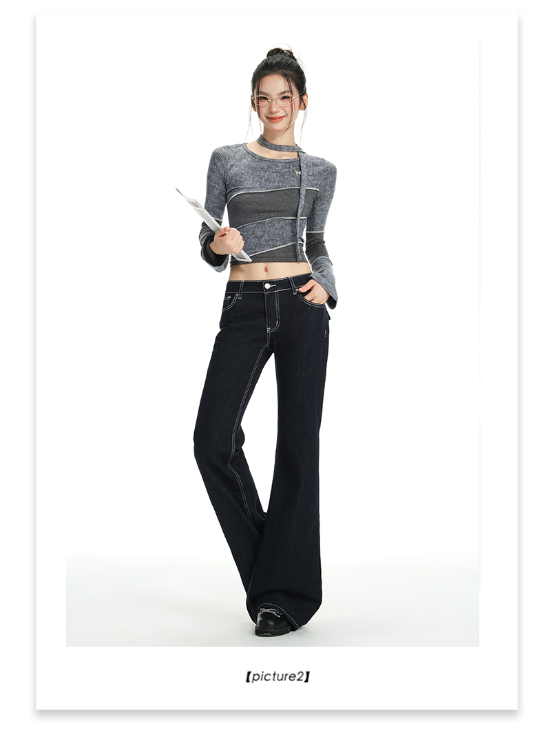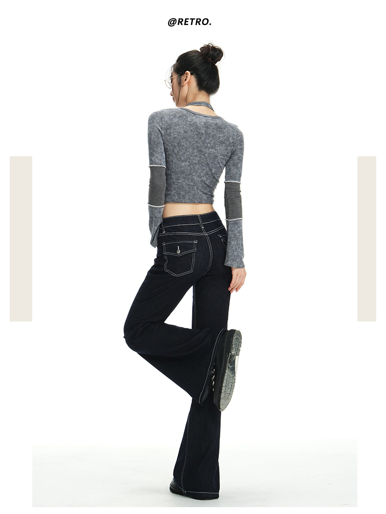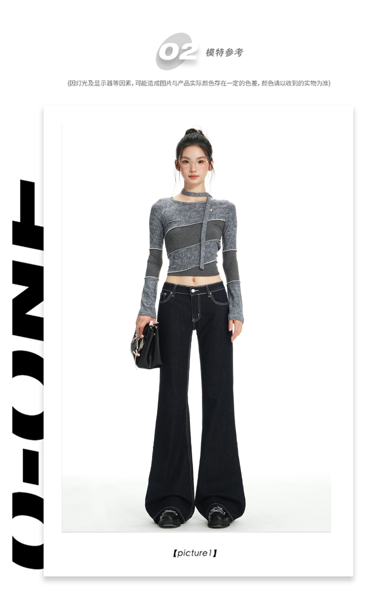 罗蒙女士春秋牛仔裤深色复古低腰微喇百搭显瘦宽松拖地喇叭小个子裤子