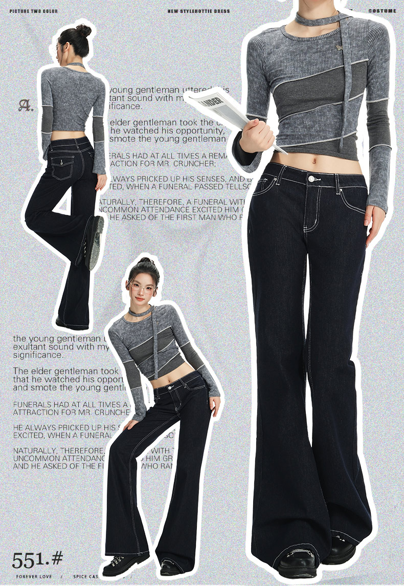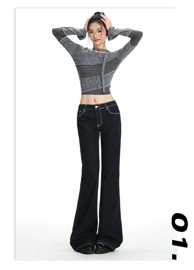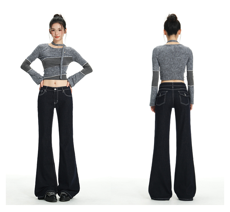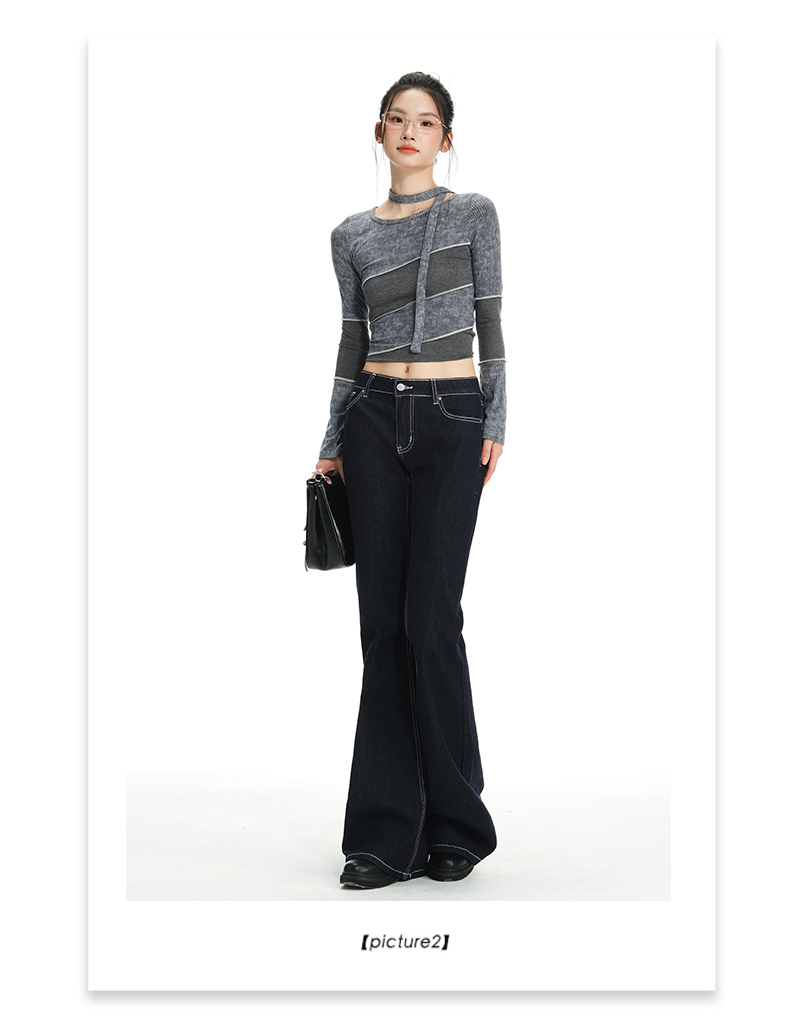 罗蒙女士春秋牛仔裤深色复古低腰微喇百搭显瘦宽松拖地喇叭小个子裤子