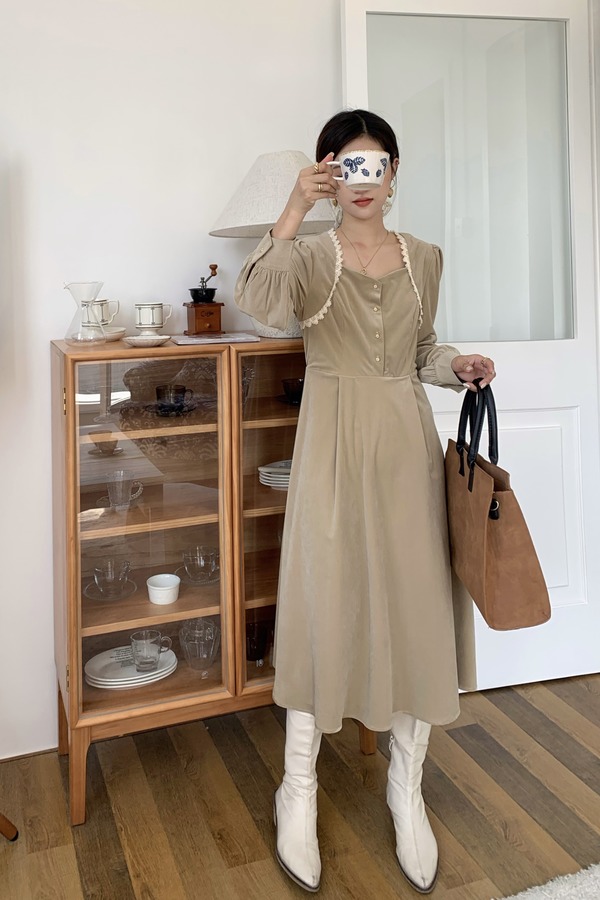 Stay2Weeks 温柔系卡其色高腰A字连衣裙 15610