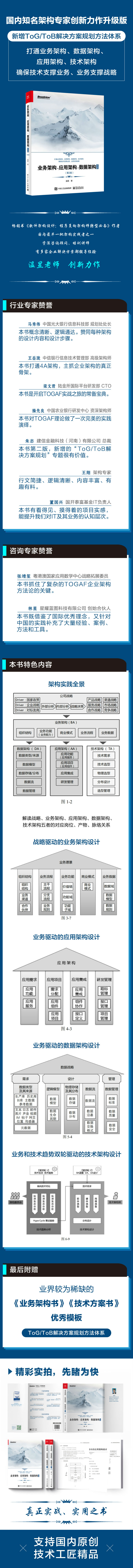 业务架构是跨系统的业务蓝图,应用架构、数据架构、技术架构是解决方案的不同方面。多年来,业界已在业务架构、应用架构、数据架构、技术架构方面积累了大量经验。近几年,数字化转型更是呼唤“懂行人”打通四种架构,确保技术支撑业务、业务支撑战略。本书的主要内容即在于此。首先,解读战略、业务架构、应用架构、数据架构、技术架构五者的对应岗位、产物、脉络关系。然后,结合大案例,详探下列实战法: 战略驱动的业务架构设计; 业务驱动的应用架构设计; 业务驱动的数据架构设计; 业务和技术趋势双轮驱动的技术架构设计。再后,分享业界较为稀缺的《业务架构书》《技术方案书》优秀模板。*后,分享ToG/ToB解决方案规划方法体系。