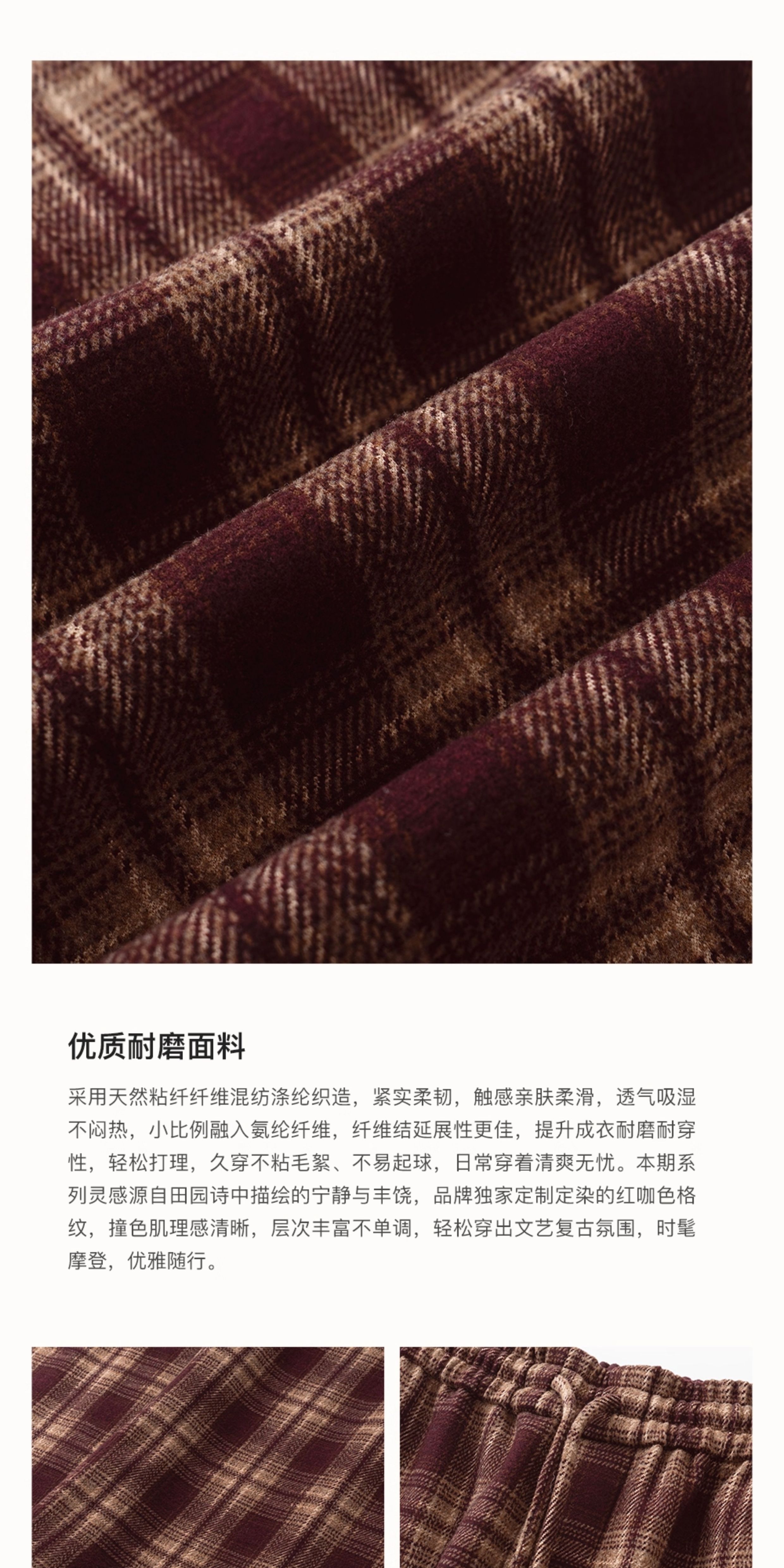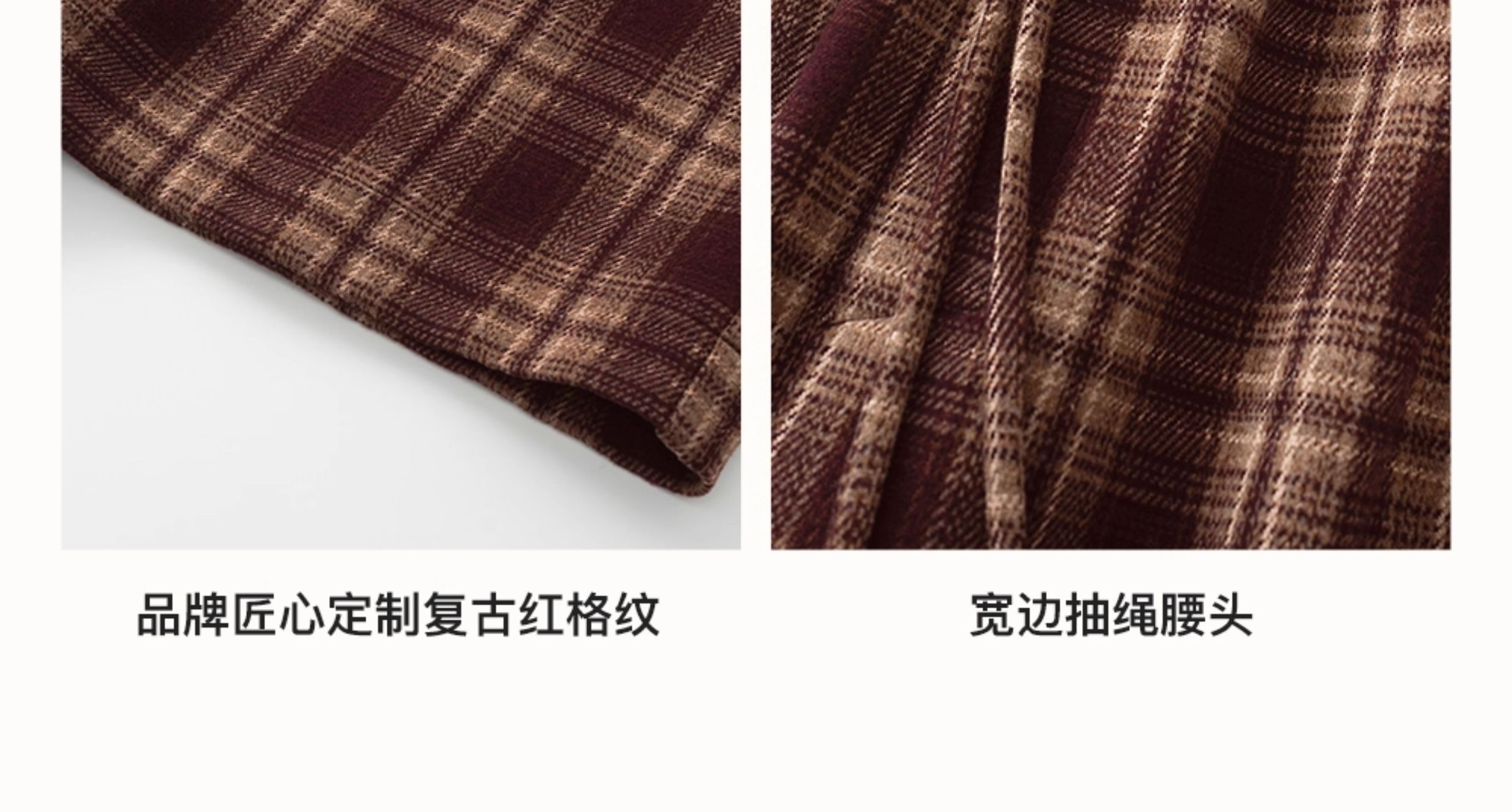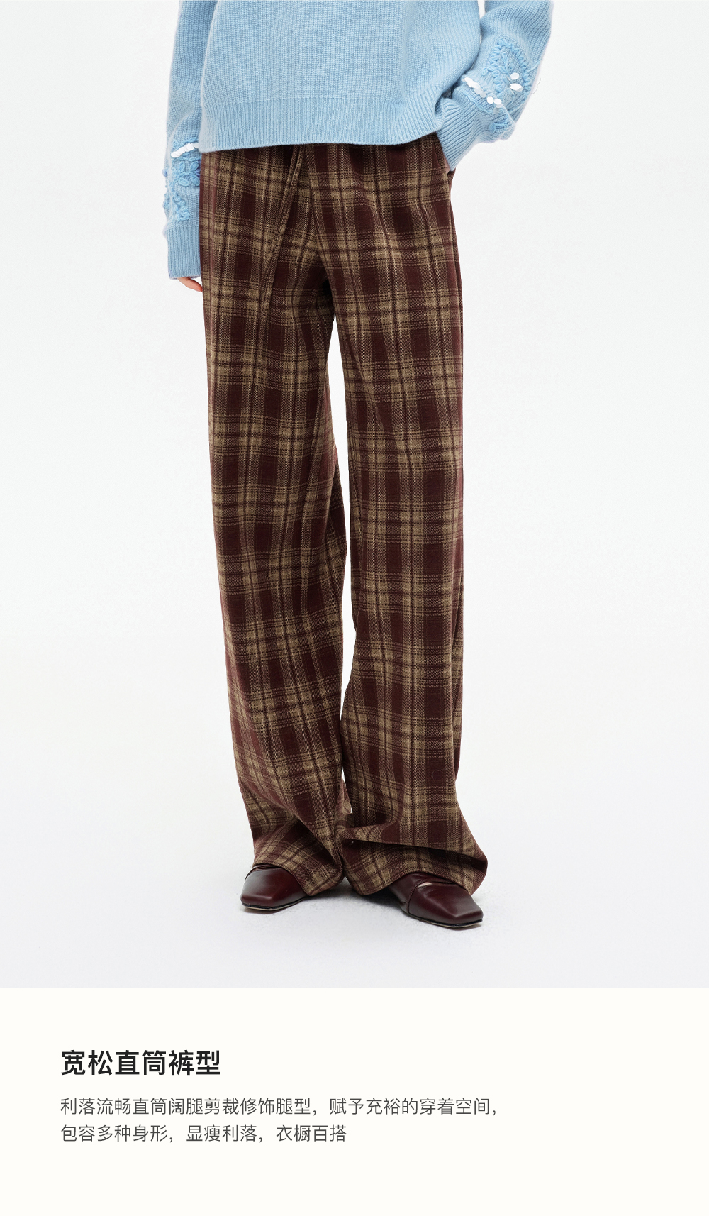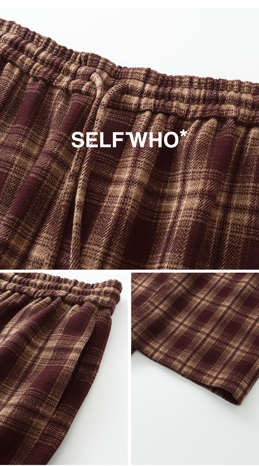 SELFWHO复古红咖色格纹休闲裤女2025冬新款宽松抽绳松紧腰直筒裤