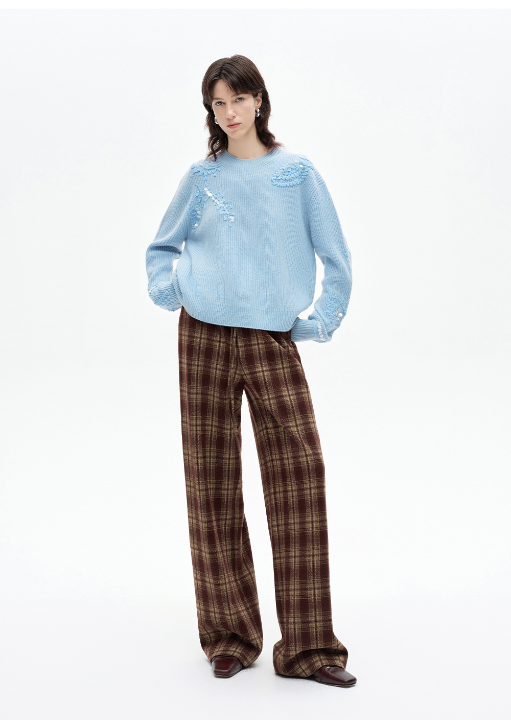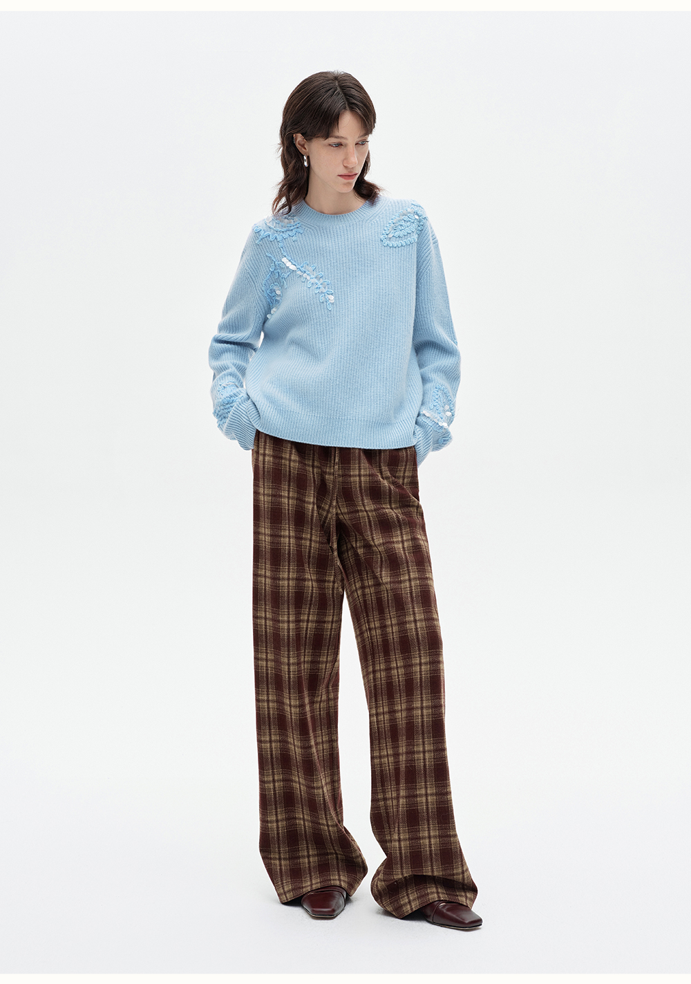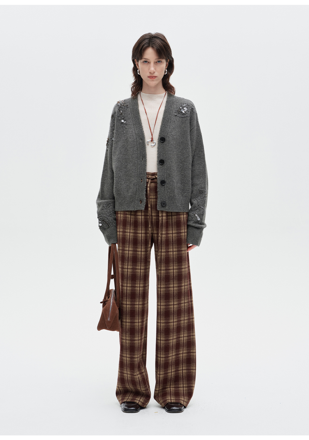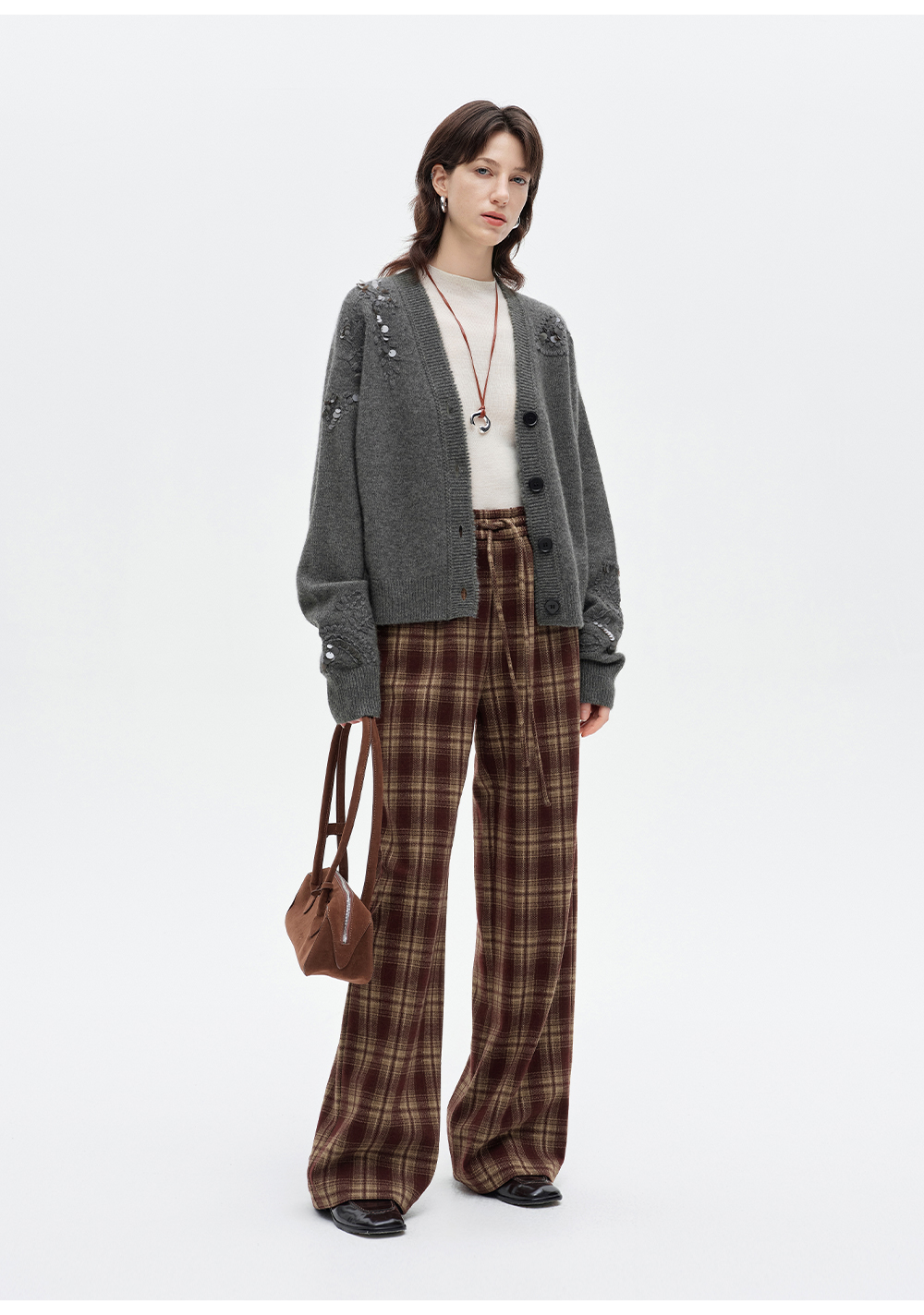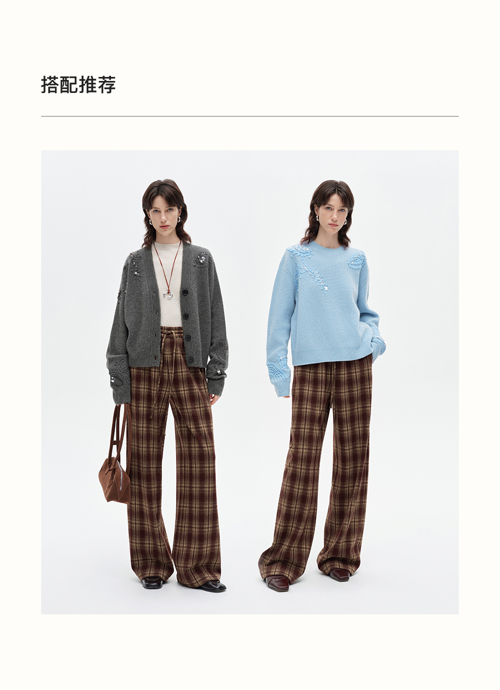 SELFWHO复古红咖色格纹休闲裤女2025冬新款宽松抽绳松紧腰直筒裤