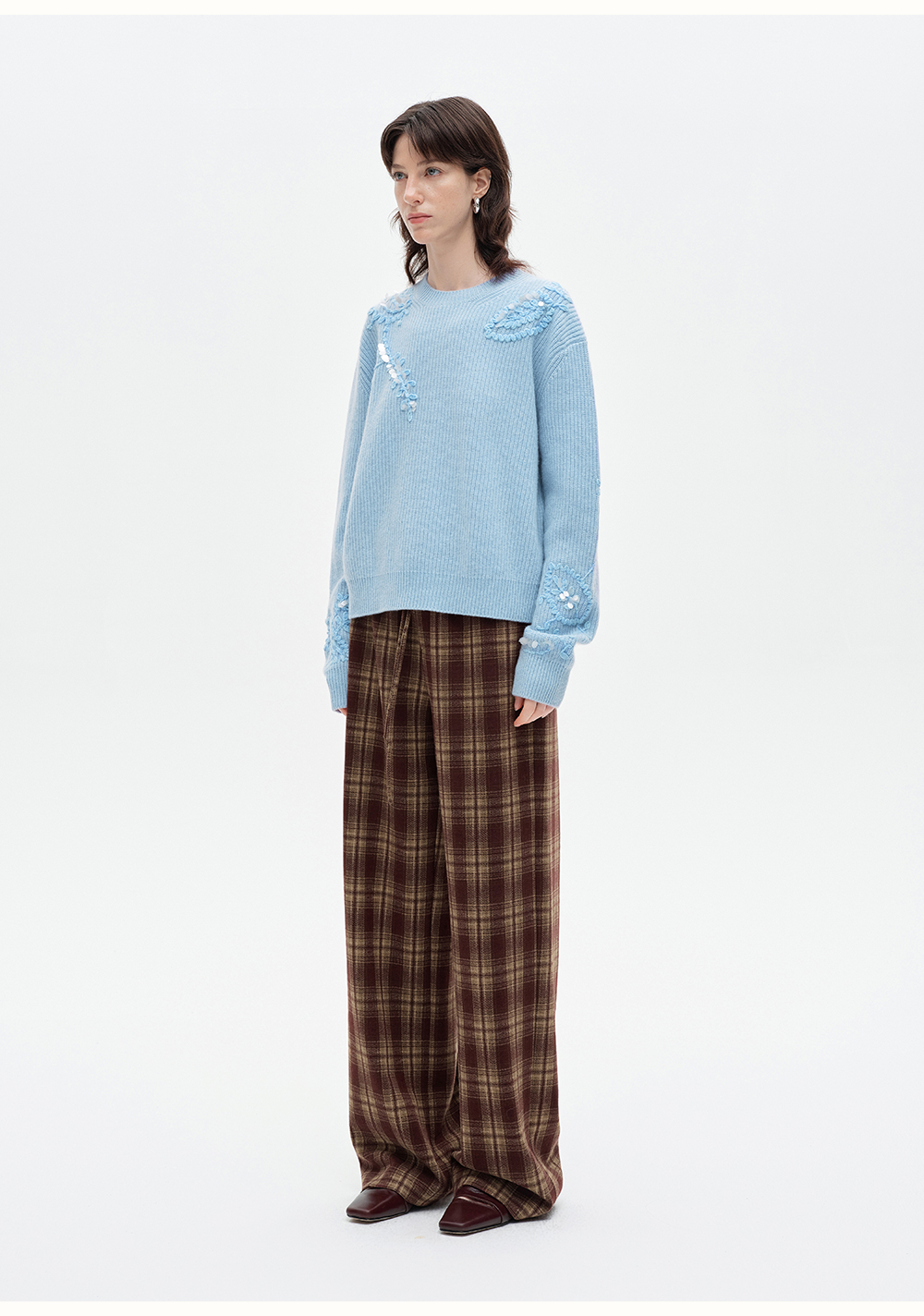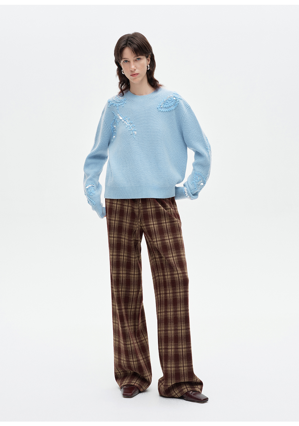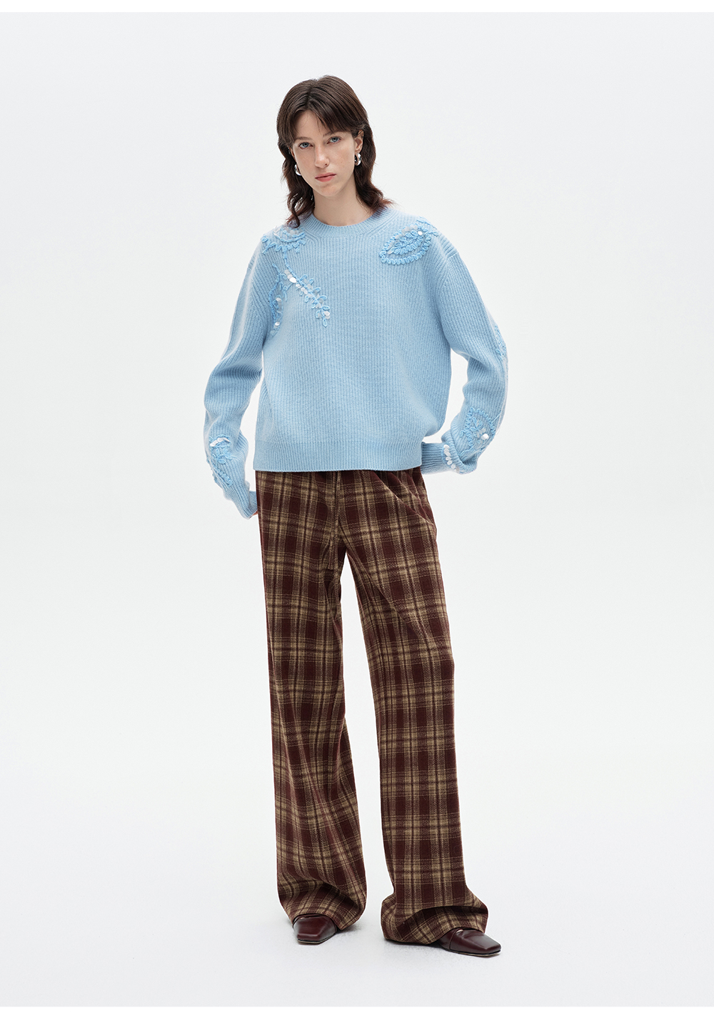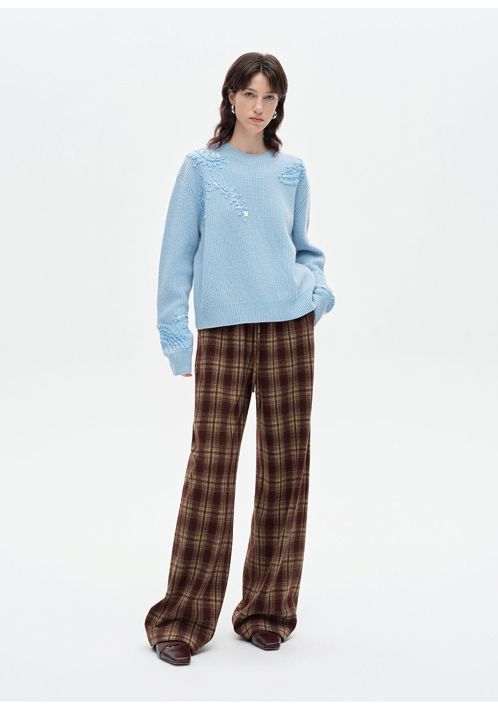 SELFWHO复古红咖色格纹休闲裤女2025冬新款宽松抽绳松紧腰直筒裤