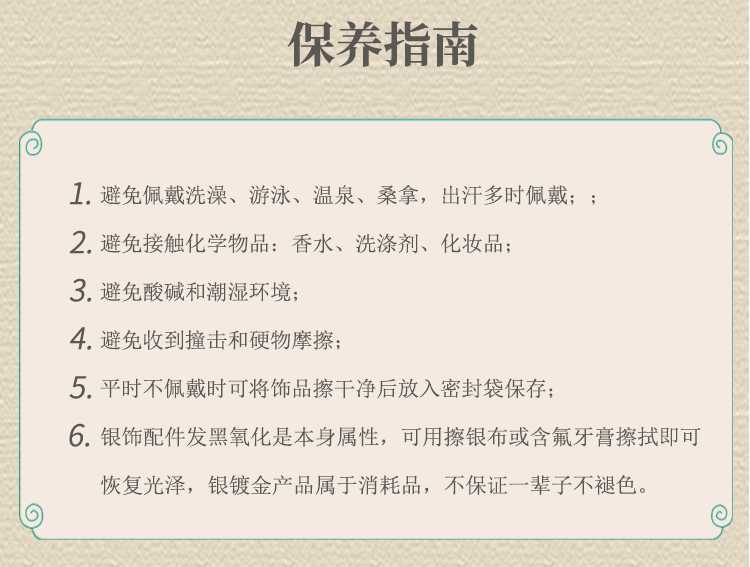 6、银饰配件发黑氧化是本身属性,可用擦银布或含氟牙膏擦拭即可恢复光泽,银镀金产品属于消耗品,不保证一辈子不褪色。