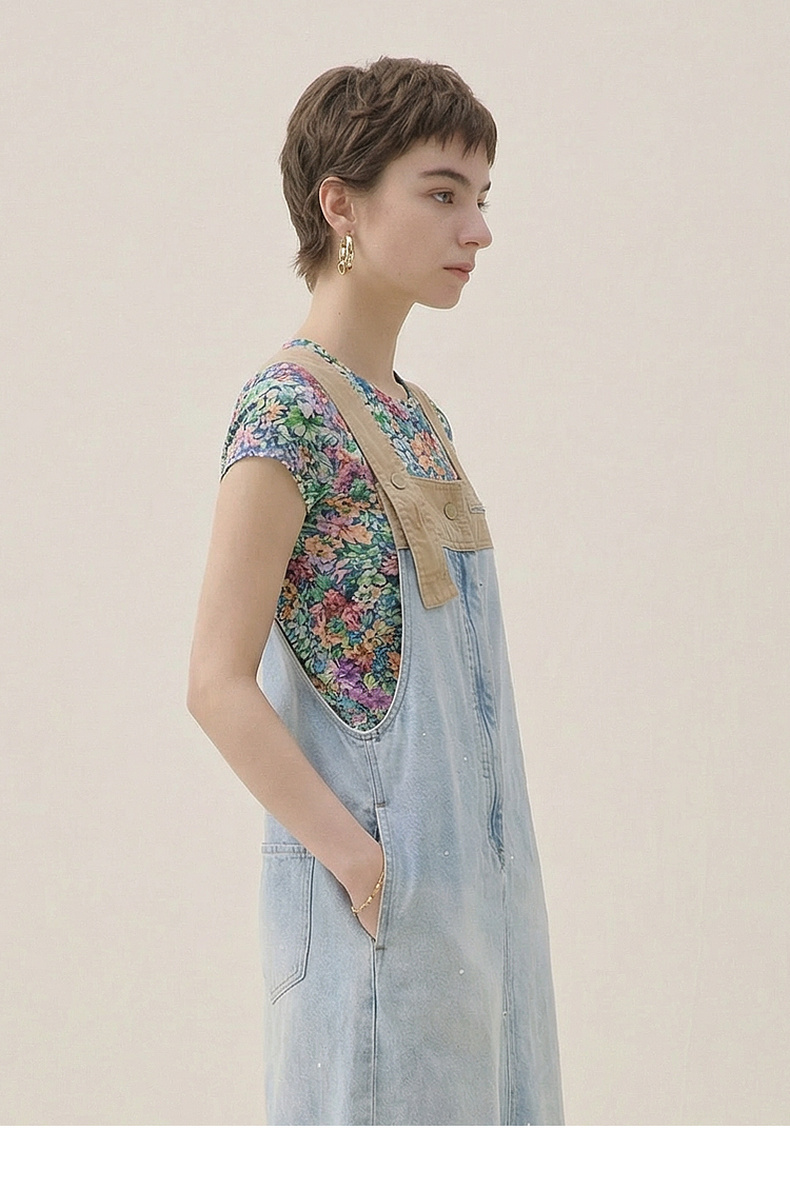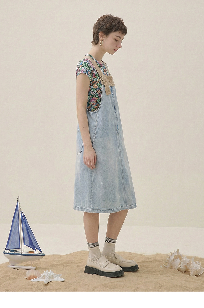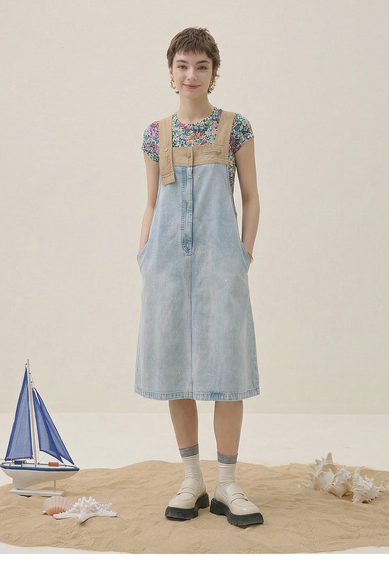 谜底牛仔连衣裙短袖2026春季新品做旧水洗H型拼接亲肤女261ML0044