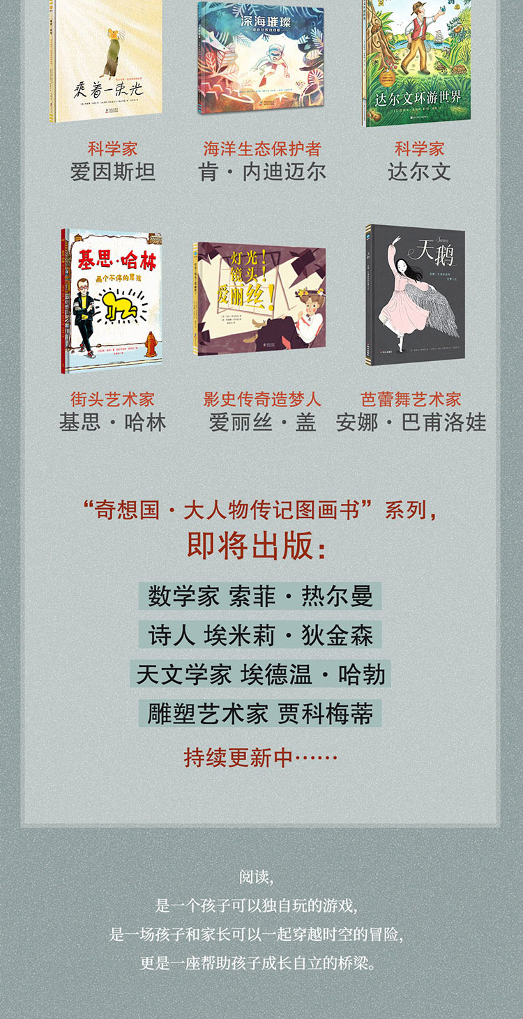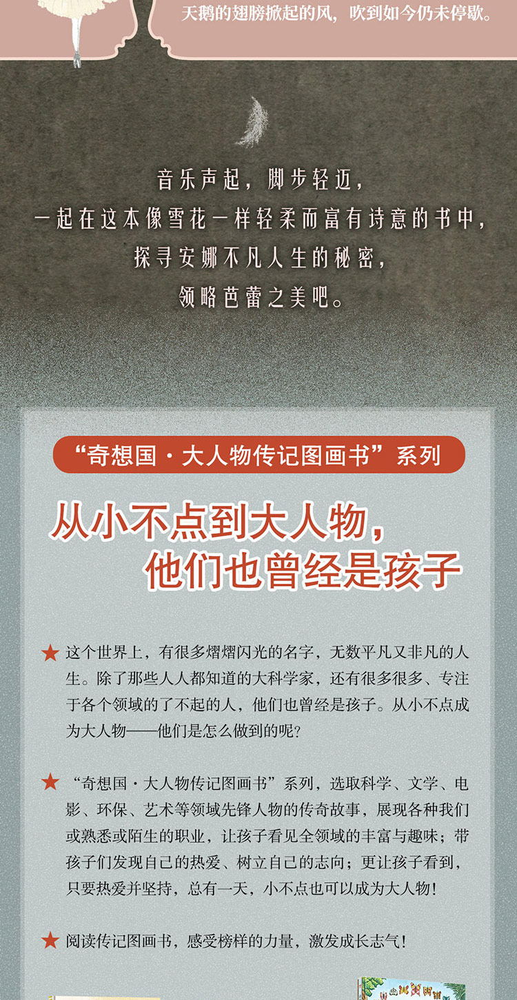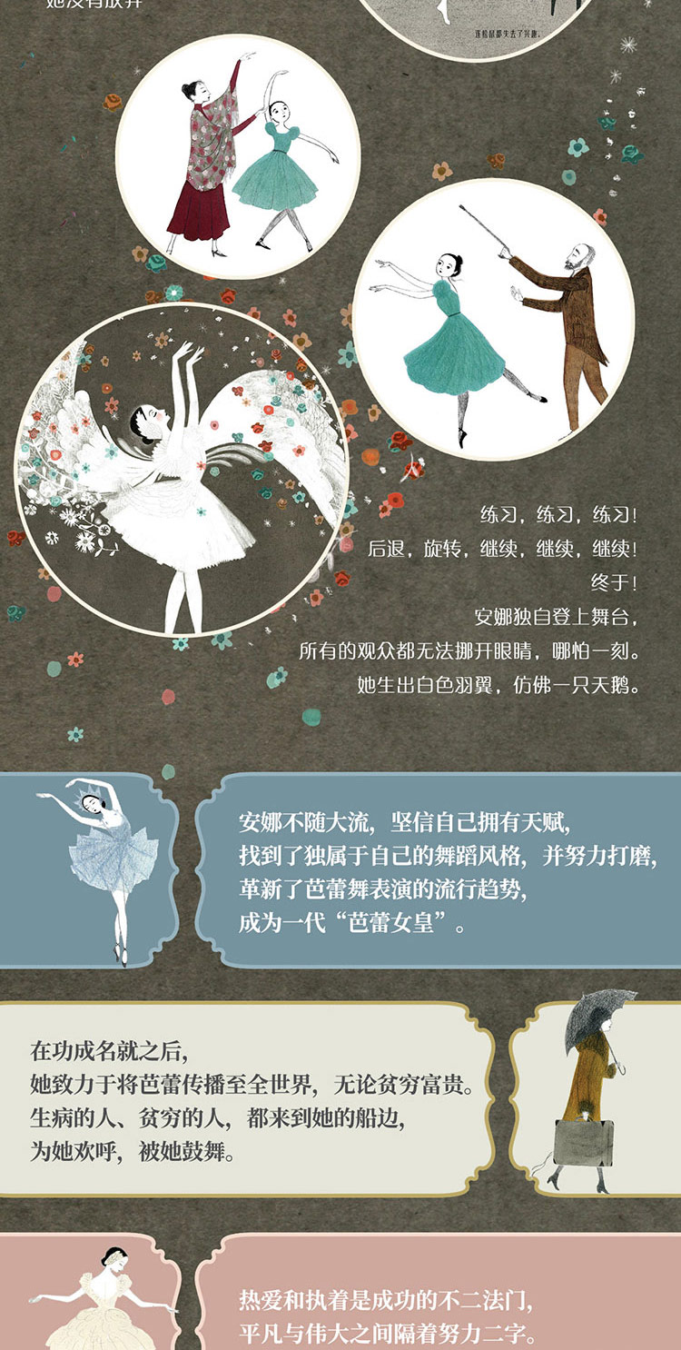 本书真实地展现了俄罗斯芭蕾舞女皇安娜·巴甫洛娃闪耀的一生:她努力训练、耐心等待、不畏困难,坚持自己的梦想。她不为社会大流所裹挟,勤奋且勇敢,挖掘自己的优势,找到独属于自己的舞蹈风格,革新了芭蕾舞表演的流行趋势。她心有大爱,将这一份美丽传播给全世界的所有人,无论富贵贫困。她拥有太多太多美好的品质,值得我们今天的孩子和大人们去了解她,感受她美妙的舞姿和独一无二的人格魅力。