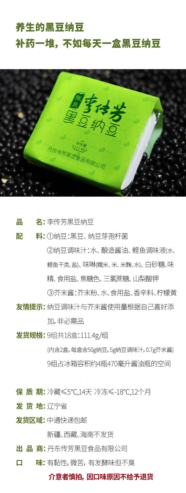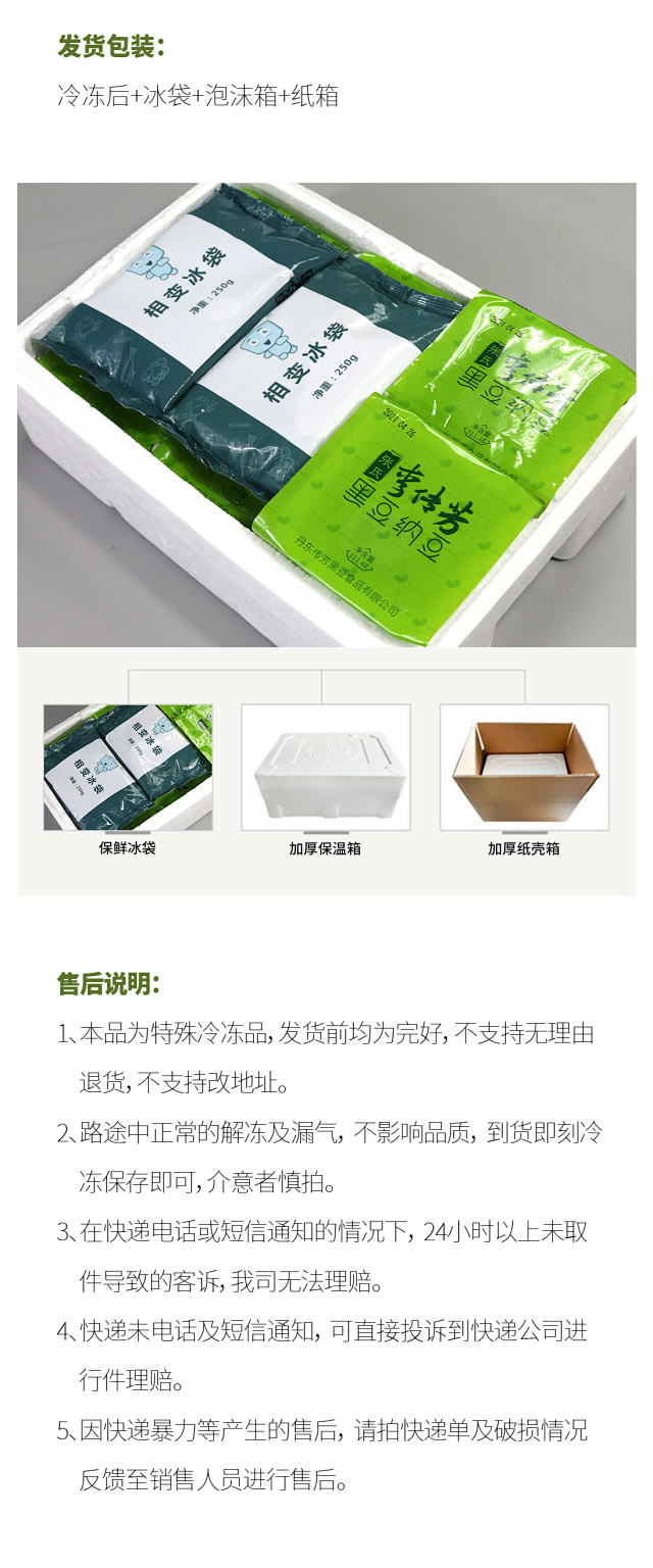【净含量】111.4g/组【规格】111.4g*9组,共18盒【保质期及储存方式】冷藏≤5℃ 14天 冷冻≦-18℃ 12个月【生产日期】见封面【产品标准】SB/T10528【食品生产许可证】SC12521021100073【产地】辽宁【发货地】辽宁【包装形式】产品独立包装,外用泡沫保温箱,纸箱【发货快递】中通快递【不发地区】新疆、西藏、宁夏、青海、内蒙、海南【加运费地区-加多少】加运费地区只接受顺丰 加40