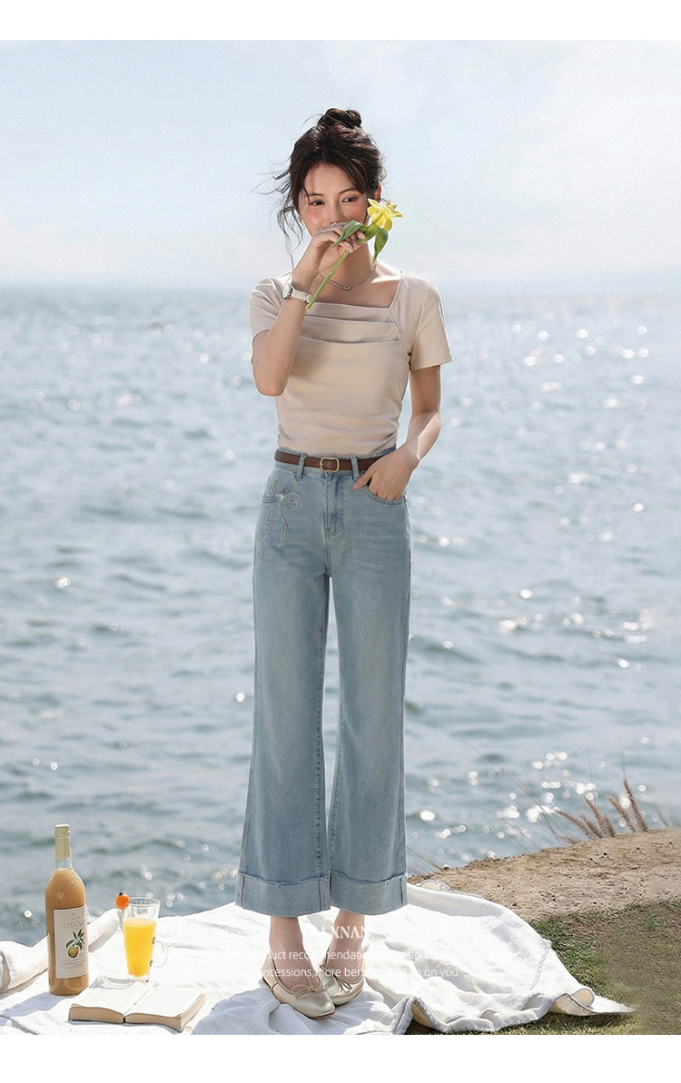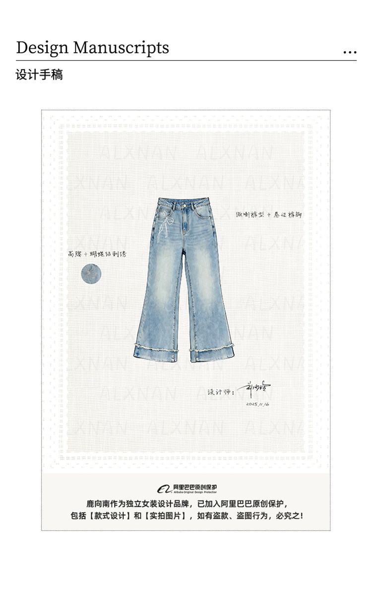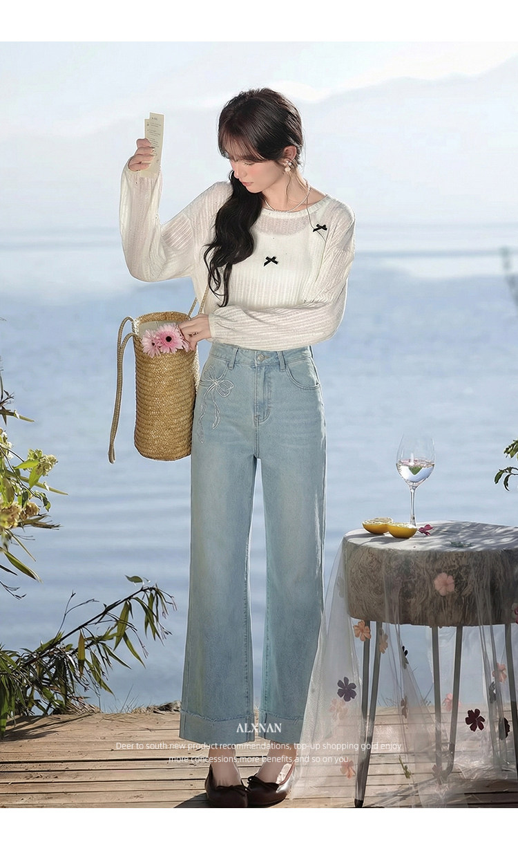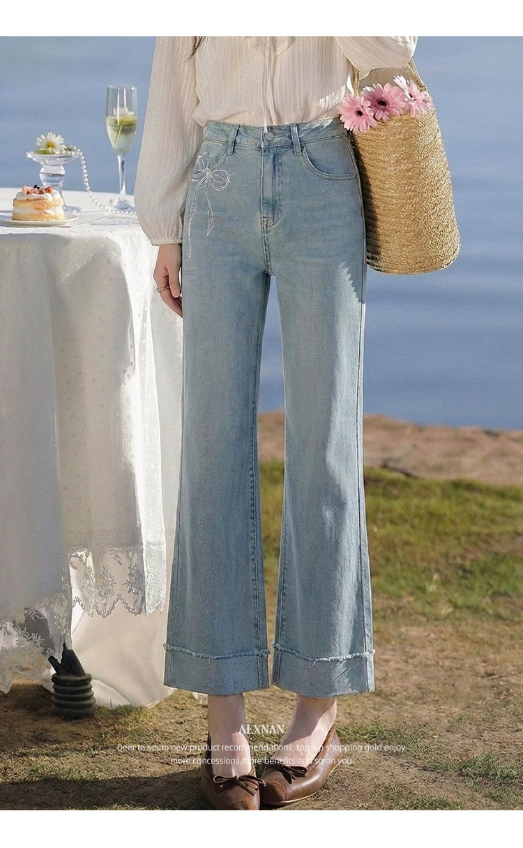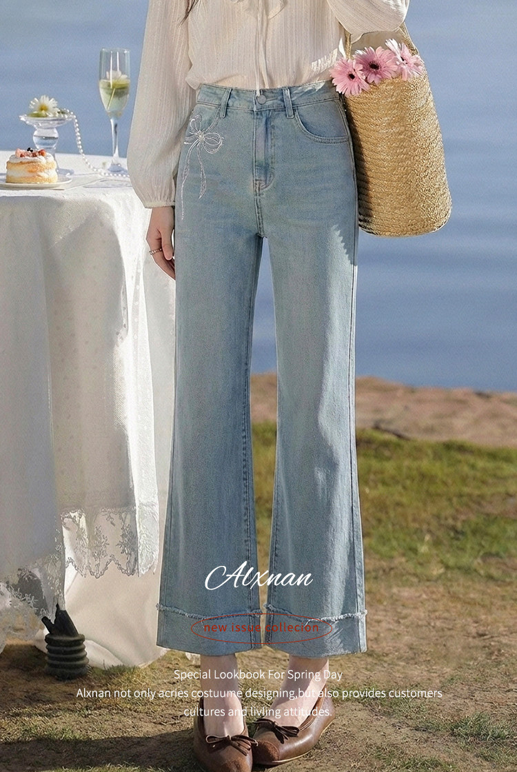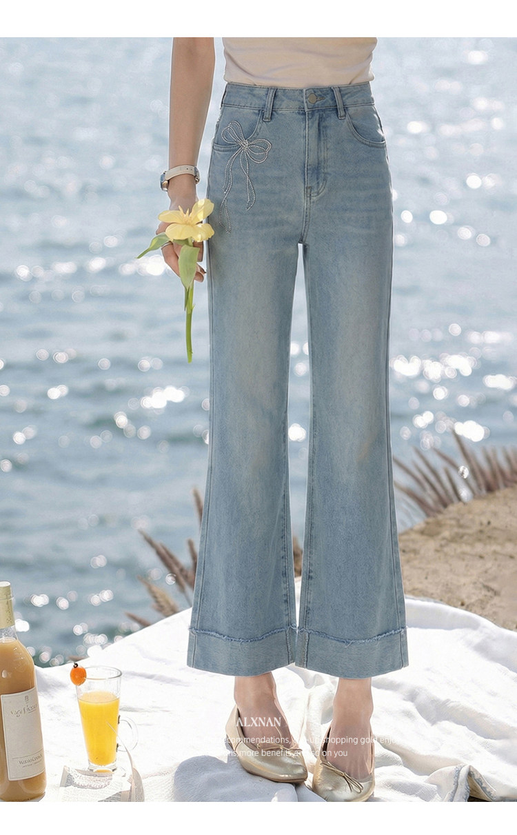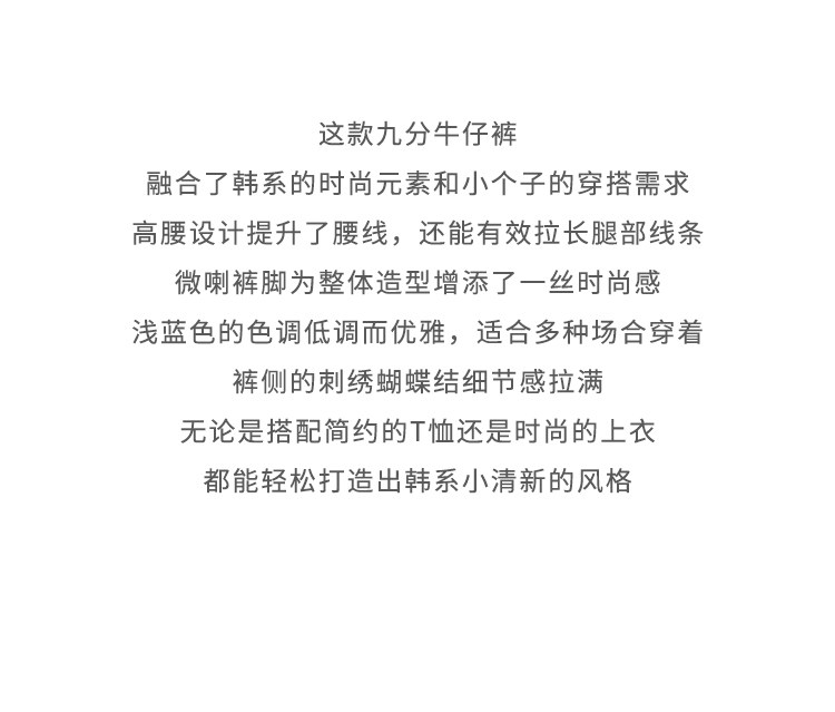 鹿向南「春野慢行」蓝色九分牛仔裤女春季韩系小个子高腰微喇裤子