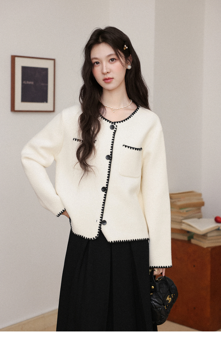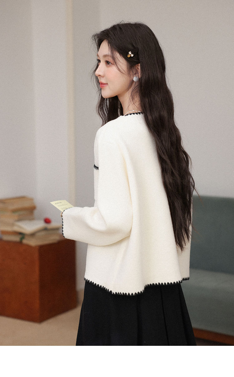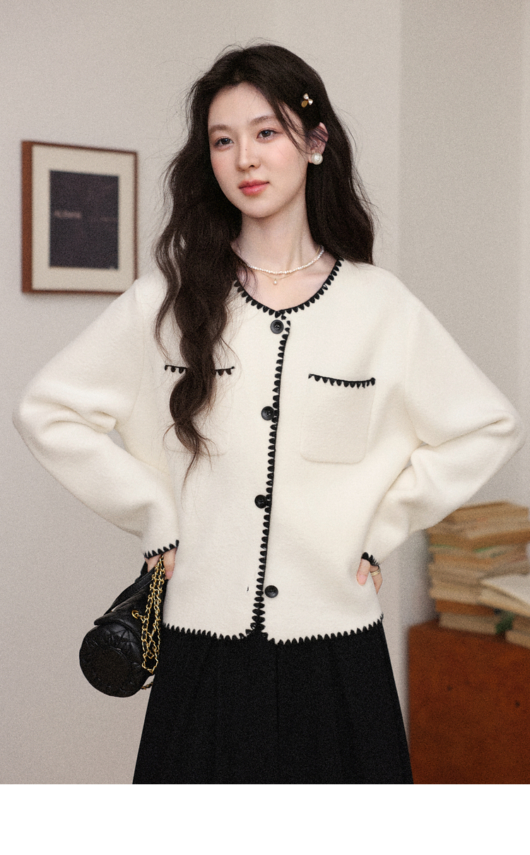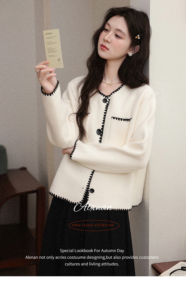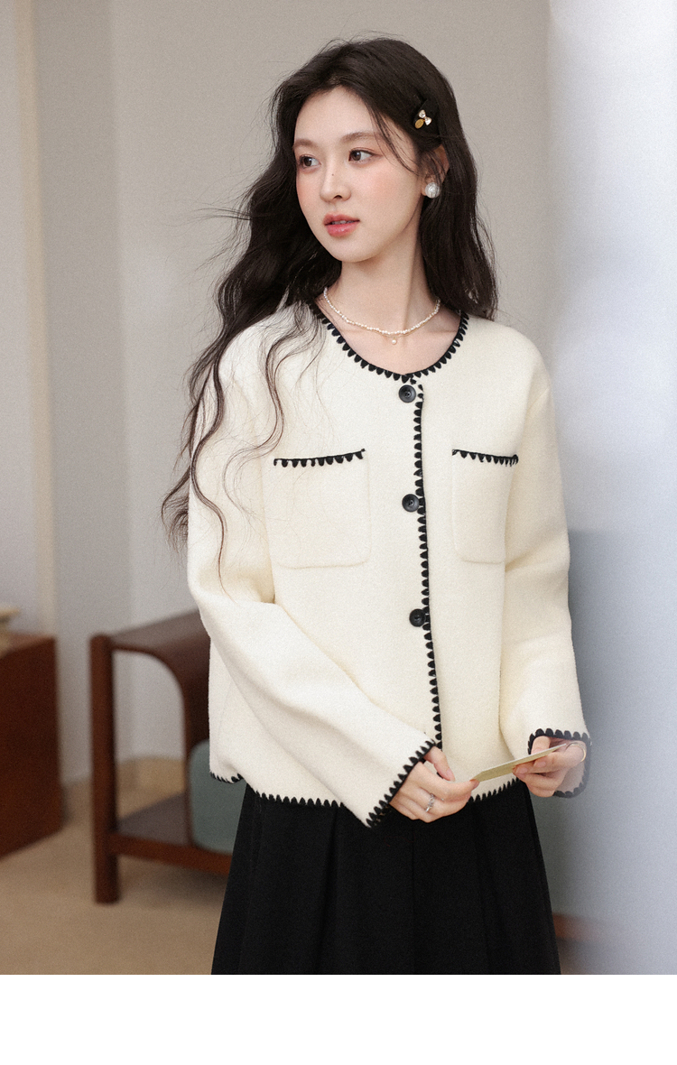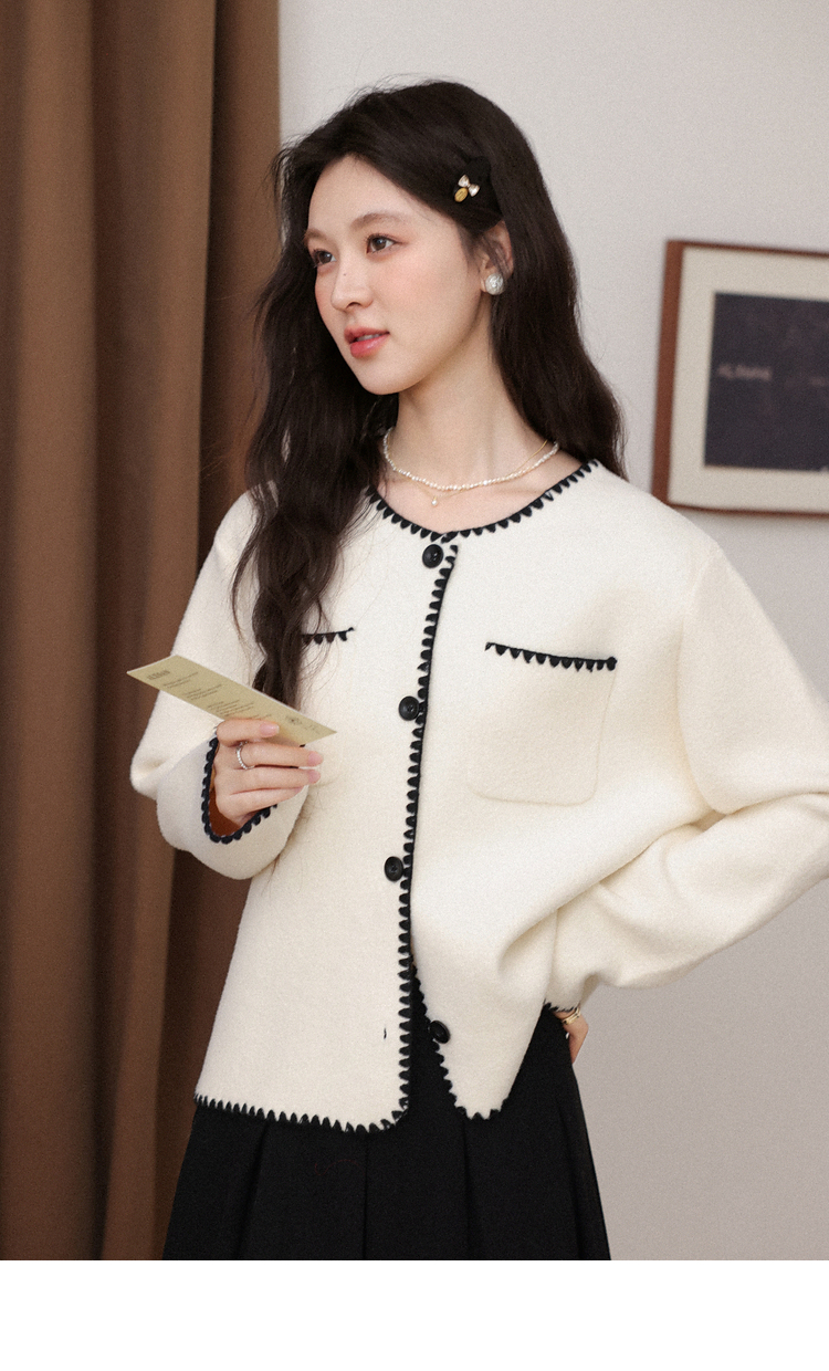 鹿向南「雅致矜柔」法式小香风毛衣女秋冬新款撞色圆领杏色短外套