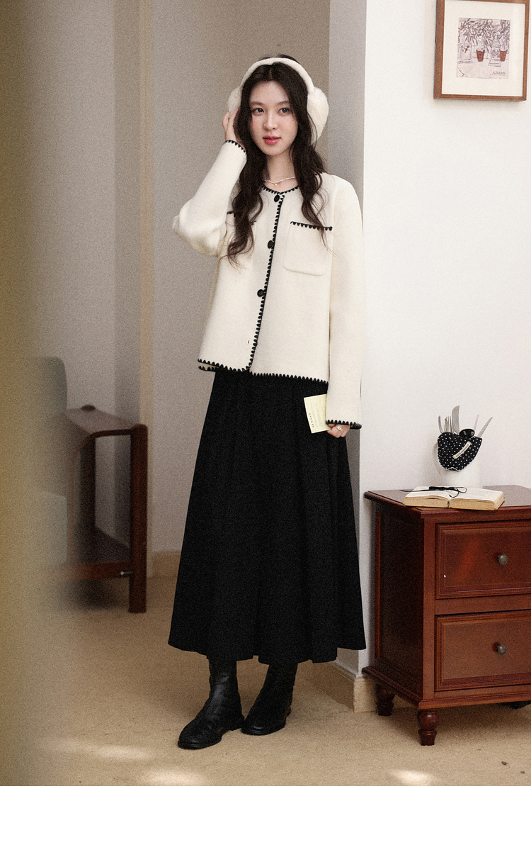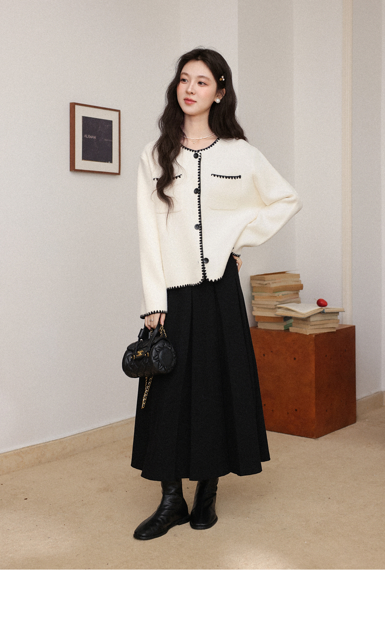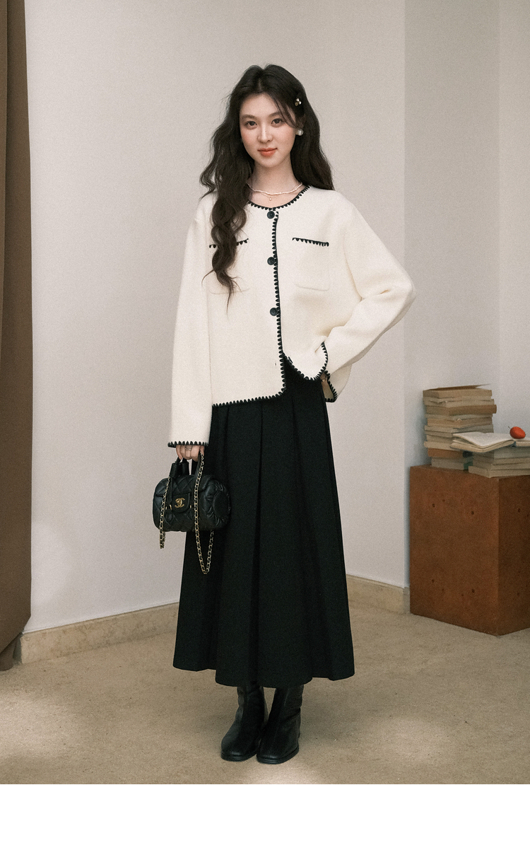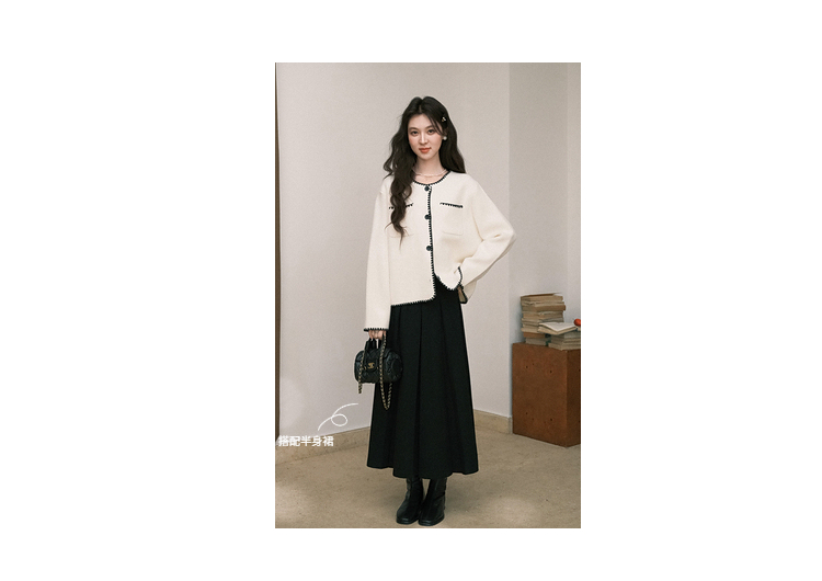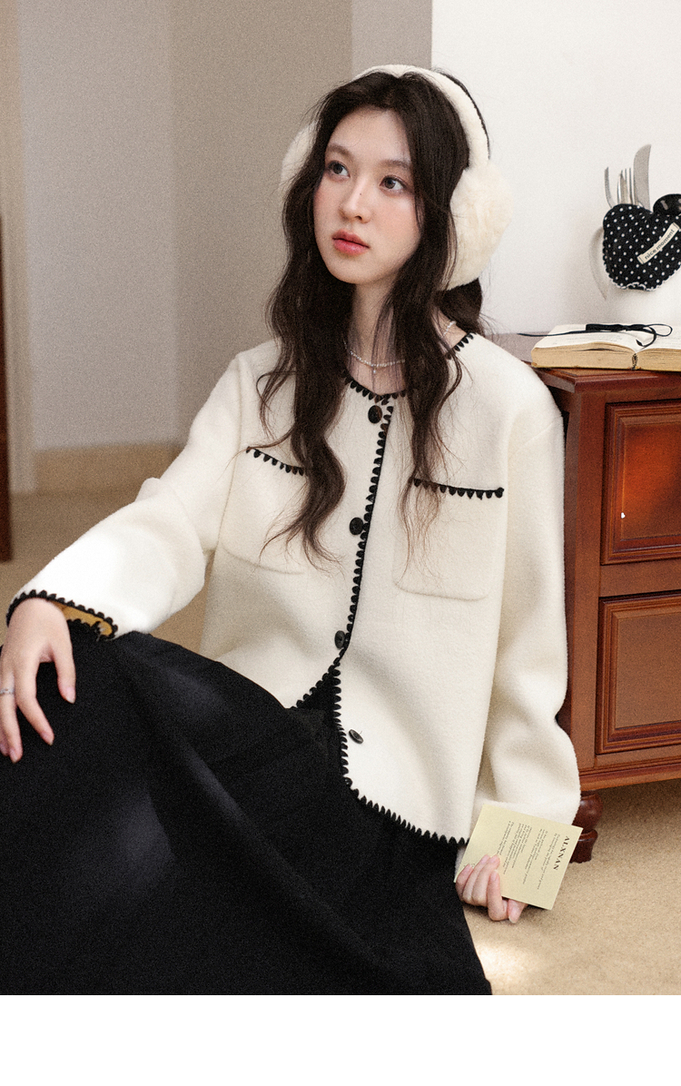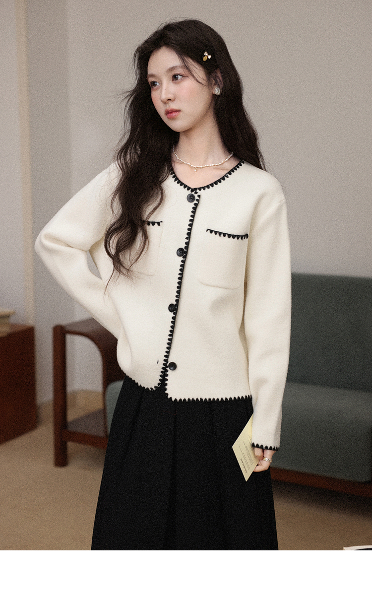 鹿向南「雅致矜柔」法式小香风毛衣女秋冬新款撞色圆领杏色短外套