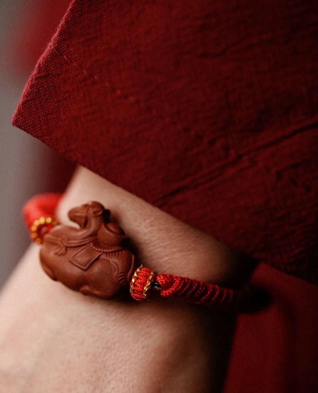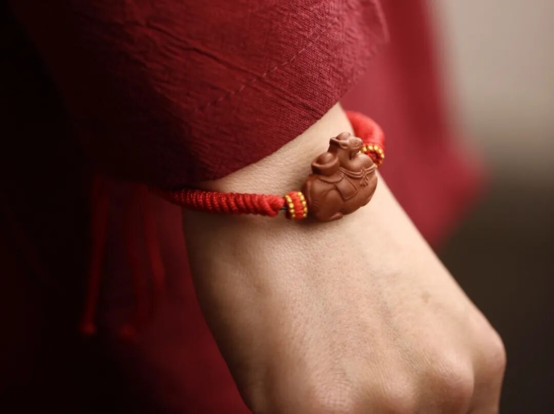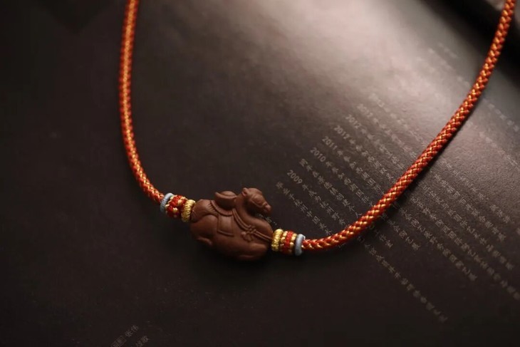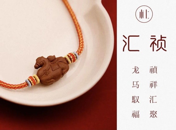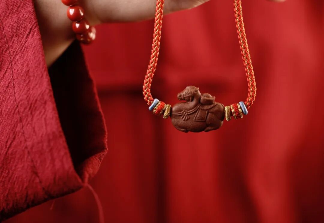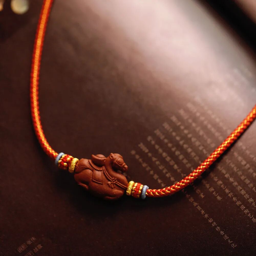 这串财马项链,以红金龙鳞绳编织,龙鳞纹路错落有致,红如丹曦映福,金似瑞光耀,有“龙马驭福来” 的吉祥寓意,尽显非遗手工的精巧质感。