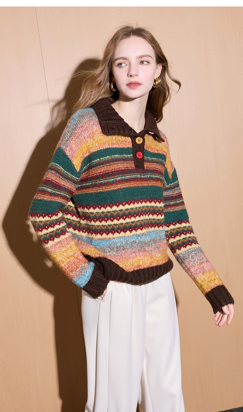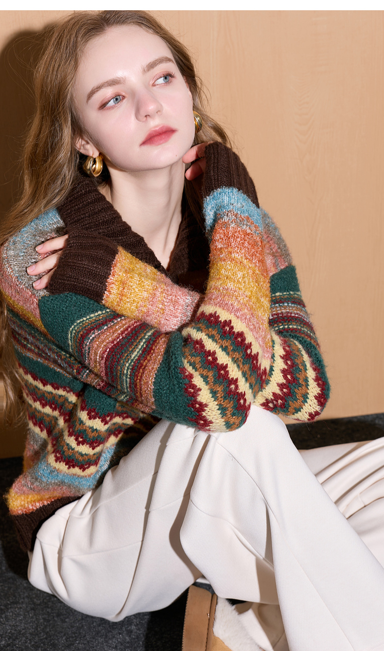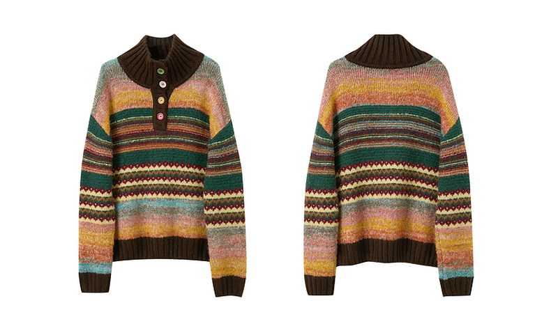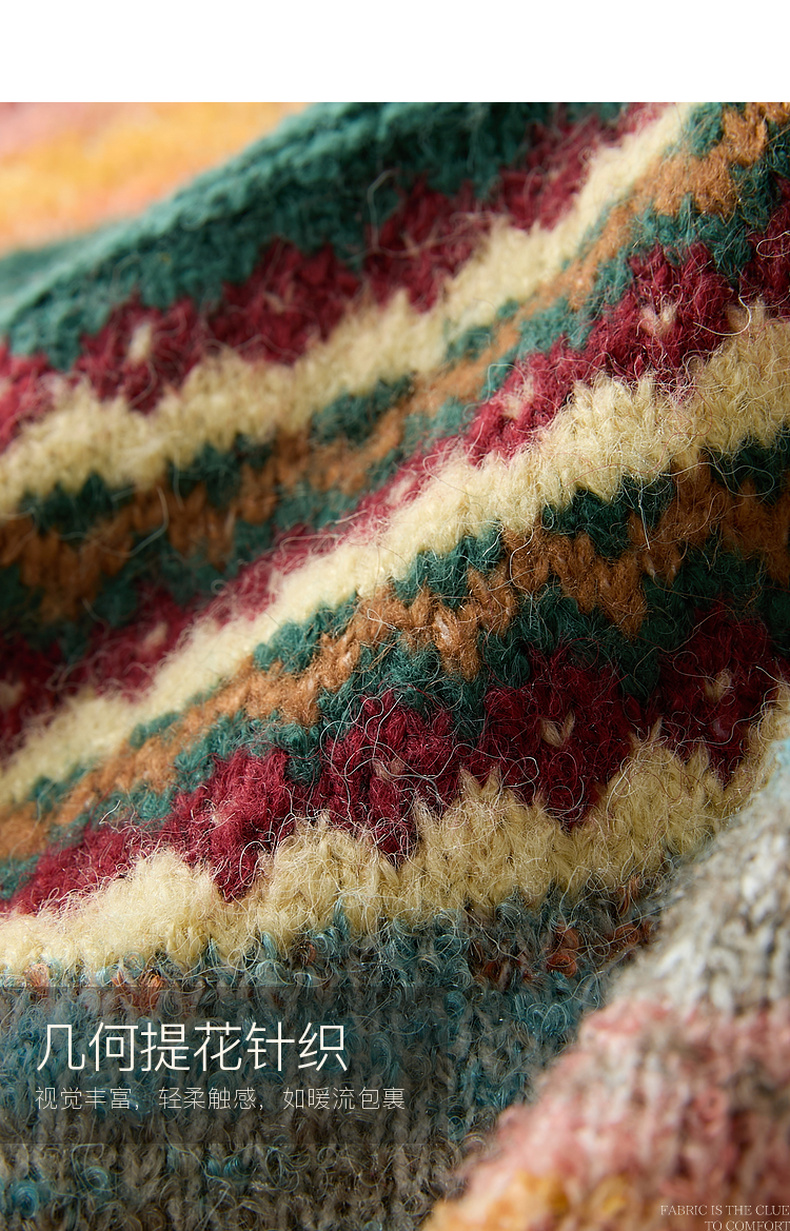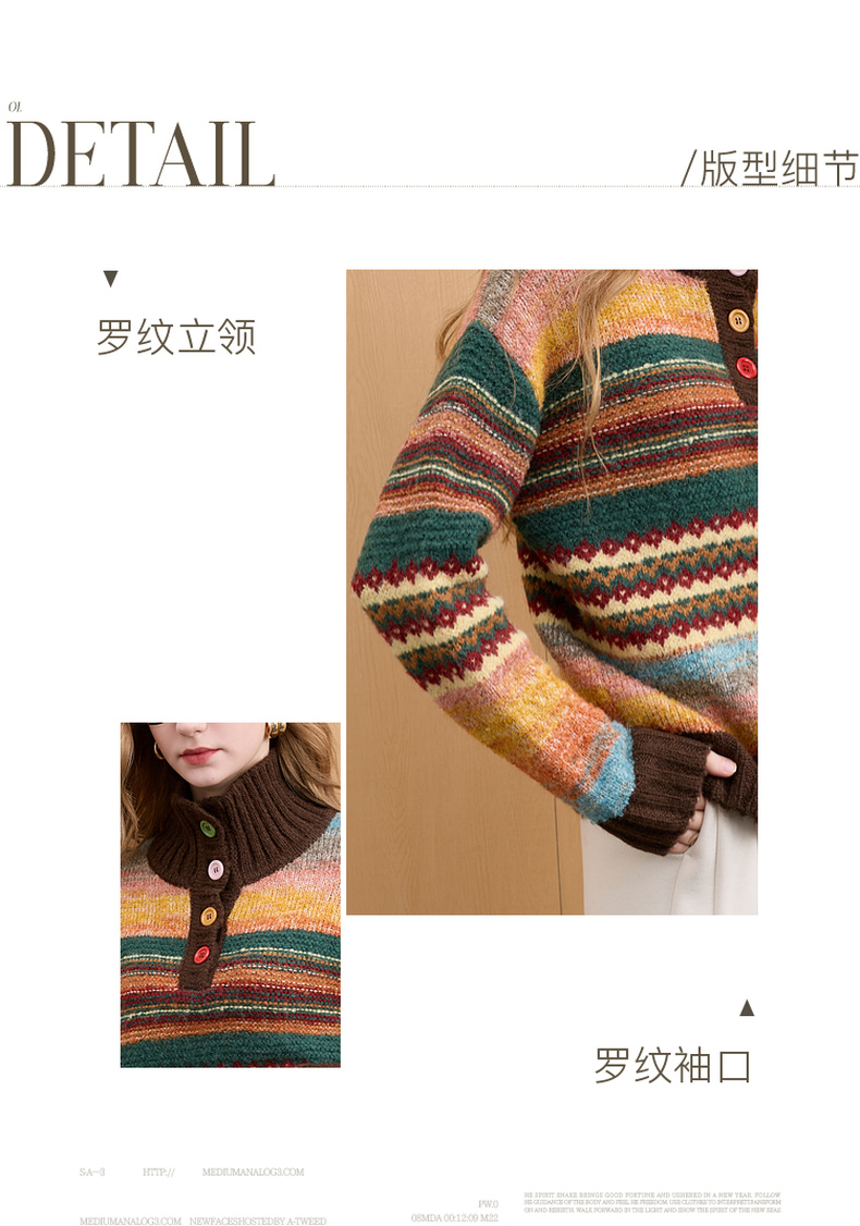 【奶油针织】三彩2025冬季新款条纹提花针织衫宽松长袖立领复古套头毛衫M
