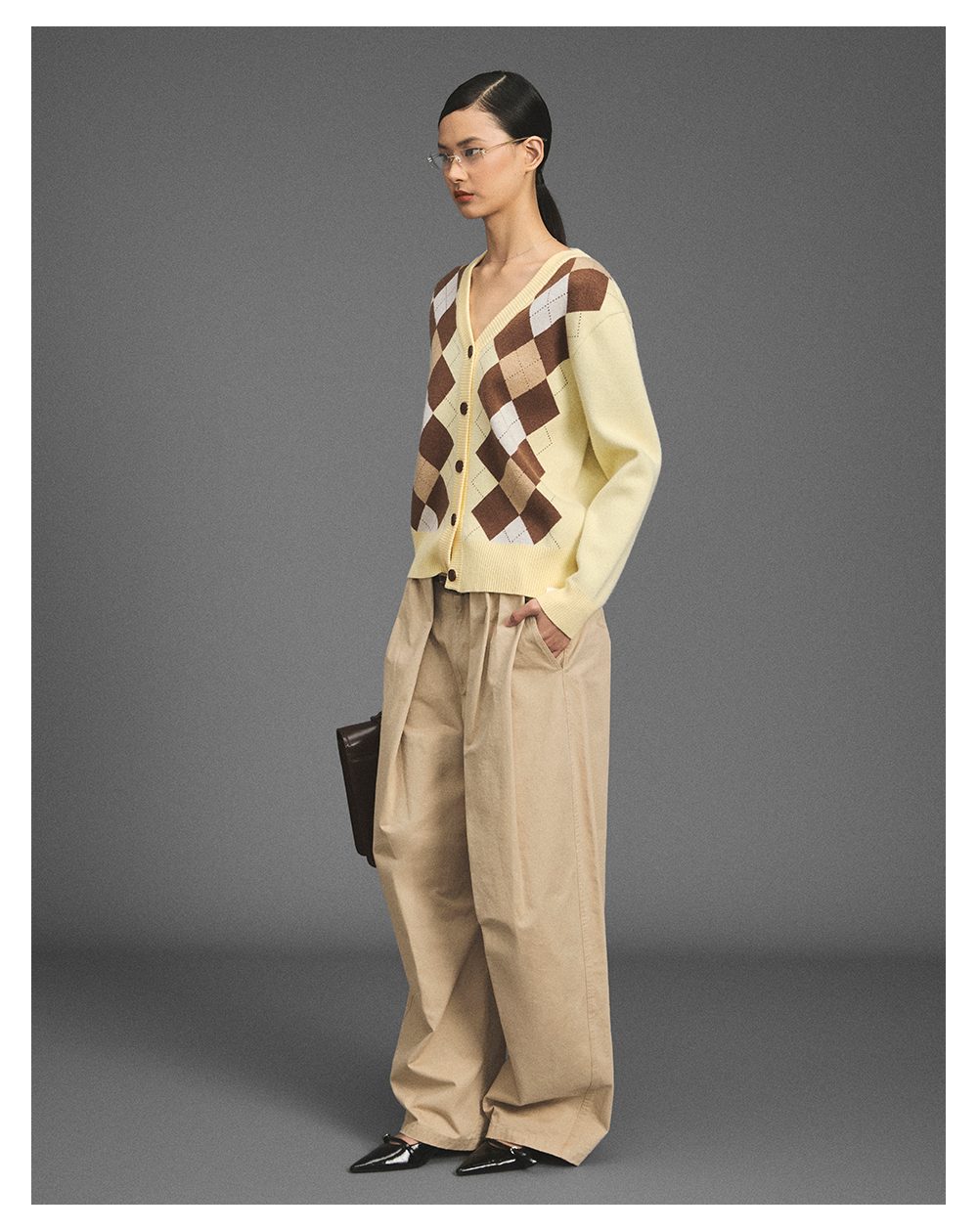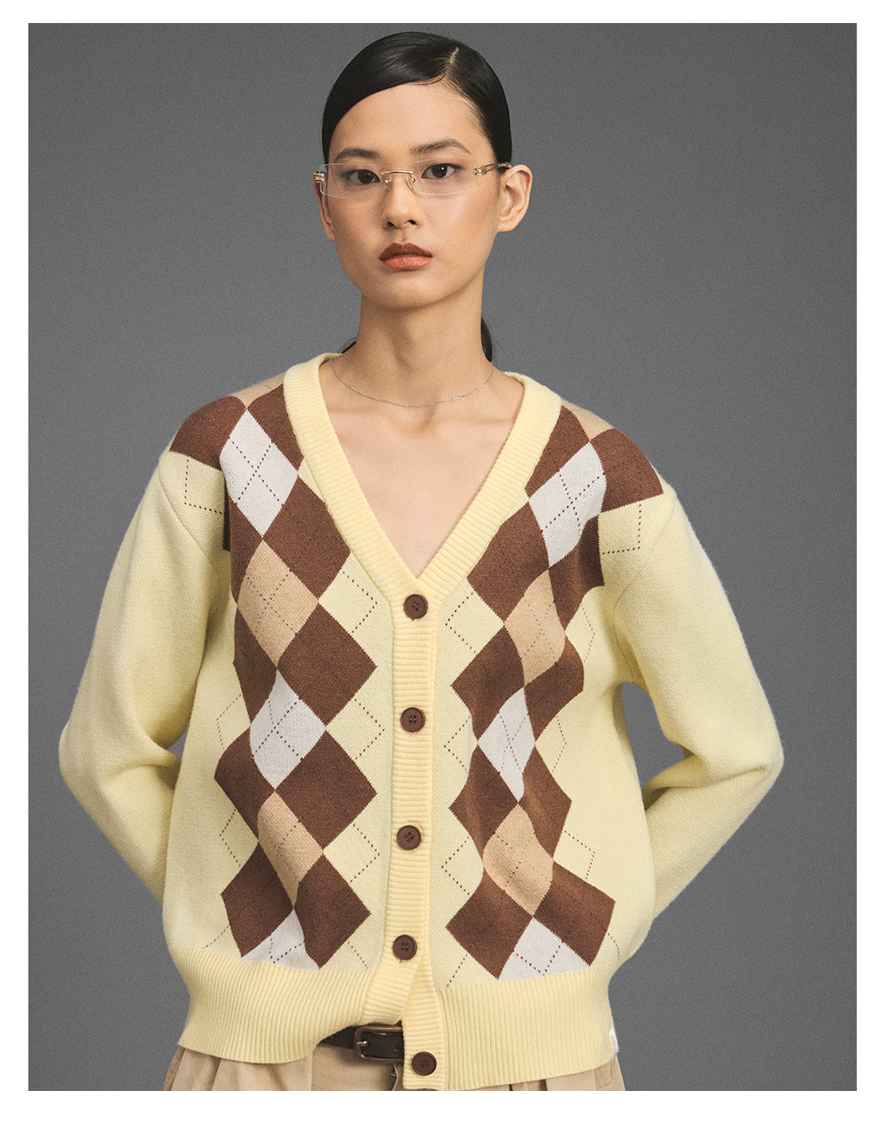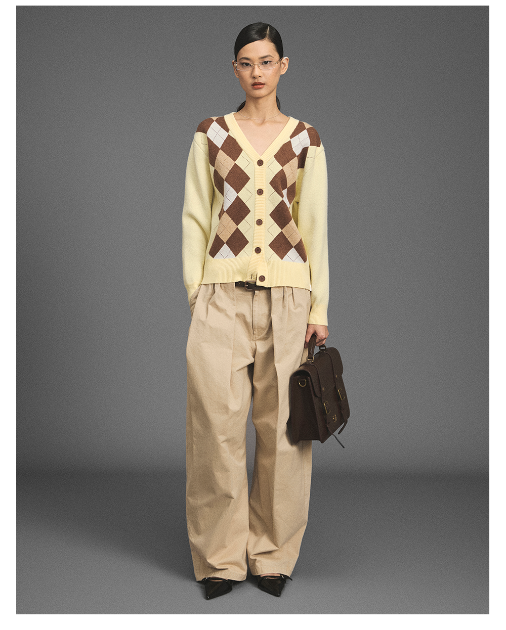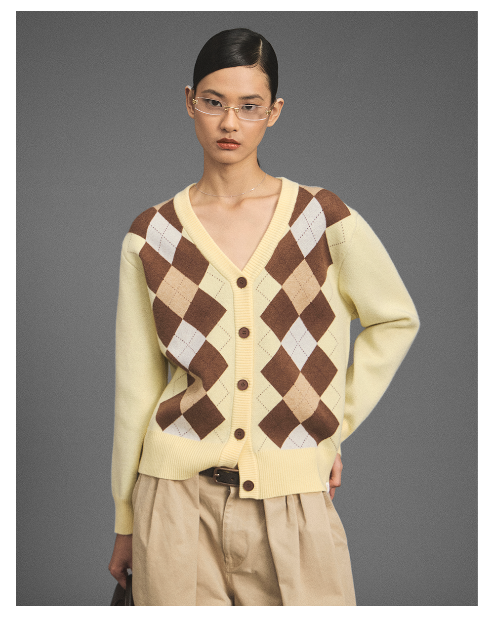 GOODBAI新款复古学院风V领格纹针织长袖开衫女
