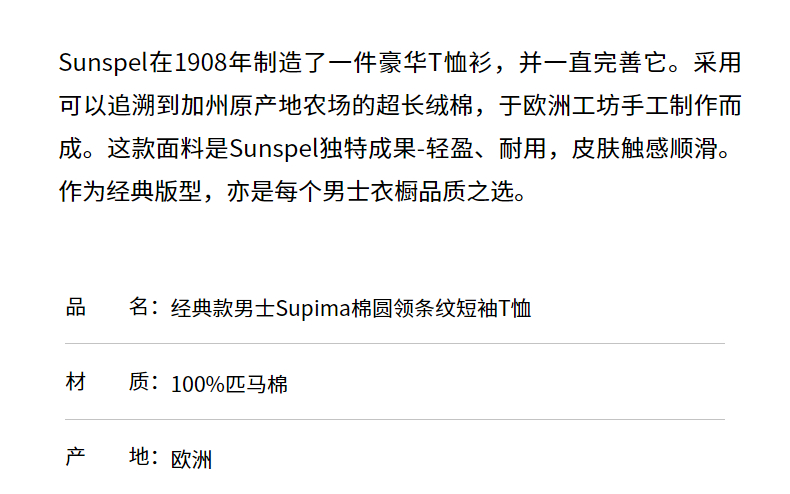 - Sunspel 成立于 1860 年,是具有现代气息的创新英国品牌,专注为客户提供耐穿不过时的基础款,同时满足摩登品味。服饰采用优质的、可追本溯源的原材料 —— 棉、亚麻和羊毛制作。