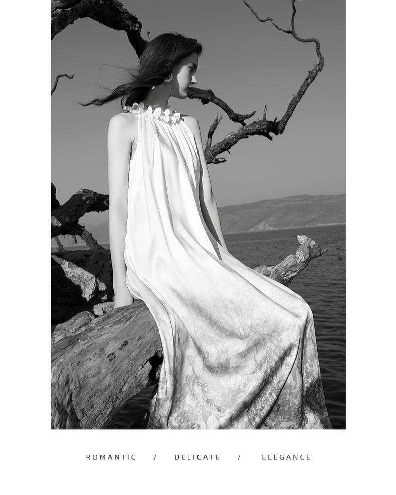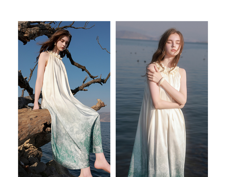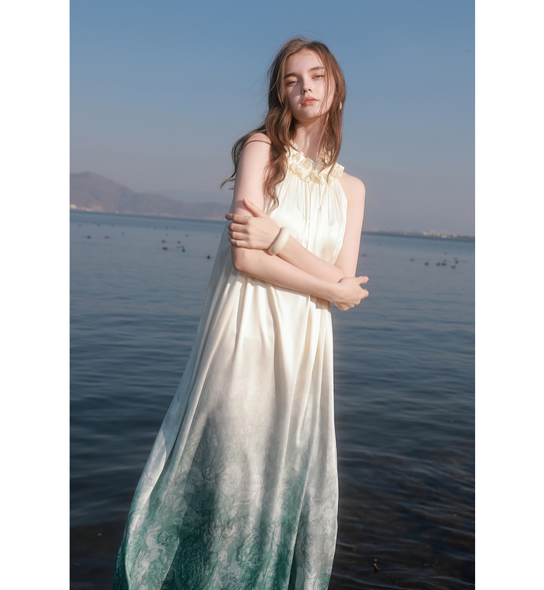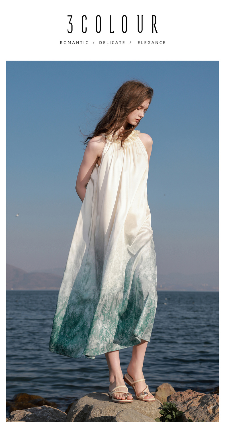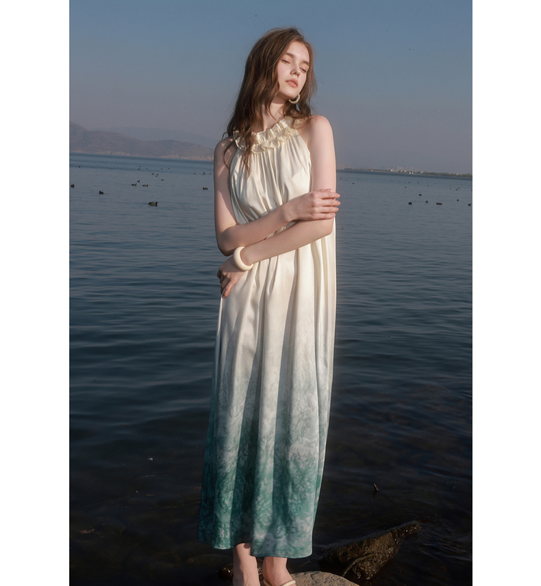 三彩2025夏季新款晕染挂脖裙木耳边连衣裙宽松长裙度假M
