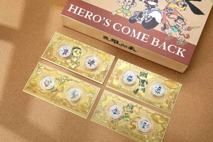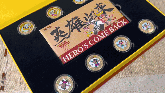 内含8枚动画英雄纪念bi:大闹天宫2枚、哪吒闹海2枚、黑猫警长2枚,葫芦兄弟2枚。