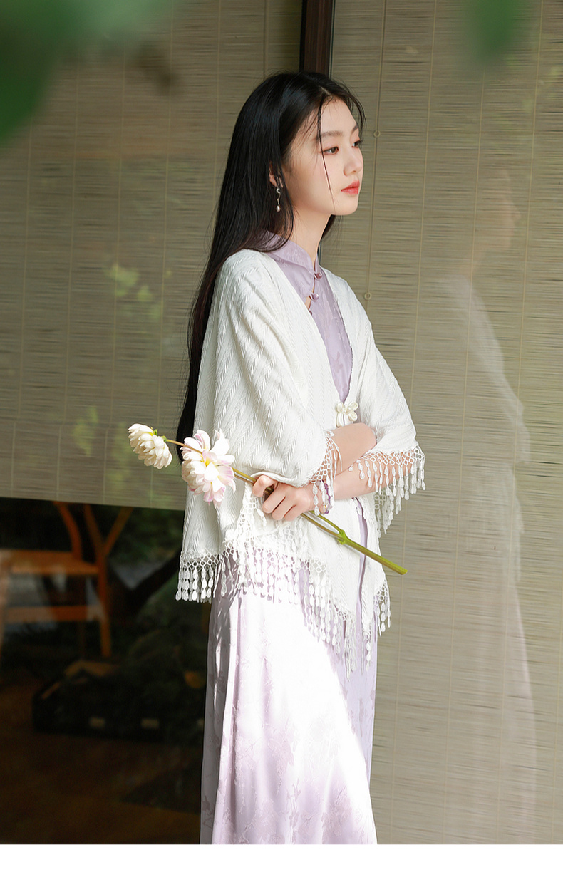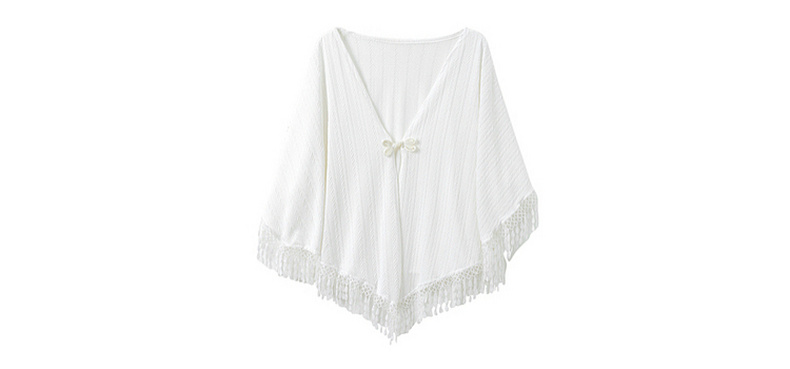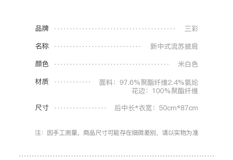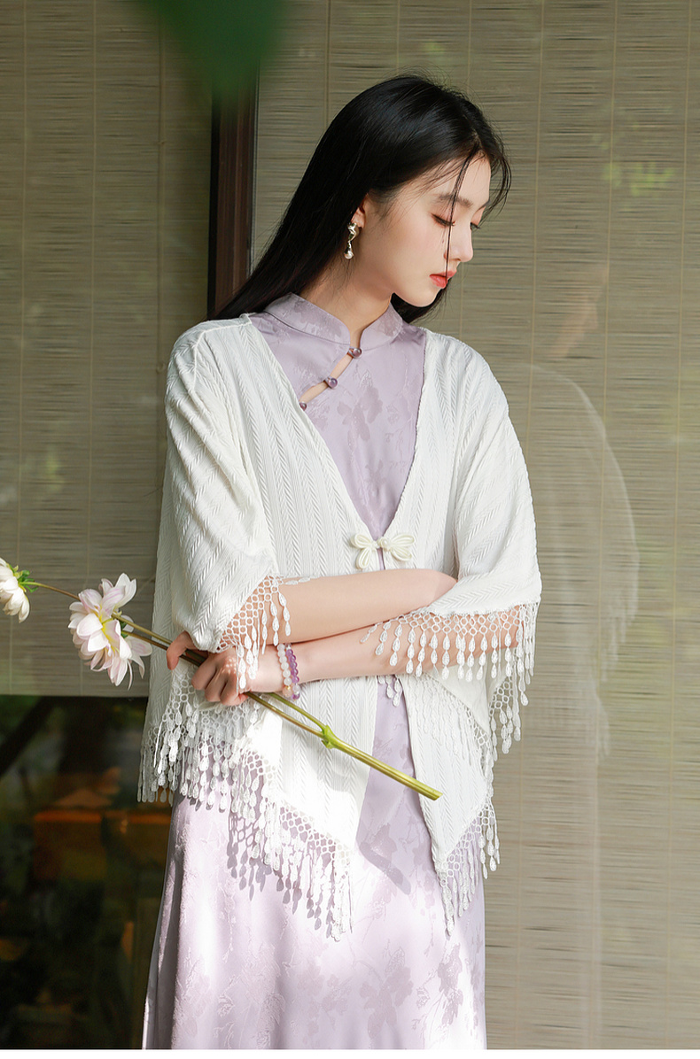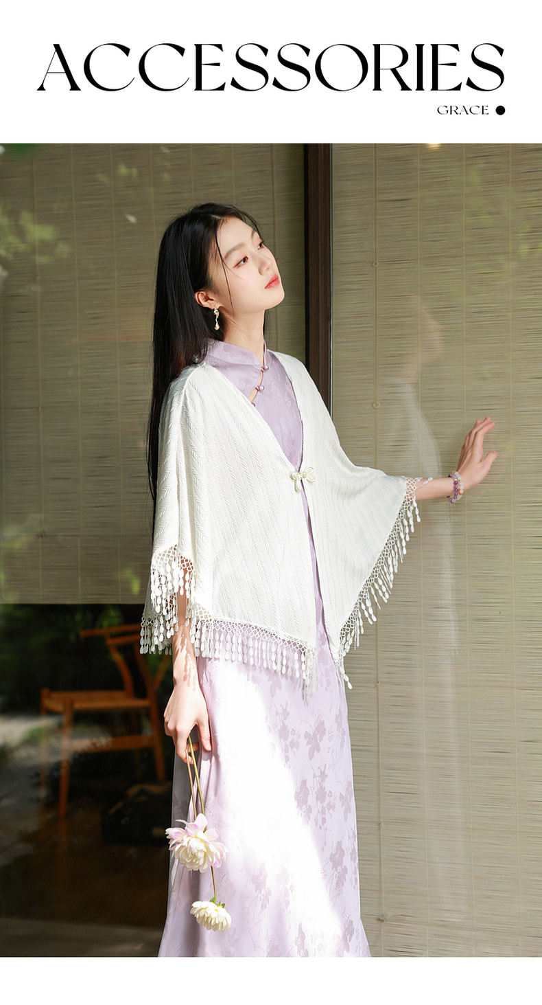 三彩2026新款蝴蝶结盘扣流苏披肩女夏米白国风穿搭外搭遮阳氛围感