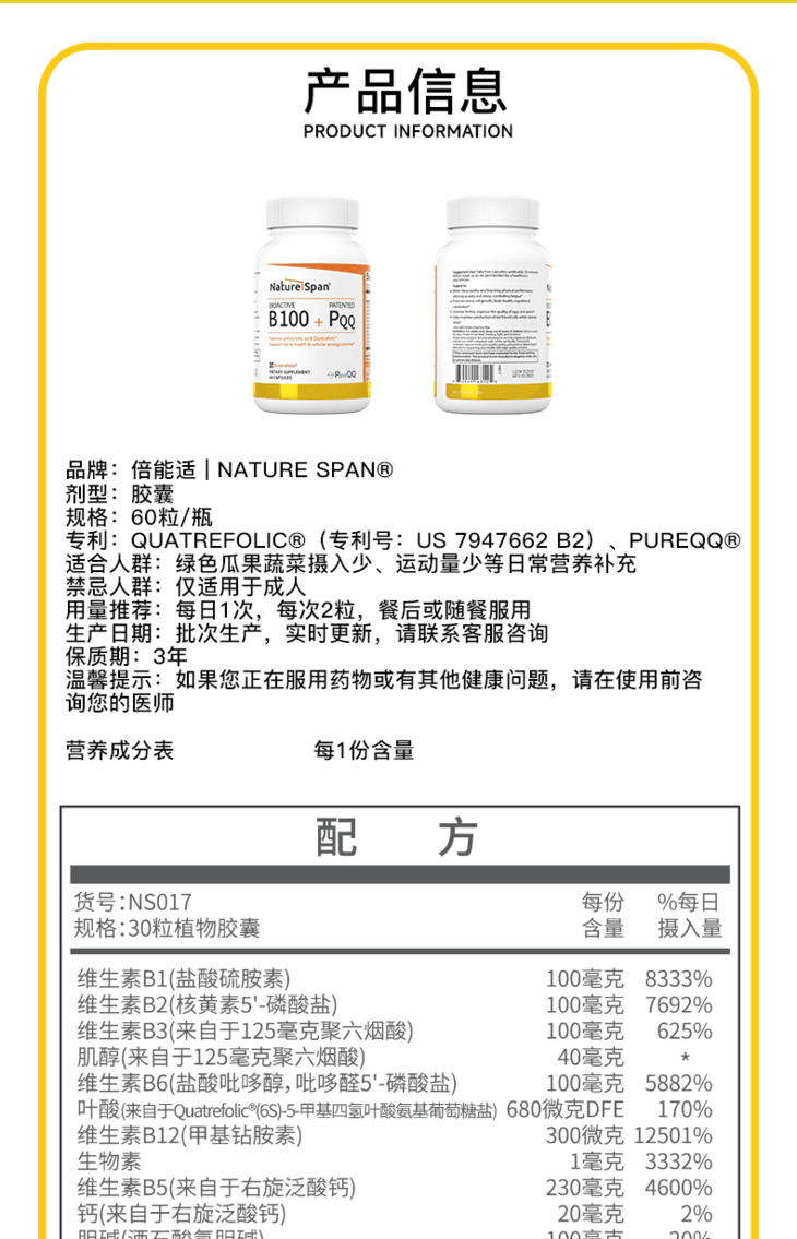 复合维生素B族特含PQQ 60粒 NATURESPAN倍能适