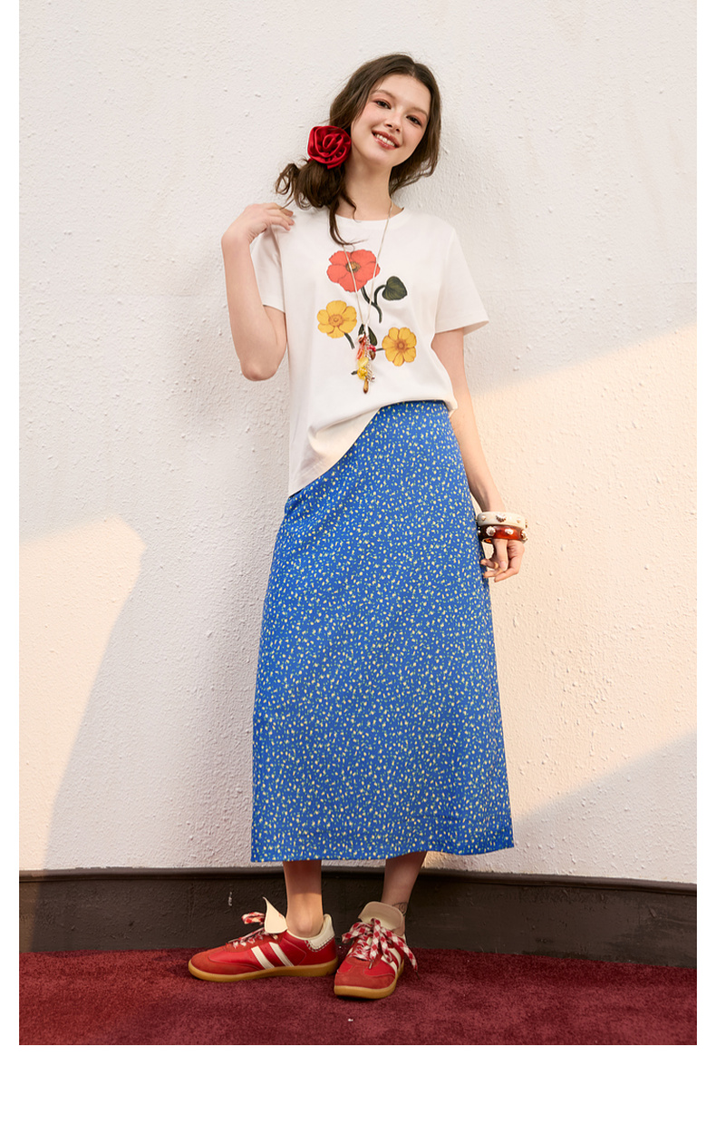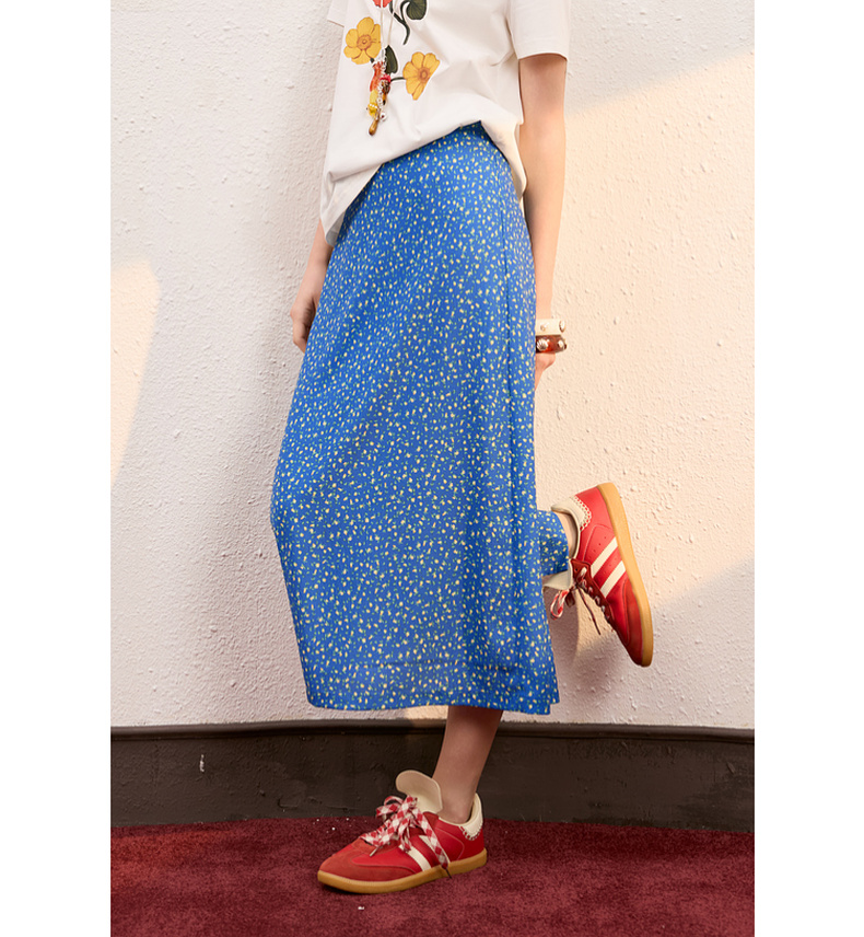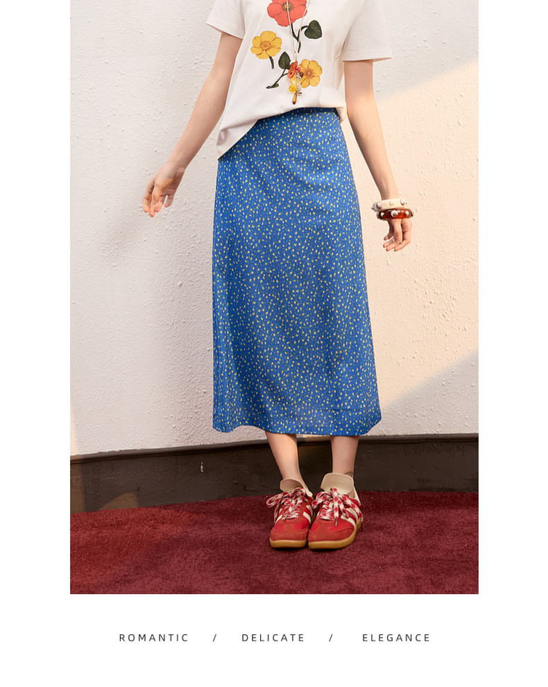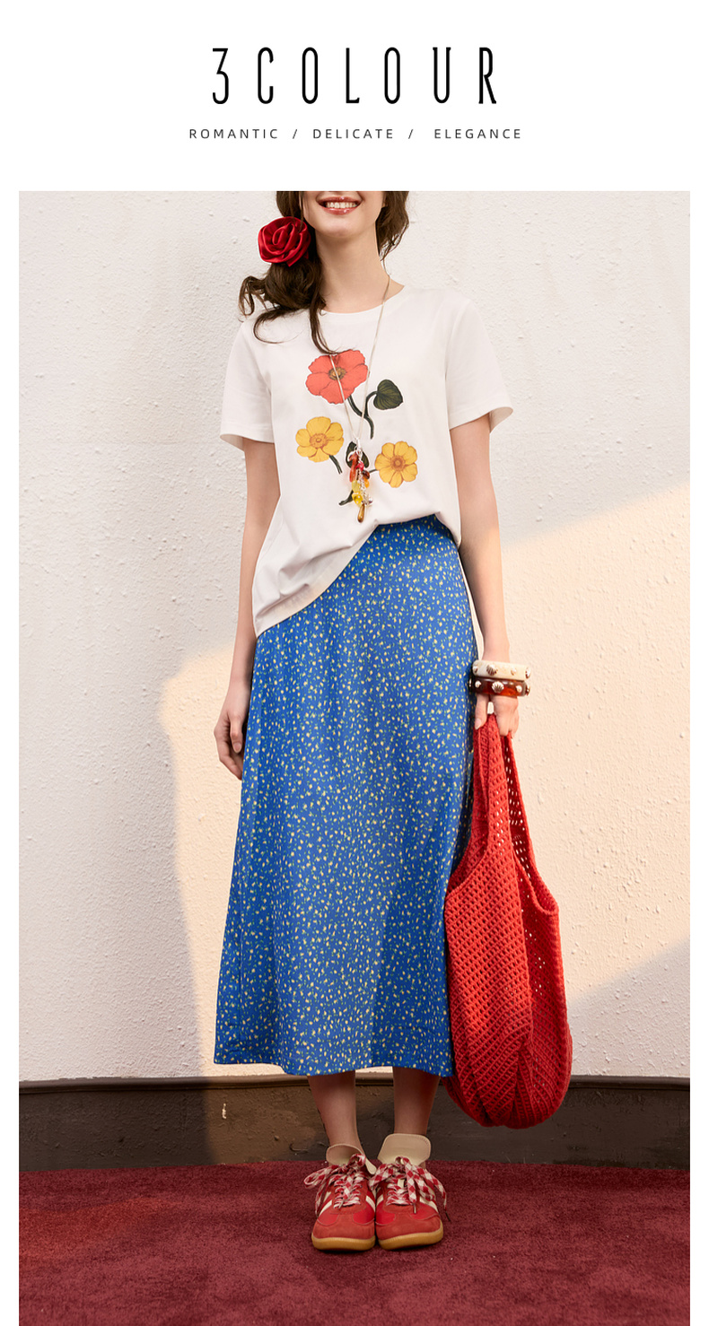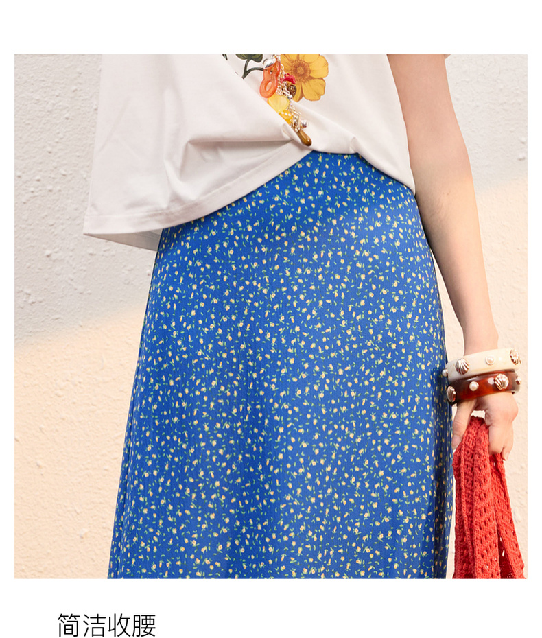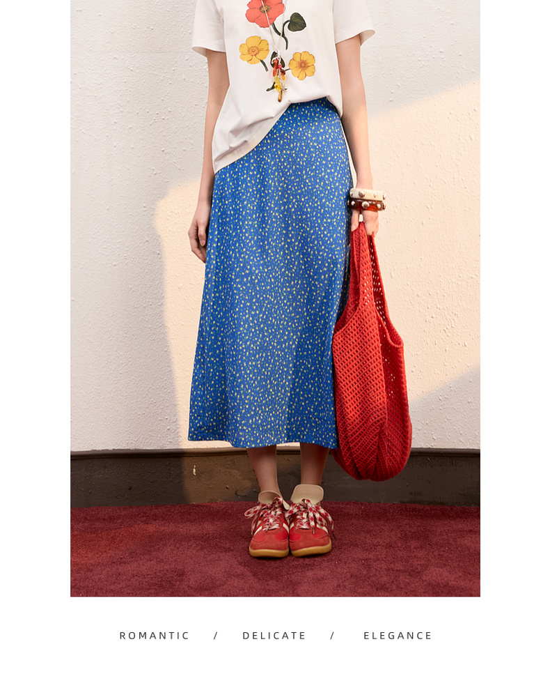 三彩2025秋季新款收腰碎花半身裙简洁修身A字裙长裙气质M