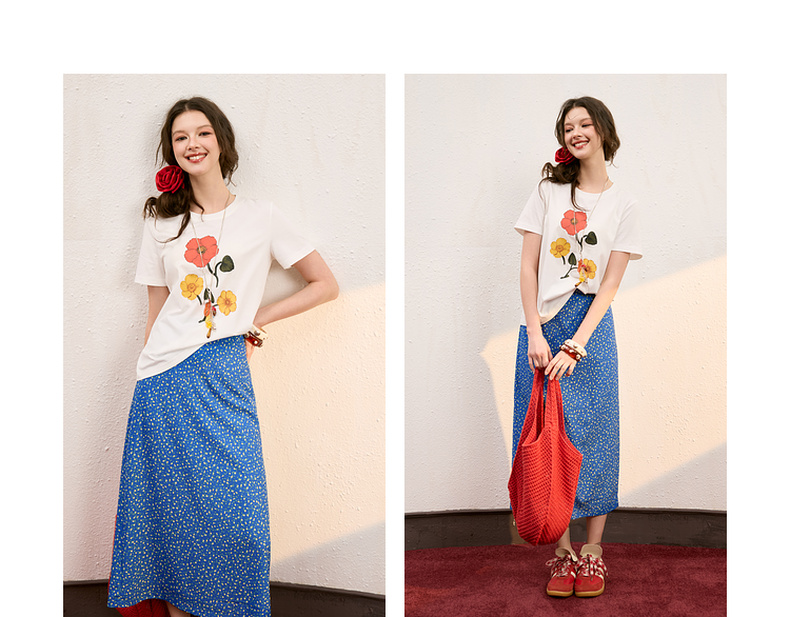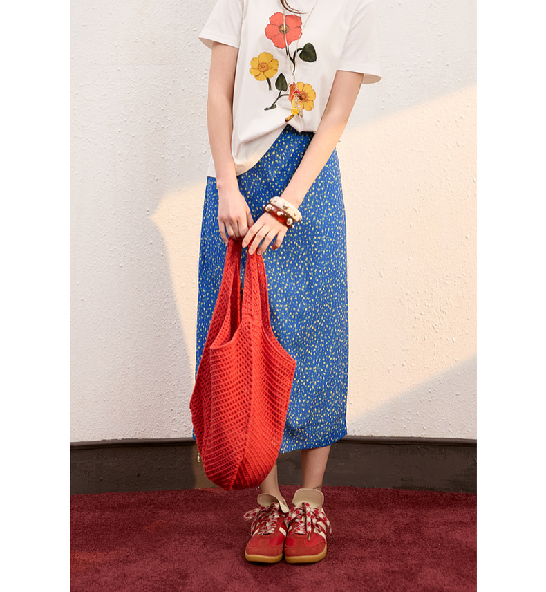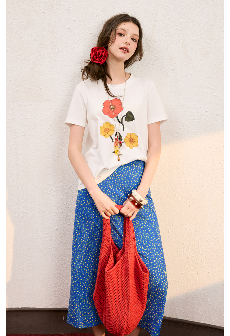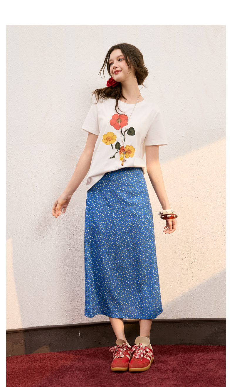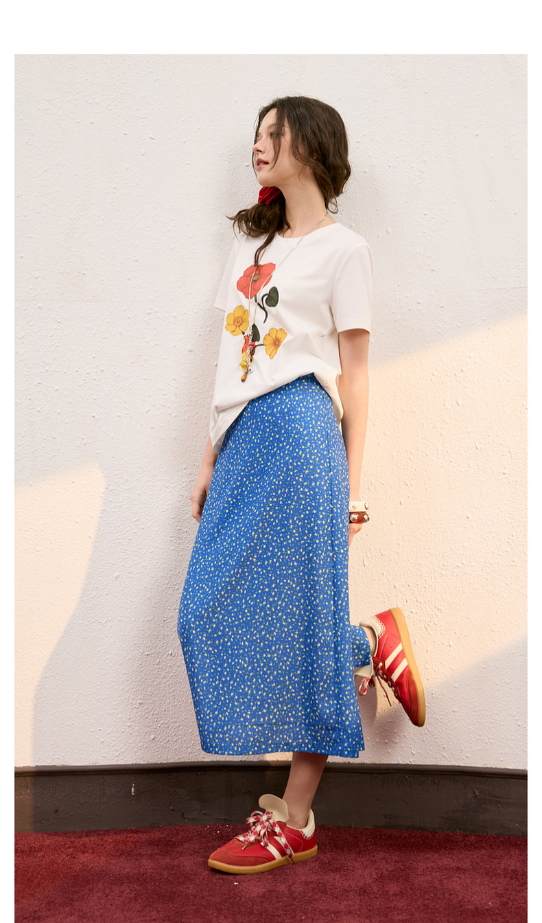 三彩2025秋季新款收腰碎花半身裙简洁修身A字裙长裙气质M