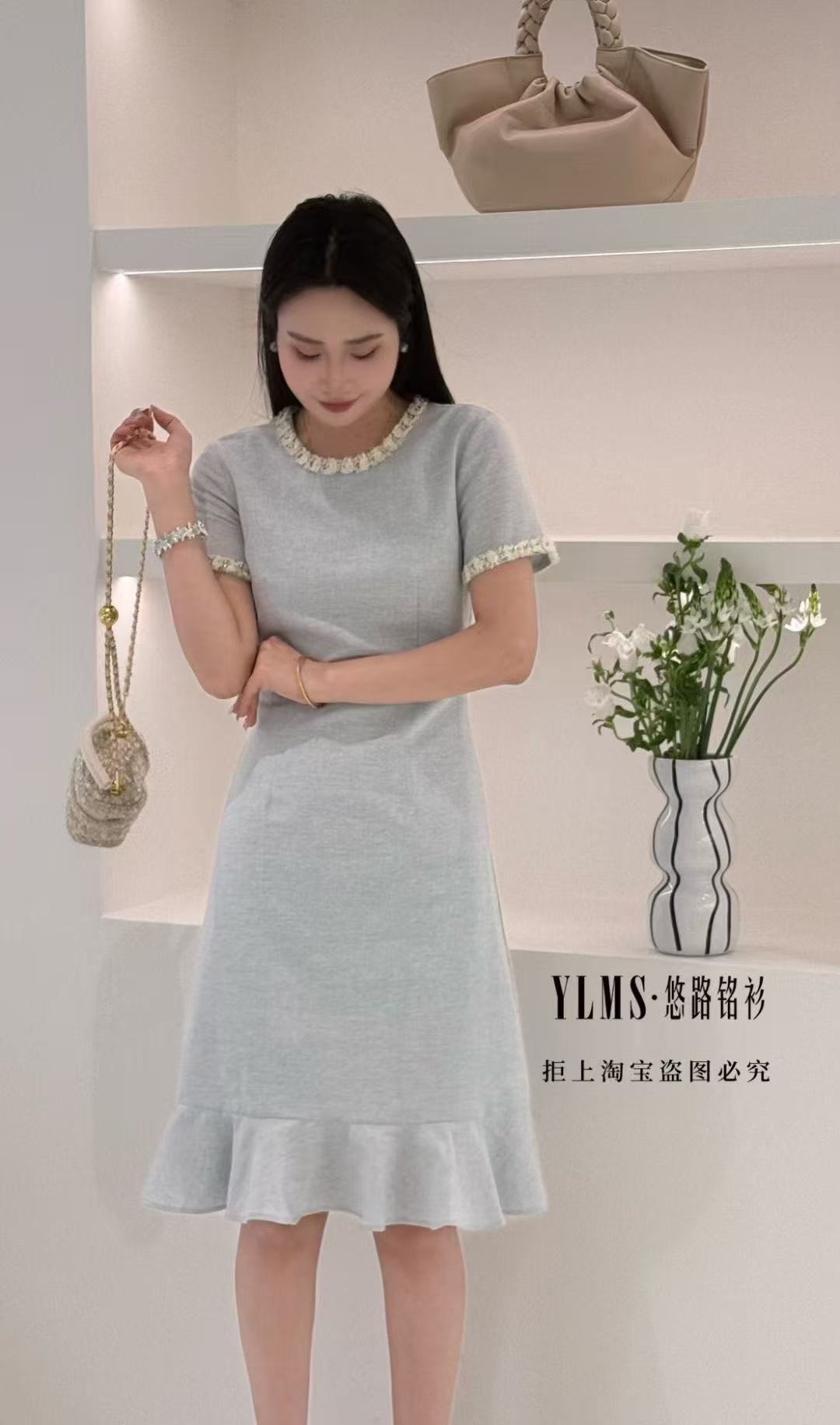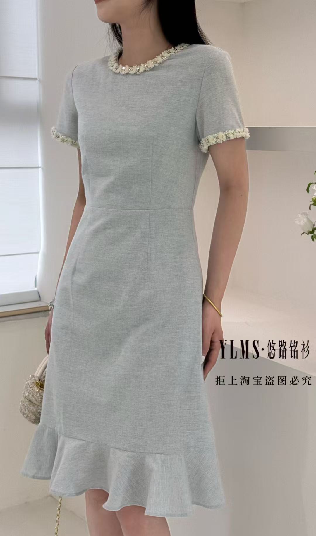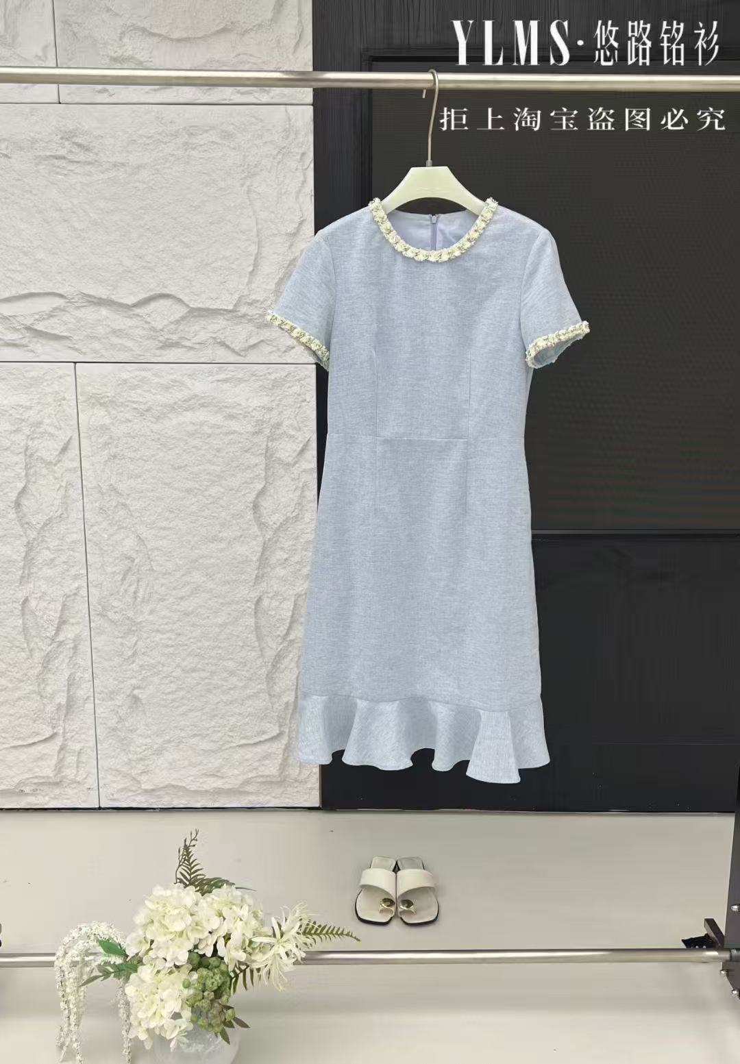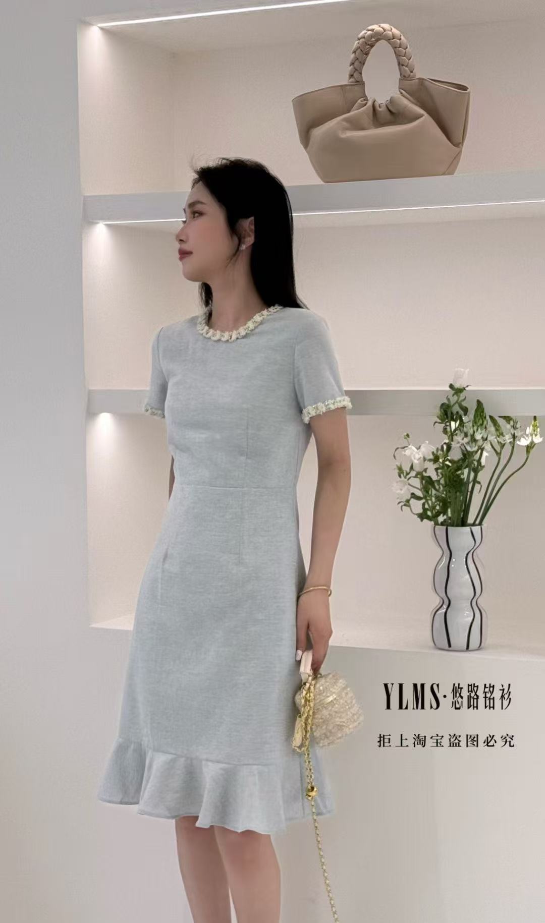YLMS·悠路铭衫 夏款气质纯亚麻淡蓝圆领短袖连衣裙